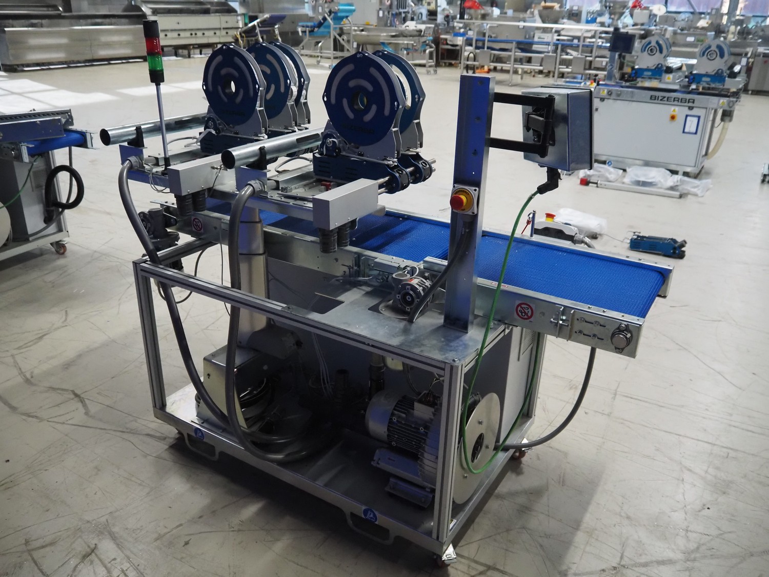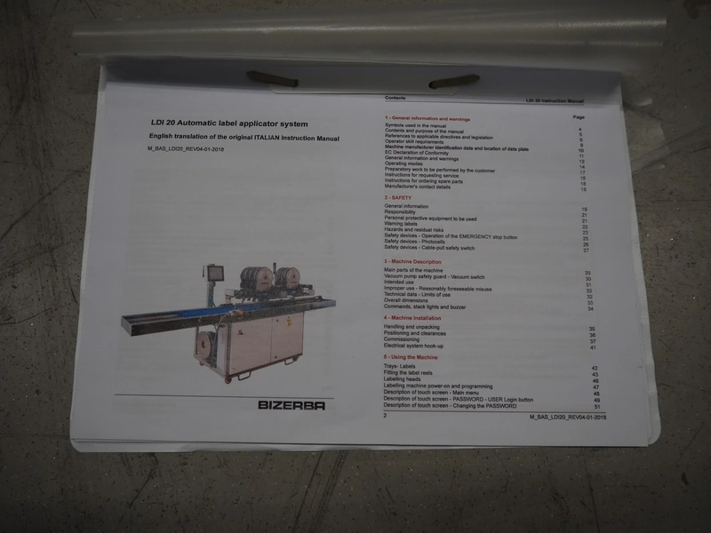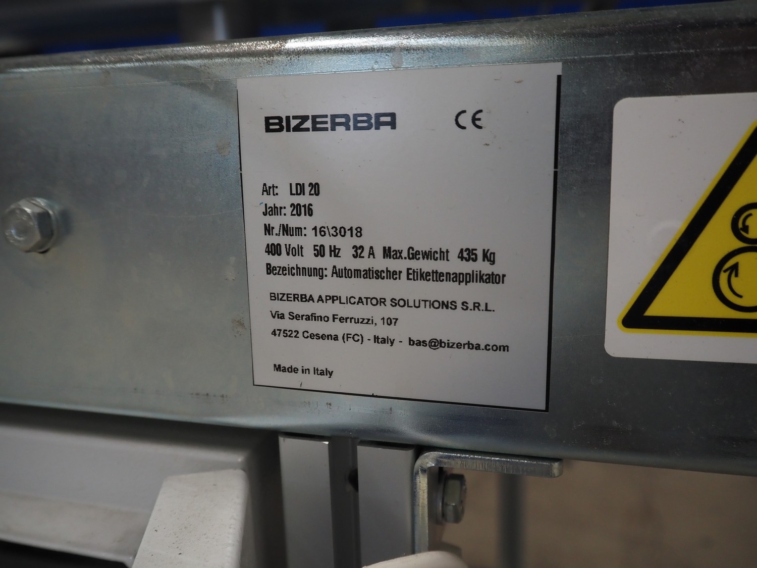 Bizerba labeller, 5 cassettes with labels, type: LDI 20, number: 16/3018, year of construction: 2016, 400 V, 50 Hz, 32 A, weight: 435 kg, plastic mesh belt, belt width: 400 mm, total dimensions: 2000 mm x 940 mm x 1510 mm. Including 2 extra cassettes. Technical condition unknown.