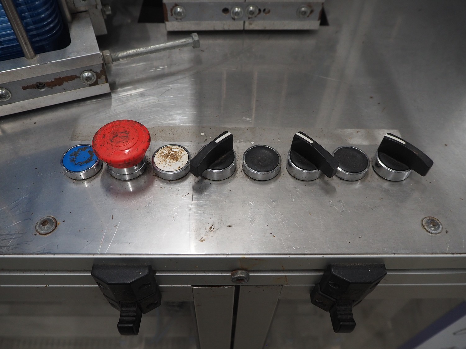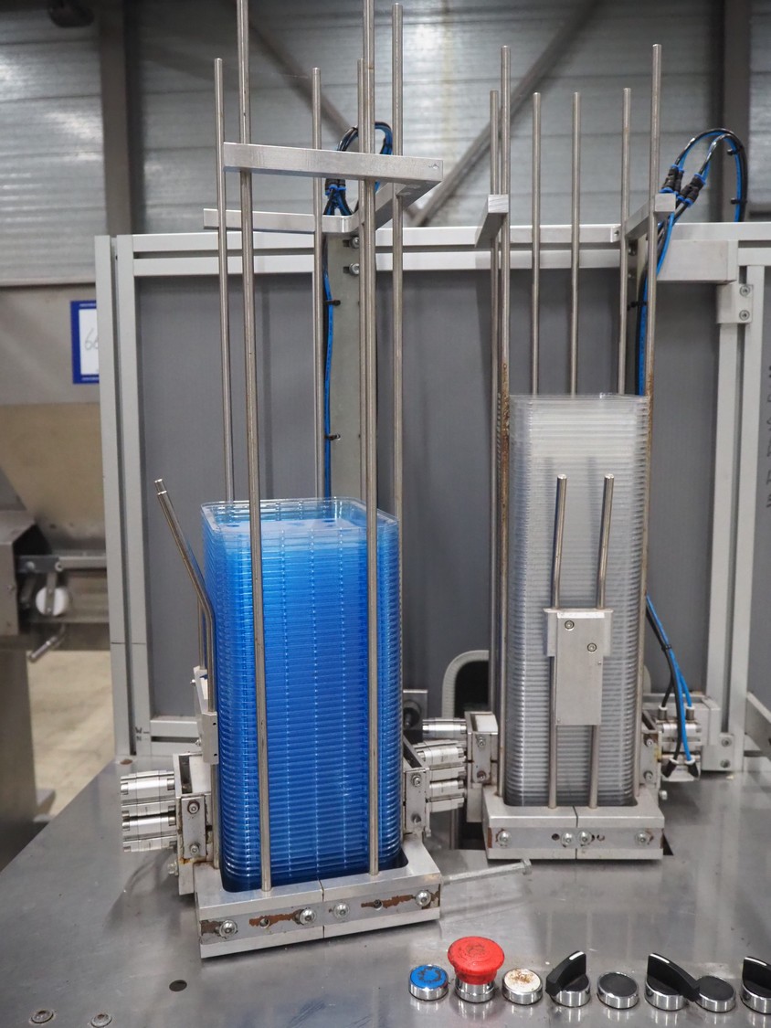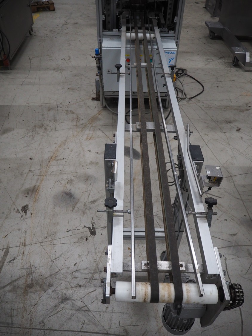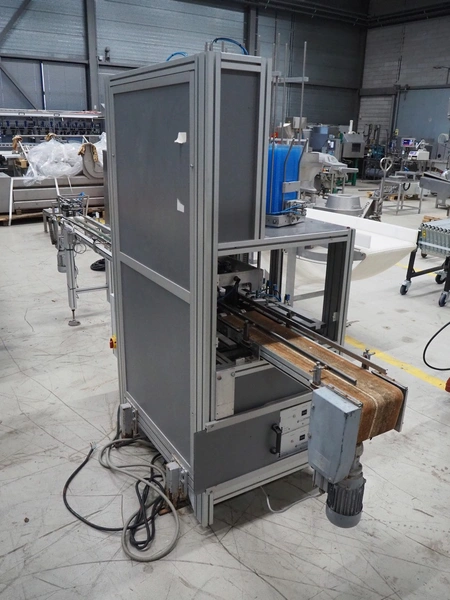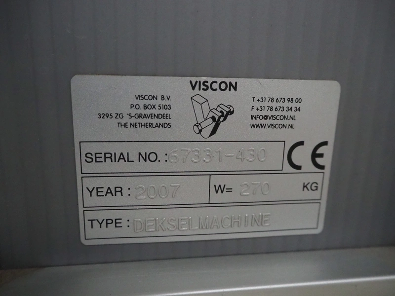 Viscon lid applicator, type: Dekselmachine, serial number 67331-430, year of construction: 2007, weight: 270 kg, plastic belt, belt width: 195 mm, lid size: 120 mm x 140 mm / 190 mm x 150 mm, total dimensions: 3800 mm x 1000 mmx 2000 mm.