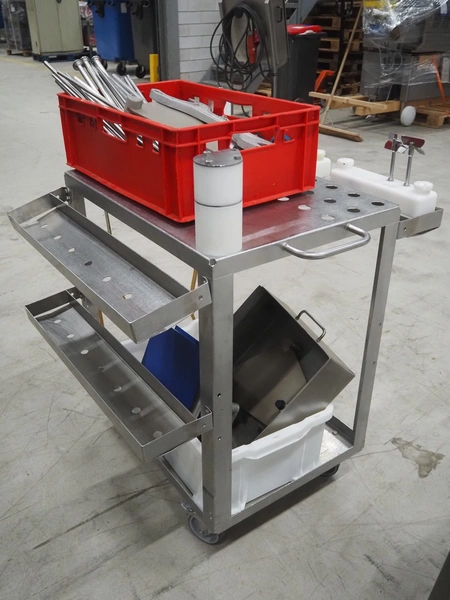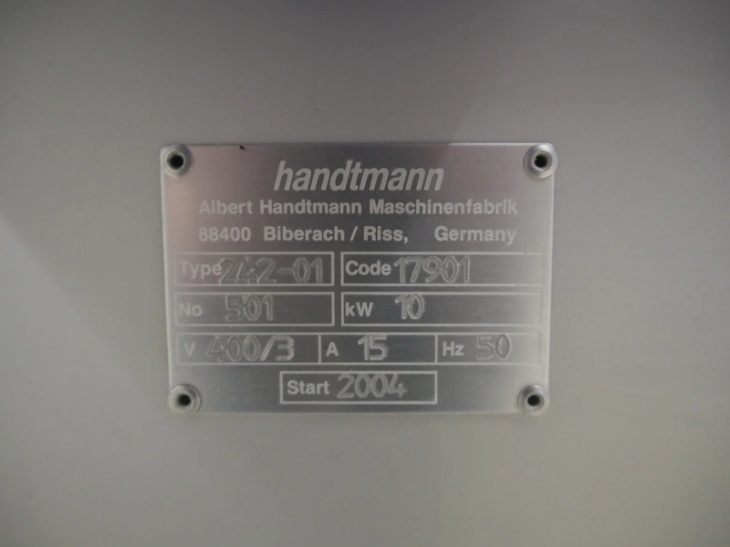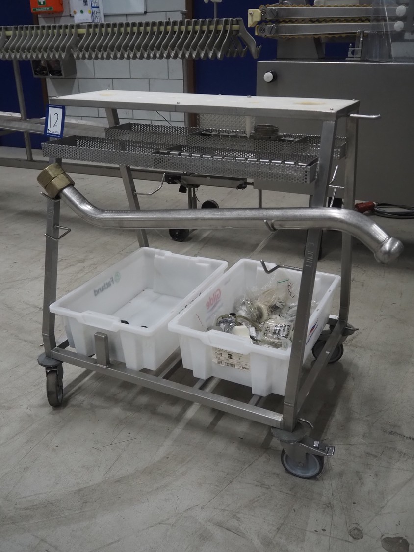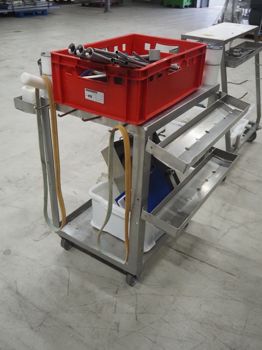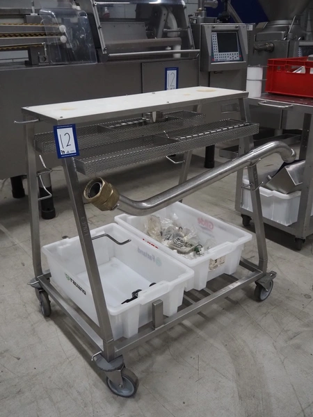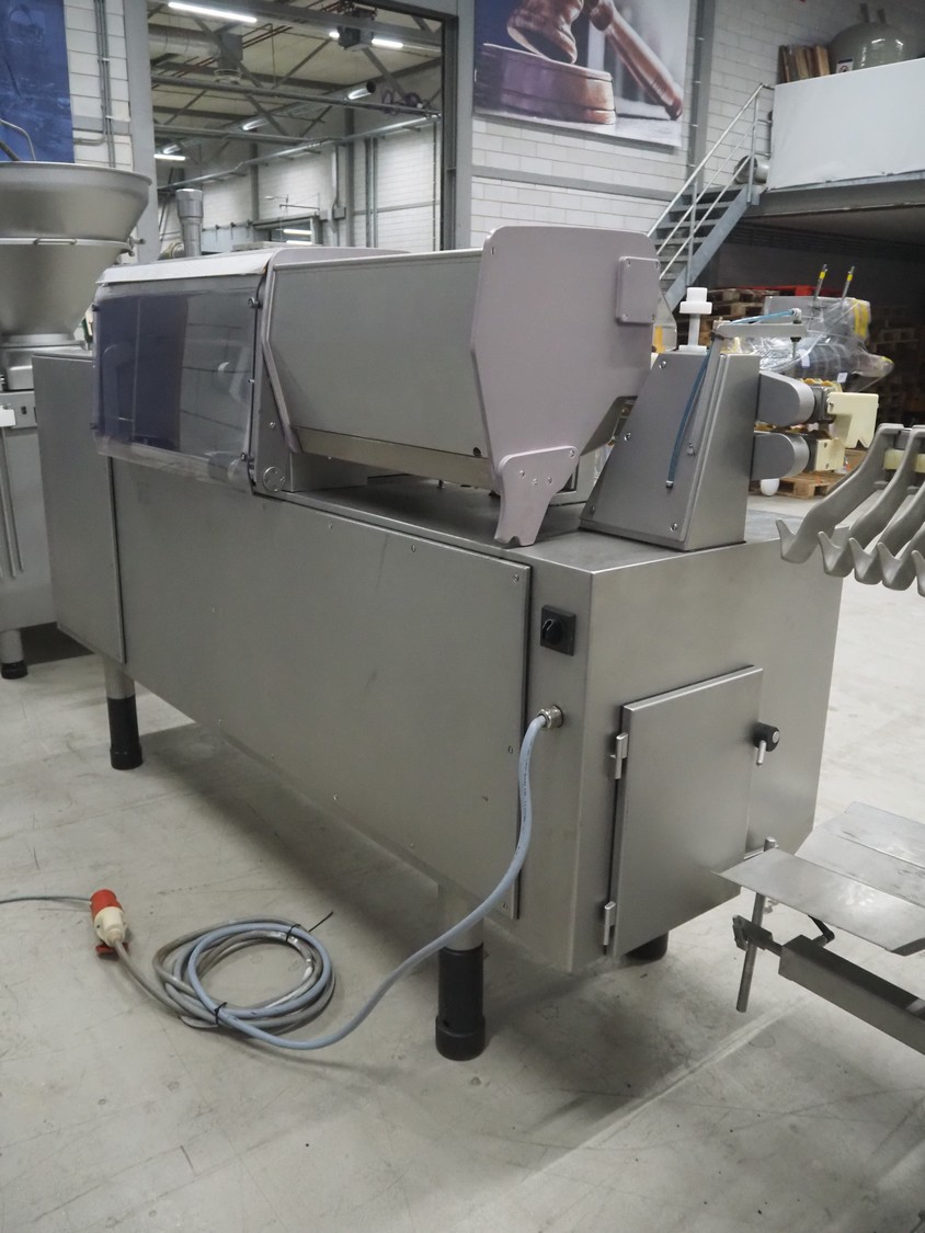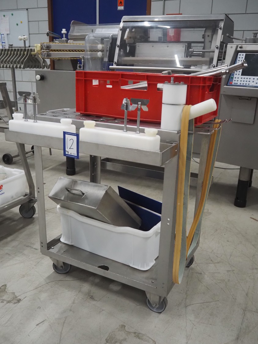 Handtmann mobile portioning and linking machine, type: 242-01, number: 501, year of construction: 2004, 400 V, 3 Ph, 50 Hz, 15 A, 10 kW, dimensions: 2600 mm x 880 mm x 1780 mm. Including 2 tool trolleys, dimensions trolleys: 1050 mm x 750 mm x 1000 mm and 900 mm x 860 mm x 880 mm.