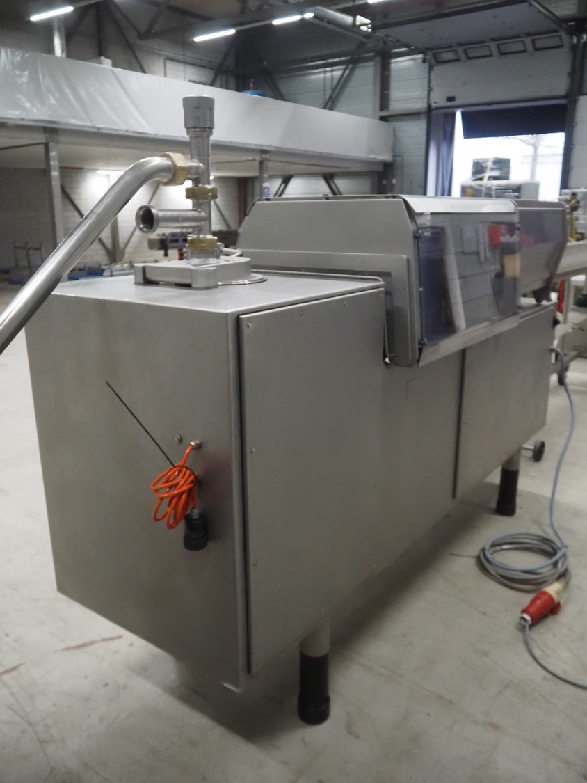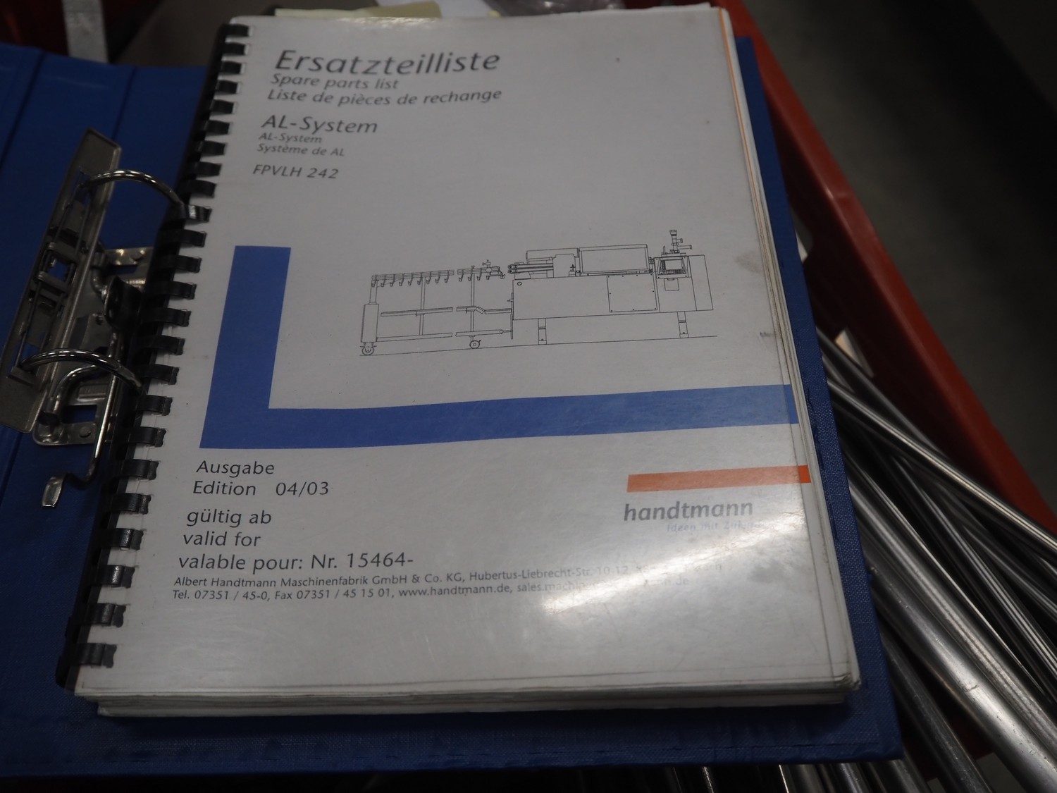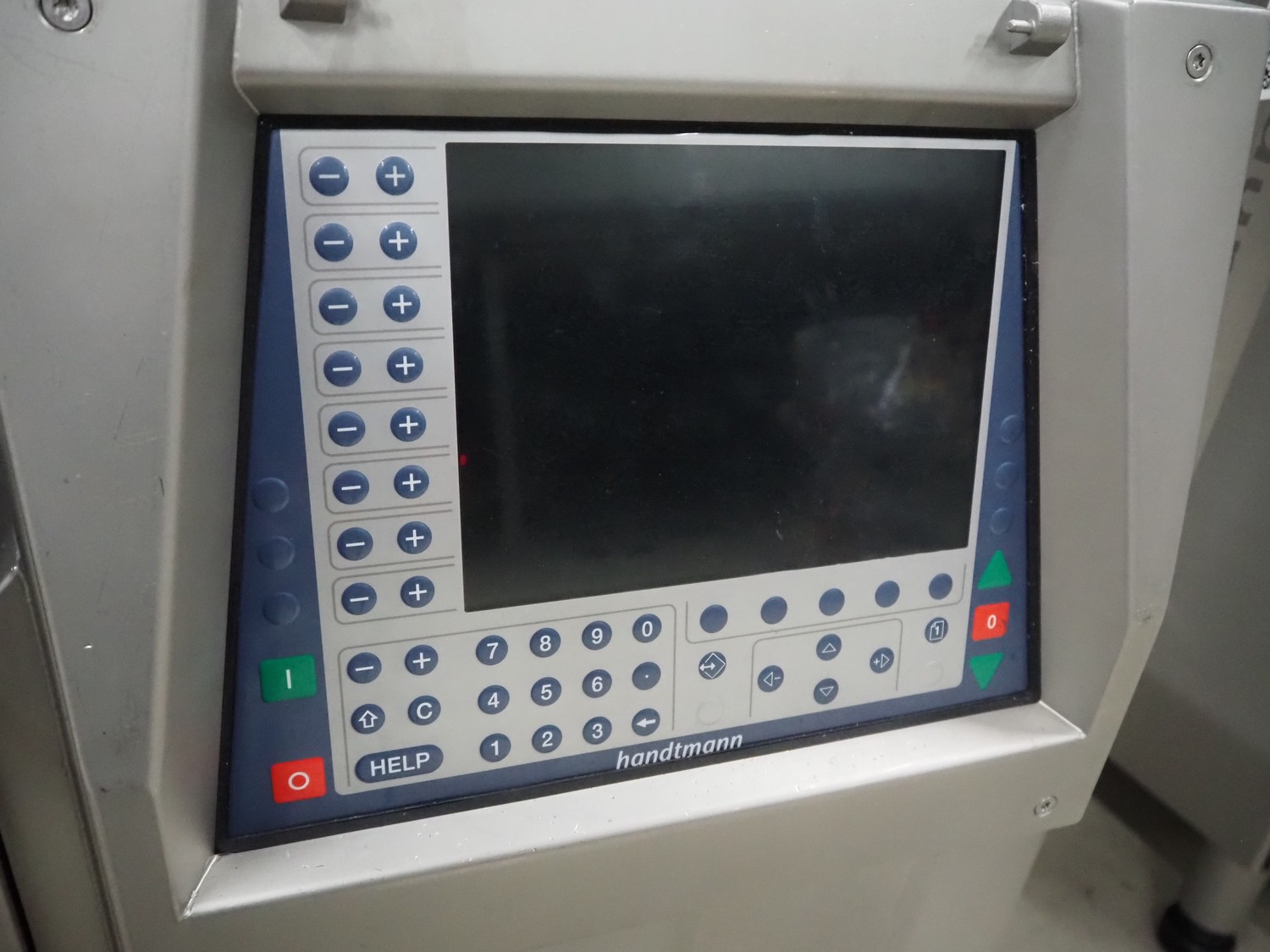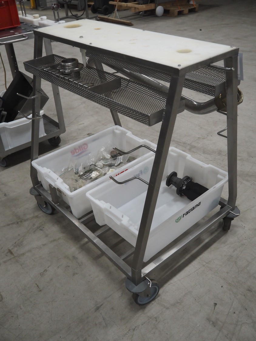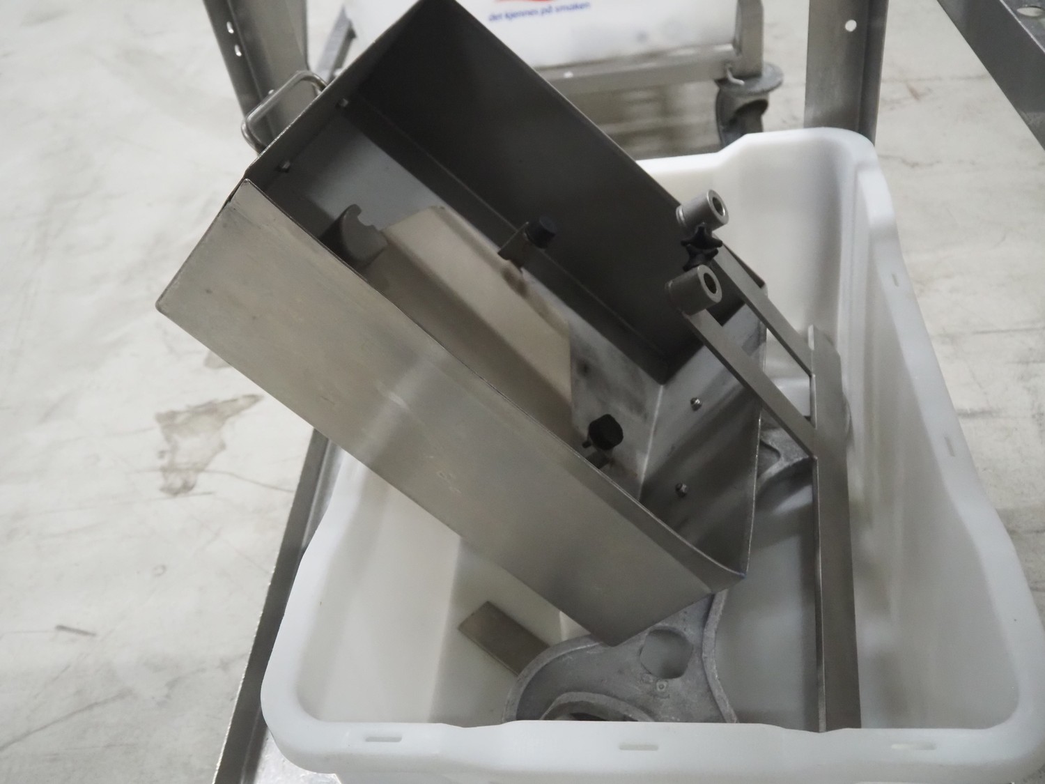 Handtmann mobile portioning and linking machine, type: 242-01, number: 501, year of construction: 2004, 400 V, 3 Ph, 50 Hz, 15 A, 10 kW, dimensions: 2600 mm x 880 mm x 1780 mm. Including 2 tool trolleys, dimensions trolleys: 1050 mm x 750 mm x 1000 mm and 900 mm x 860 mm x 880 mm.