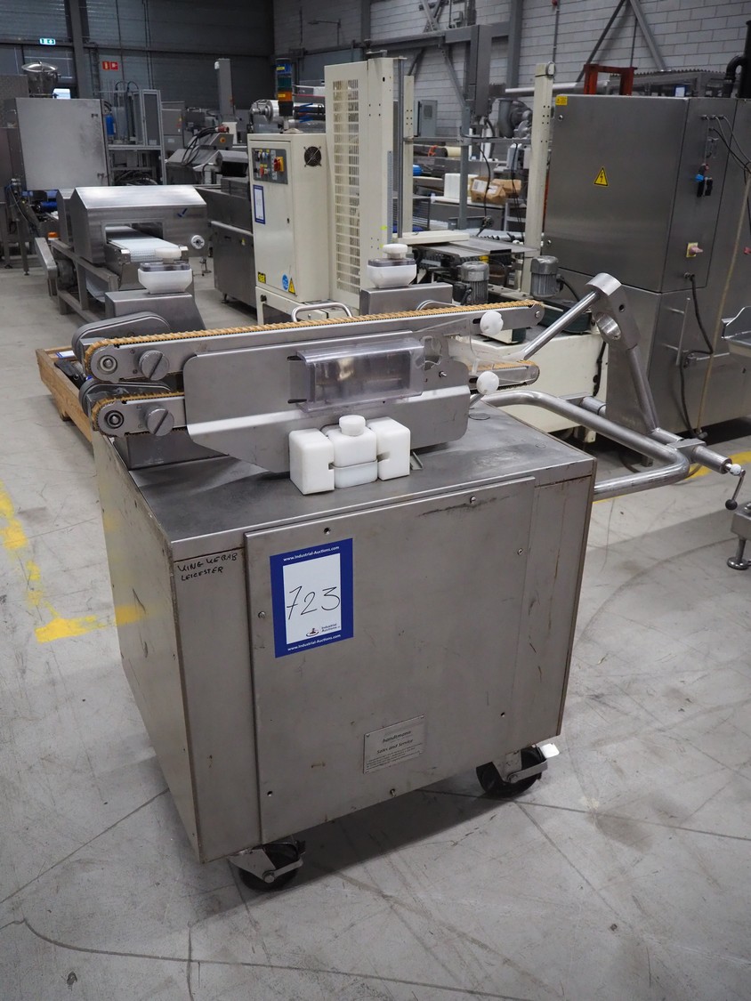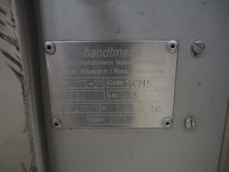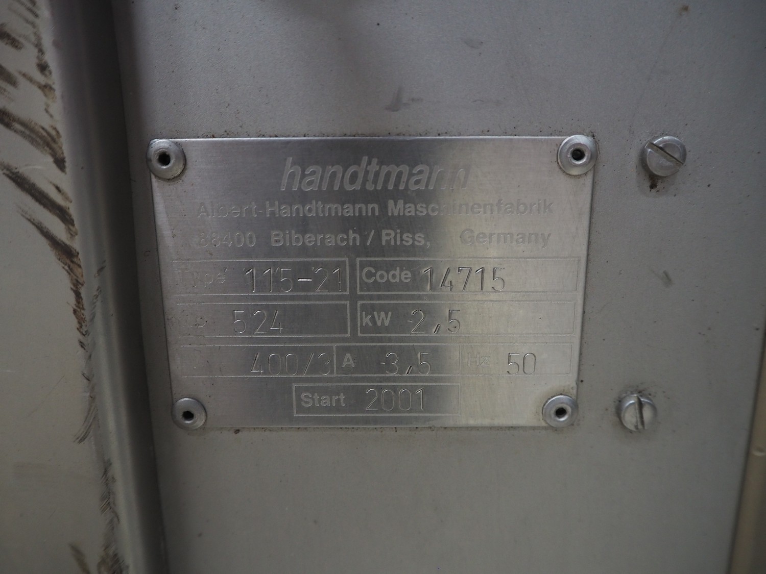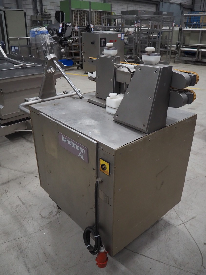 Handtmann mobile linking machine, type: 115-21, number: 524, year of construction: 2001, 400 V, 3 Ph, 50 Hz, 3.5 A, 2.5 kW, dimensions: 1300 mm x 720 mm x 1280 mm.