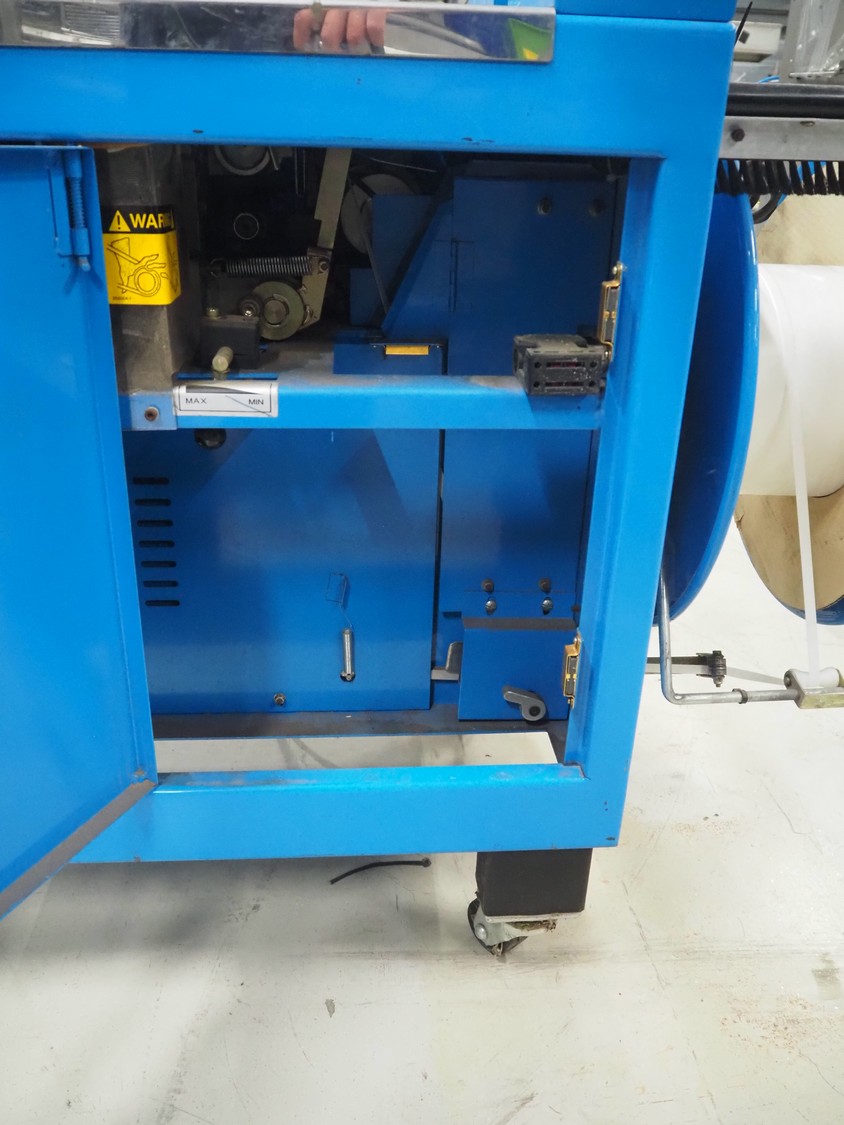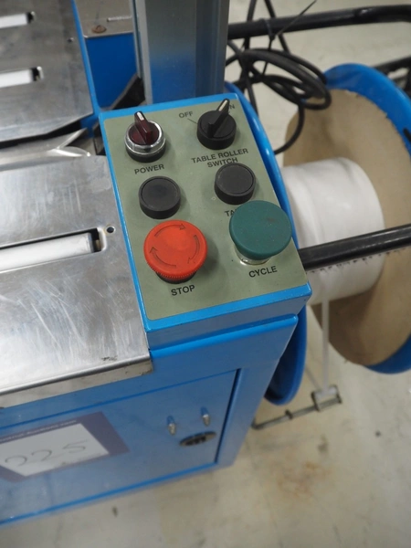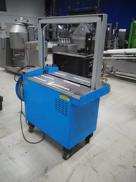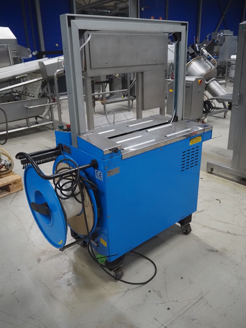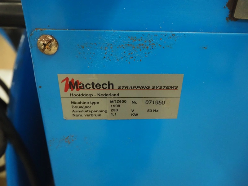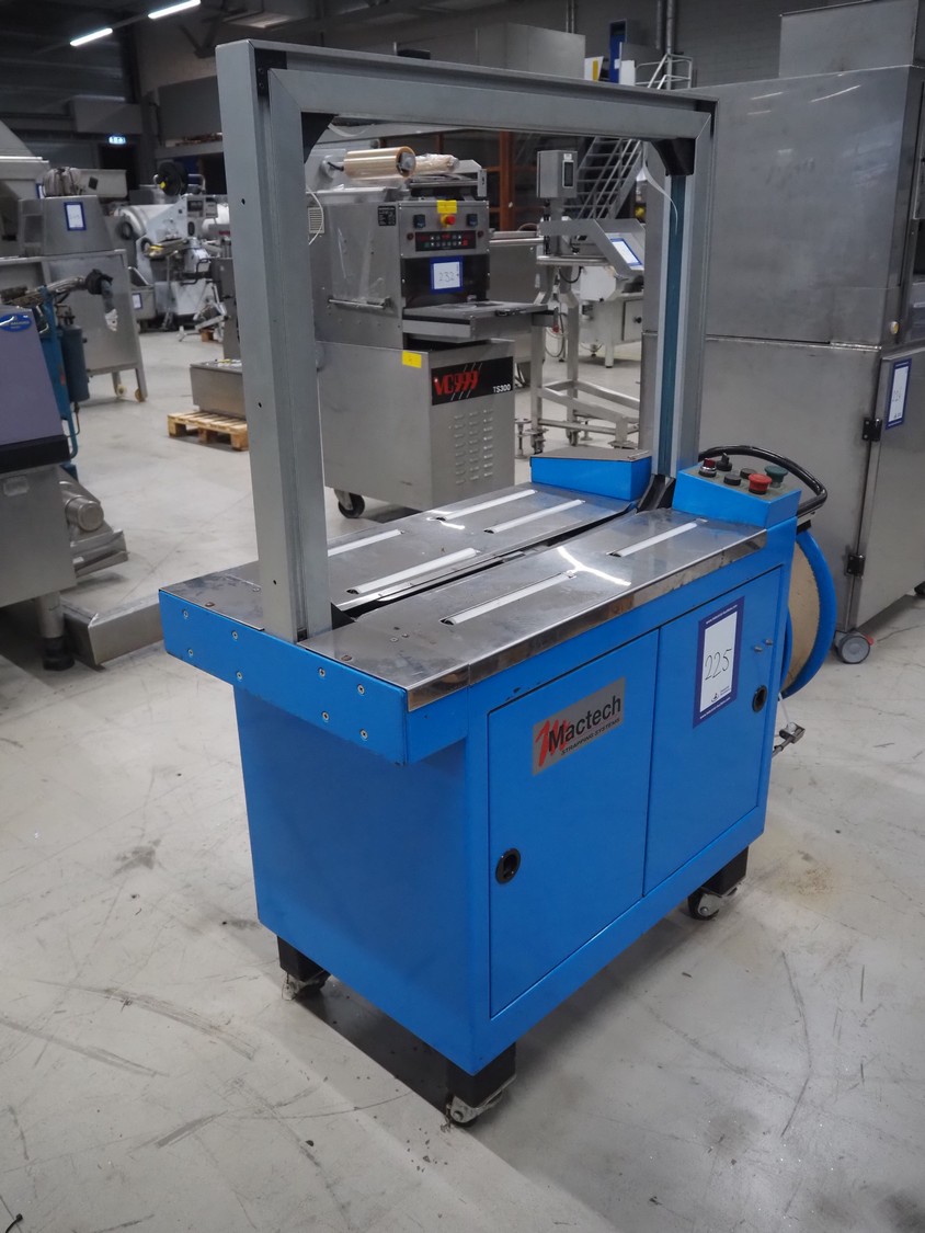Mactech mobile strapping machine, type: MTZ600, number: 071950, year of construction: 1999, 230 V, 1 Ph, 50 Hz, clearance: 700 mm x 610 mm, total dimensions: 1260 mm x 520 mm x 1530 mm.