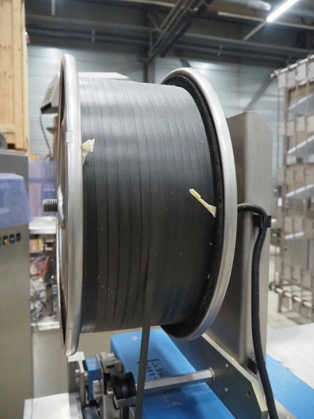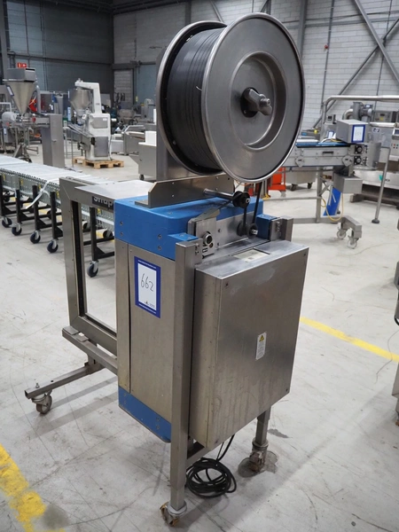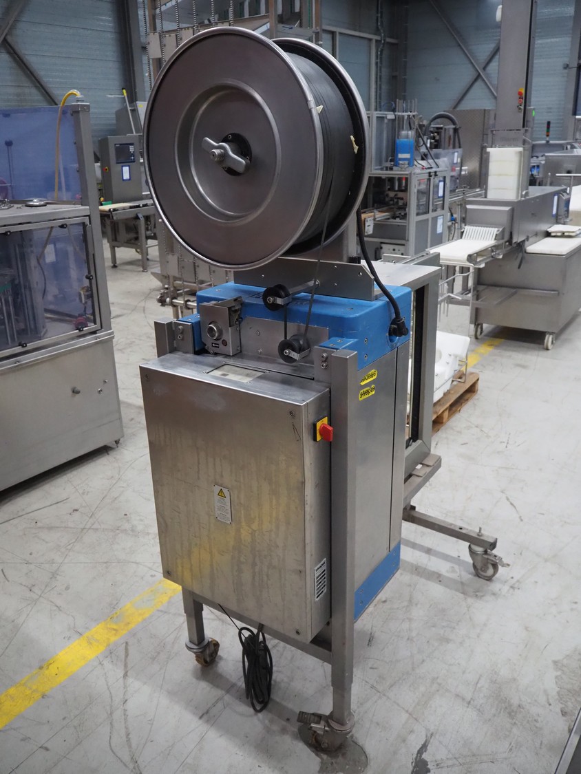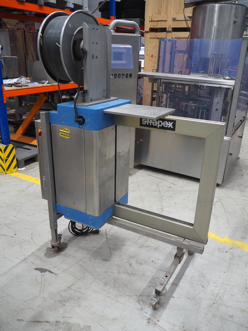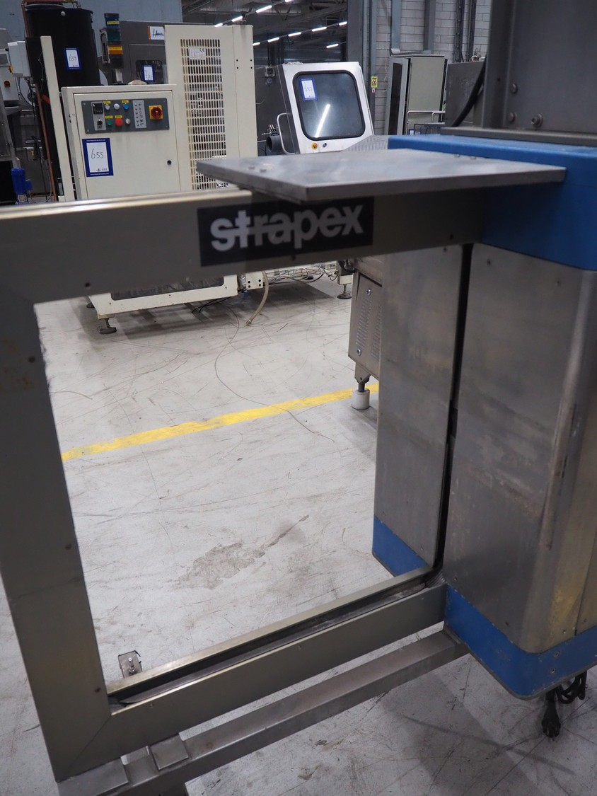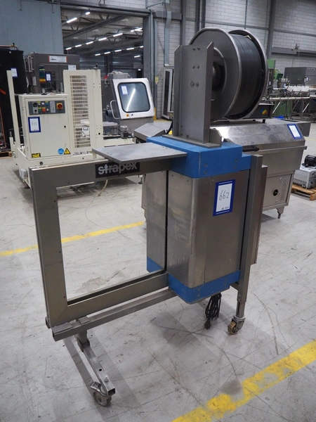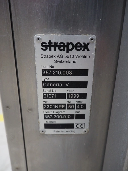 Strapex mobile strapping machine, type: Canaria V, serial number: 01071, year of construction: 1999, 230 V, 1 Ph, 50 Hz, 4.0 A, clearance: 650 mm x 650 mm, total dimensions: 1320 mm x 850 mm x 1870 mm.