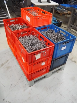 Pallet with 13 crates with s/s meat hooks, length hook: 190 mm, total dimensions: 1200 mm x 800 mm x 920 mm.€ 100,000 bids09/12/2025 12:00 -