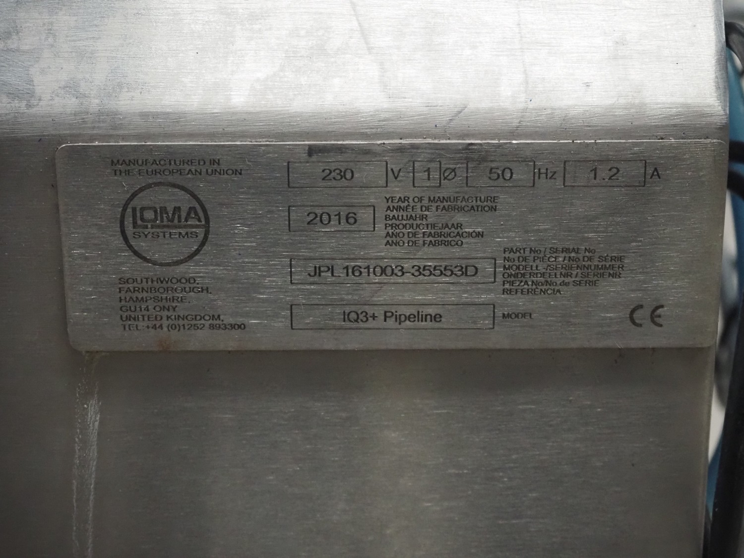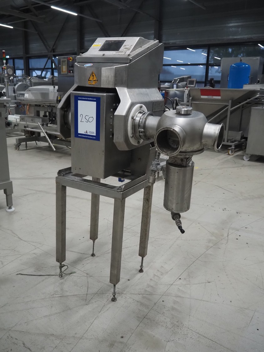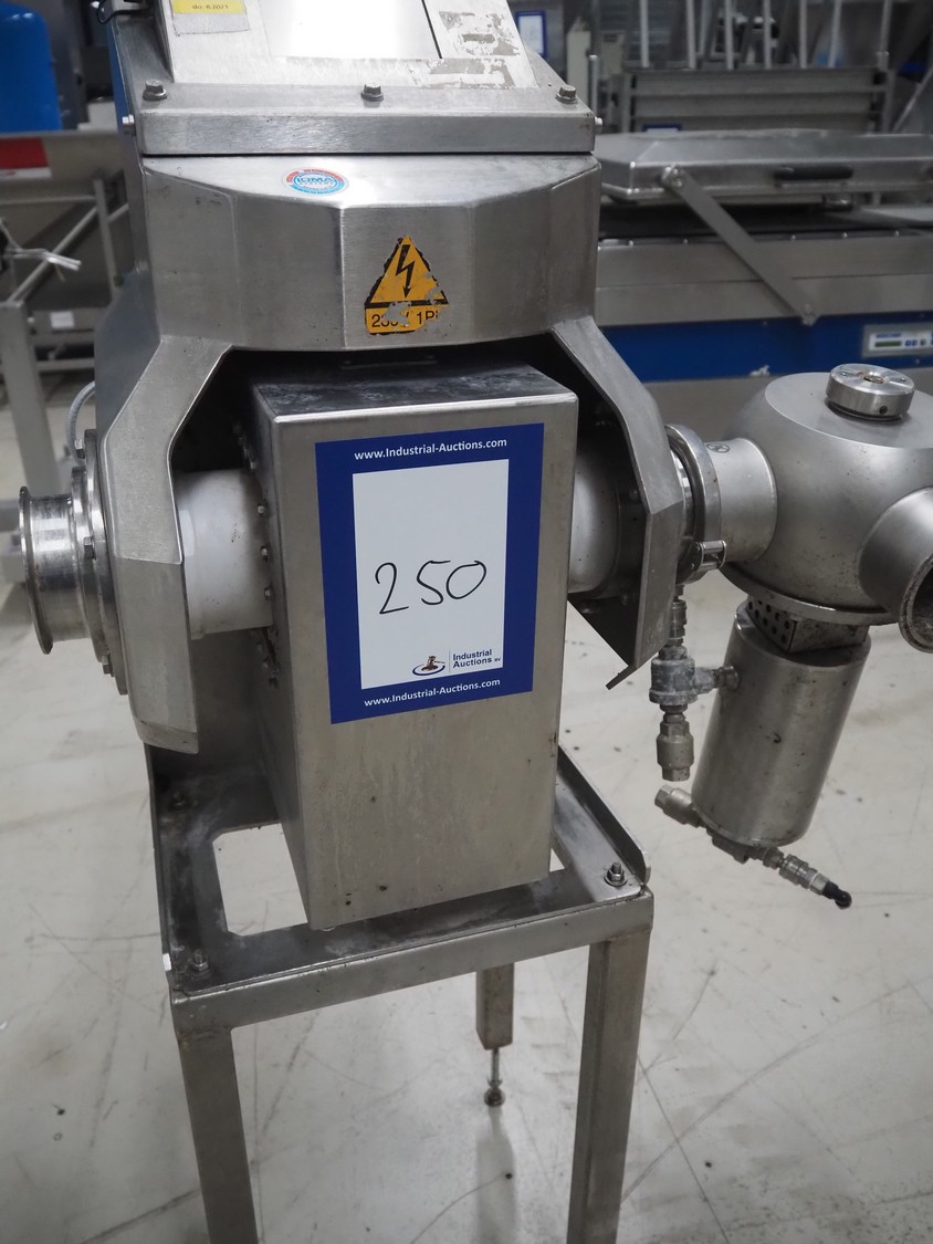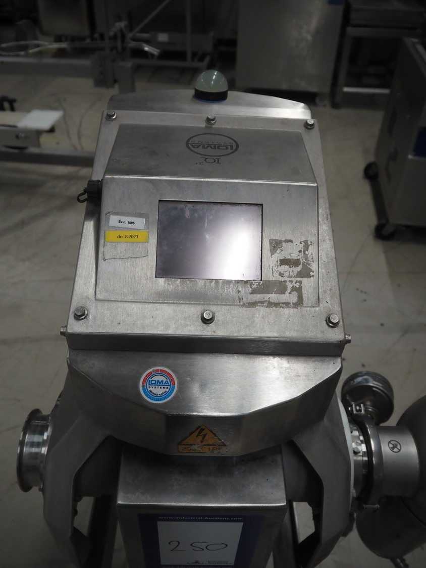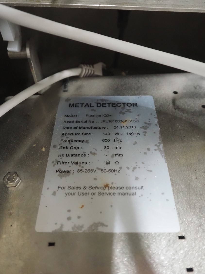 Loma Systems pipeline metal detector with rejecter, model: IQ³+ Pipeline, serial number: JPL161003-35553D, year of construction: 2016, 230 V, 1 Ph, 50 Hz, 1.2 A, pipe diameter: 100 mm, total dimensions: 900 mm x 600 mm x 1400 mm. Technical condition unknown.