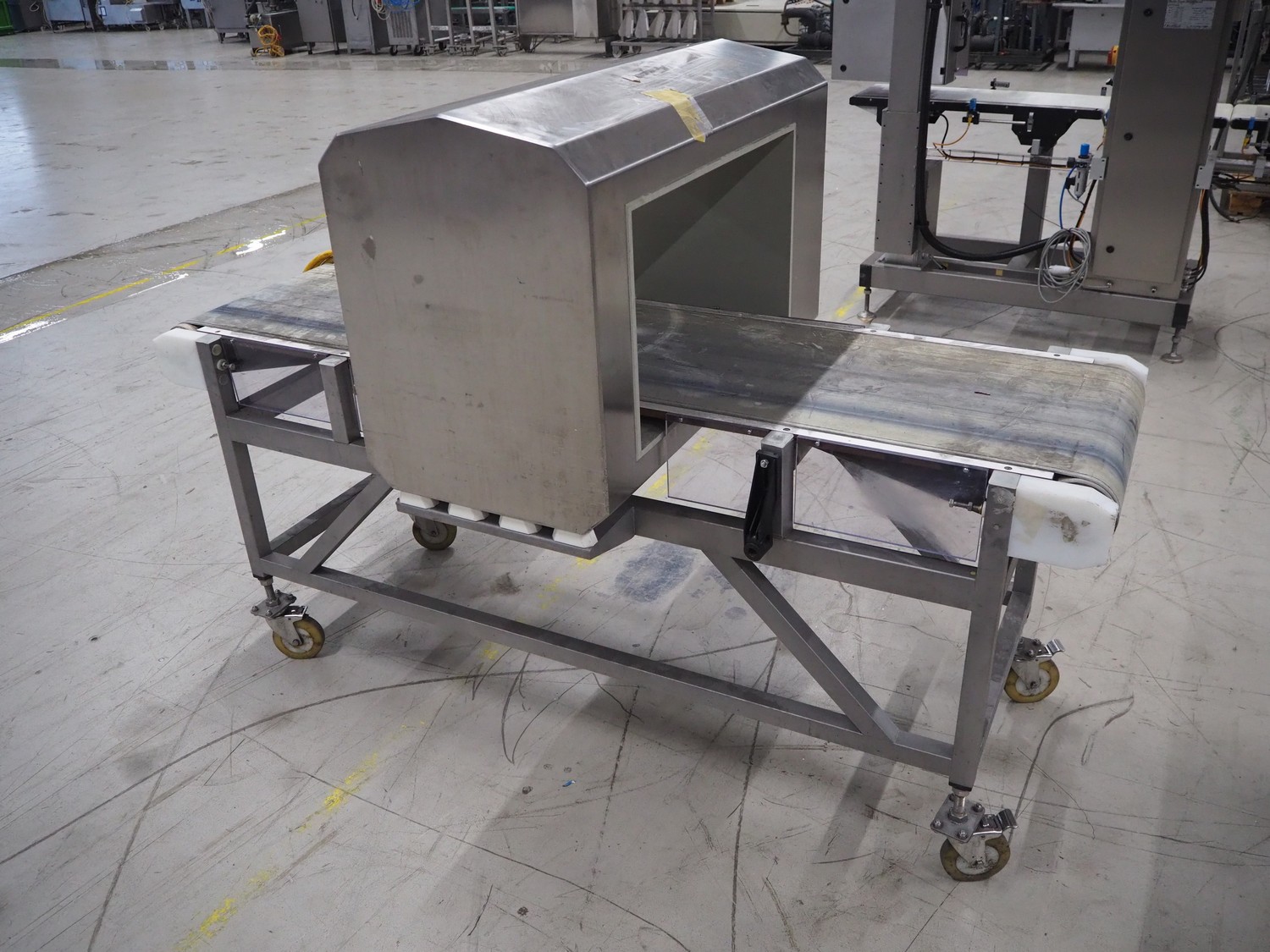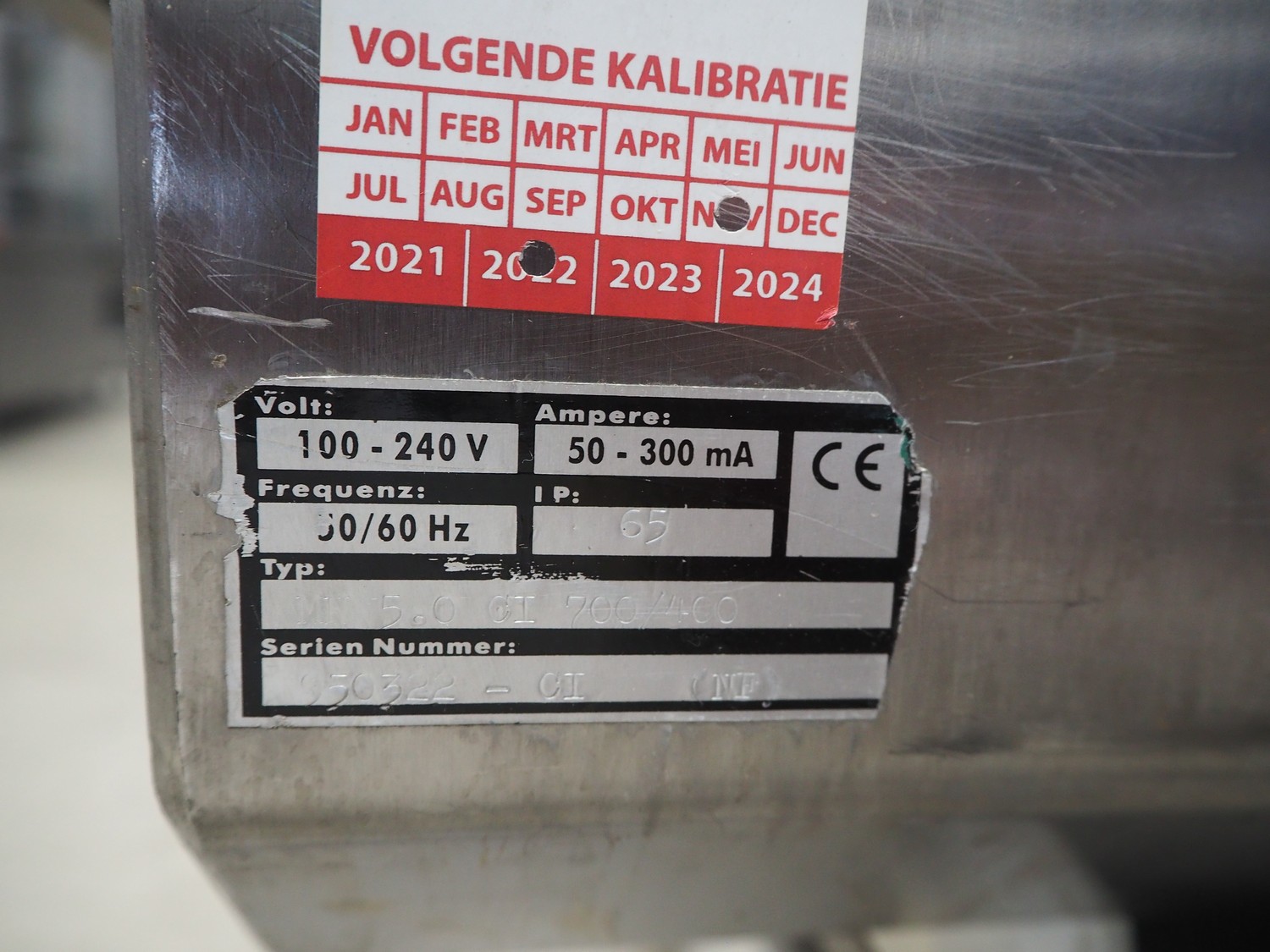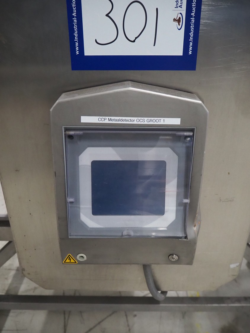 OCS mobile metal detector, type: MN 5.0 CI 700/400, serial number: 950322-CI, 100-240 V, 50/60 Hz, 50-300 mA, plastic belt, belt width: 470 mm, clearance: 700 mm x 360 mm, total dimensions: 2200 mm x 1100 mm x 1350 mm. Technical condition unknown.