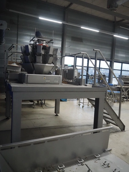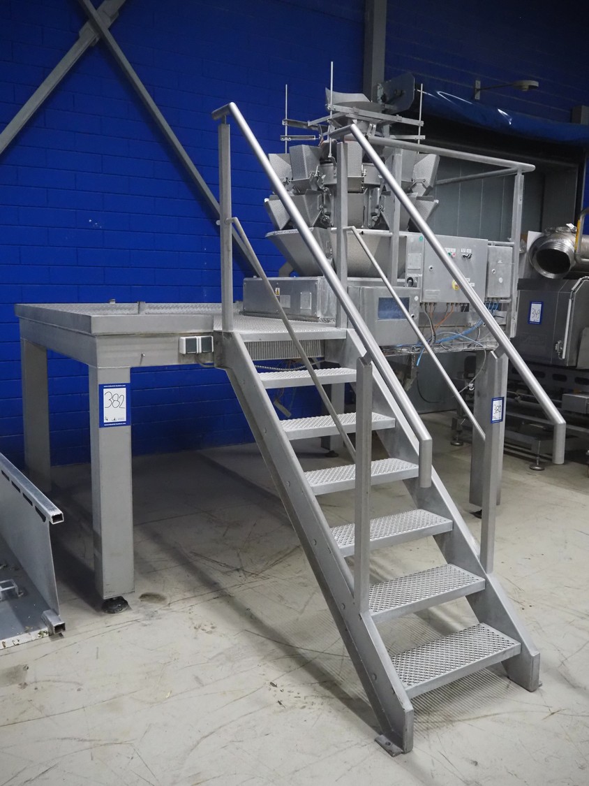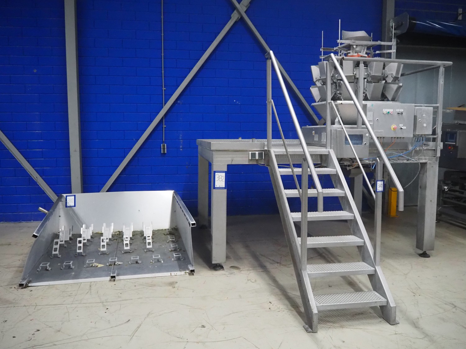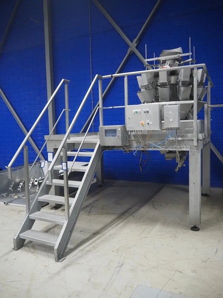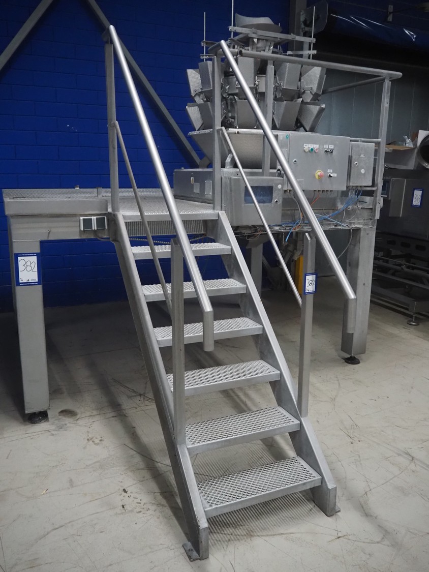 Ishida 10-heads multihead weigher on Abracat s/s platform, platform height: 1320 mm, total dimensions: 3170 mm x 2370 mm x 2500 mm. With rack for weighing heads, dimensions: 2400 mm x 1750 mm x 650 mm.