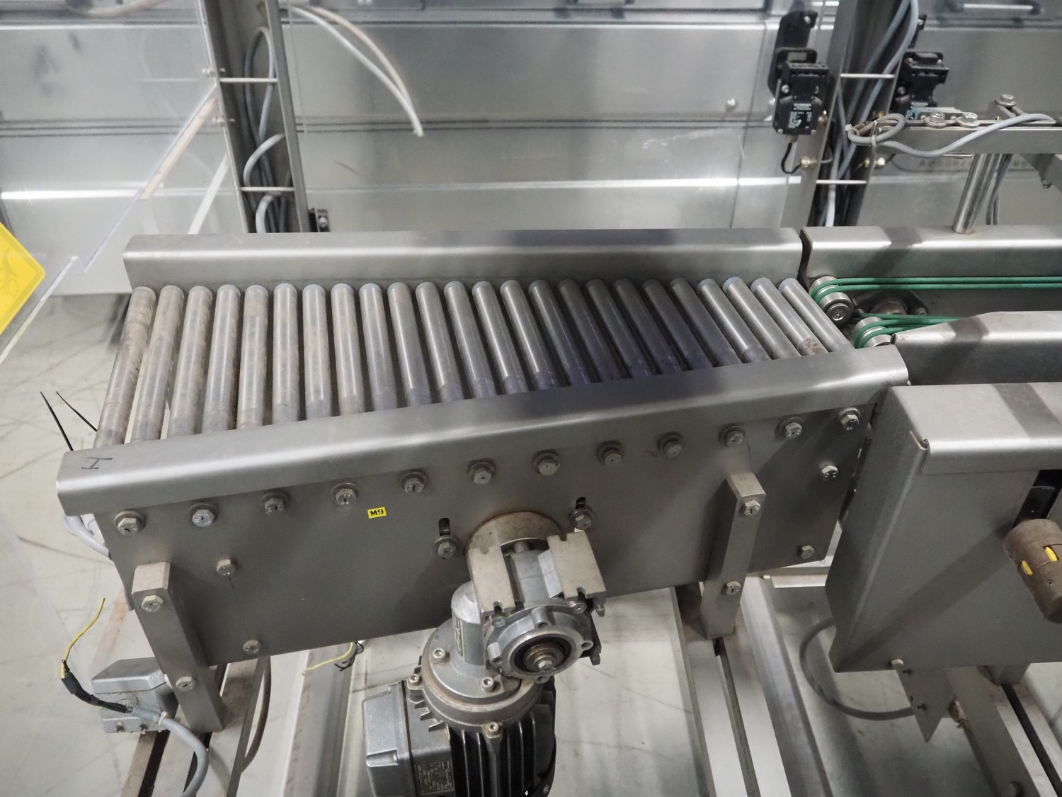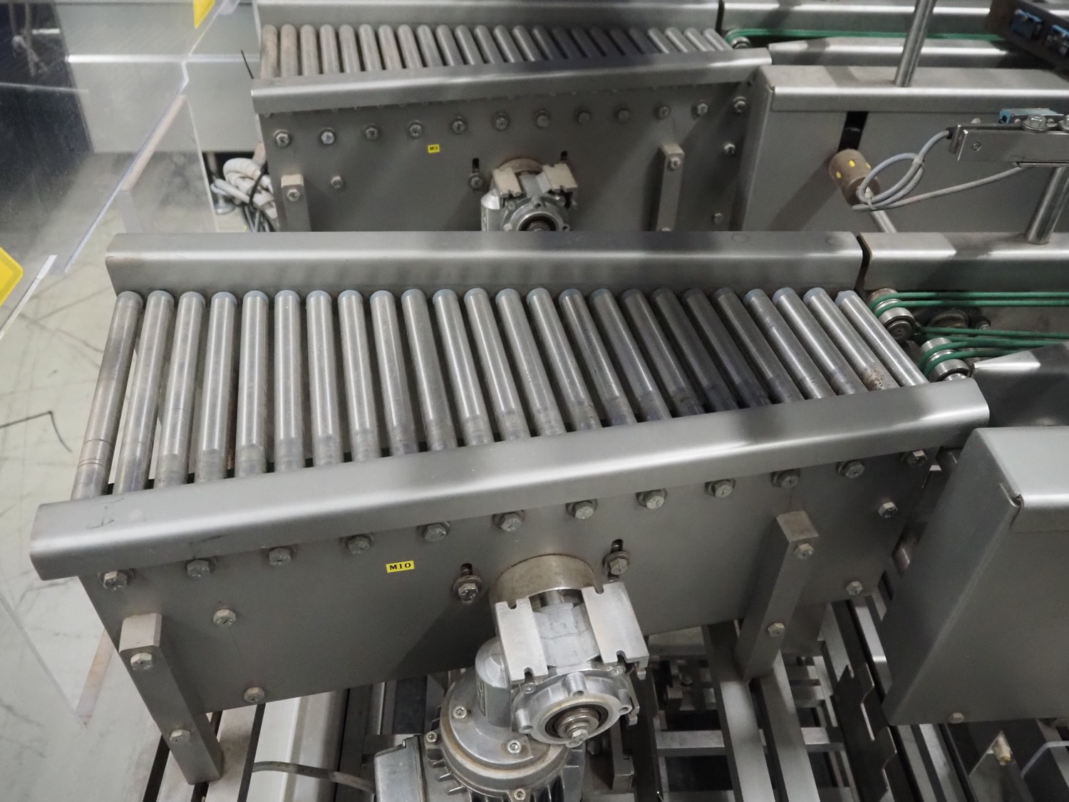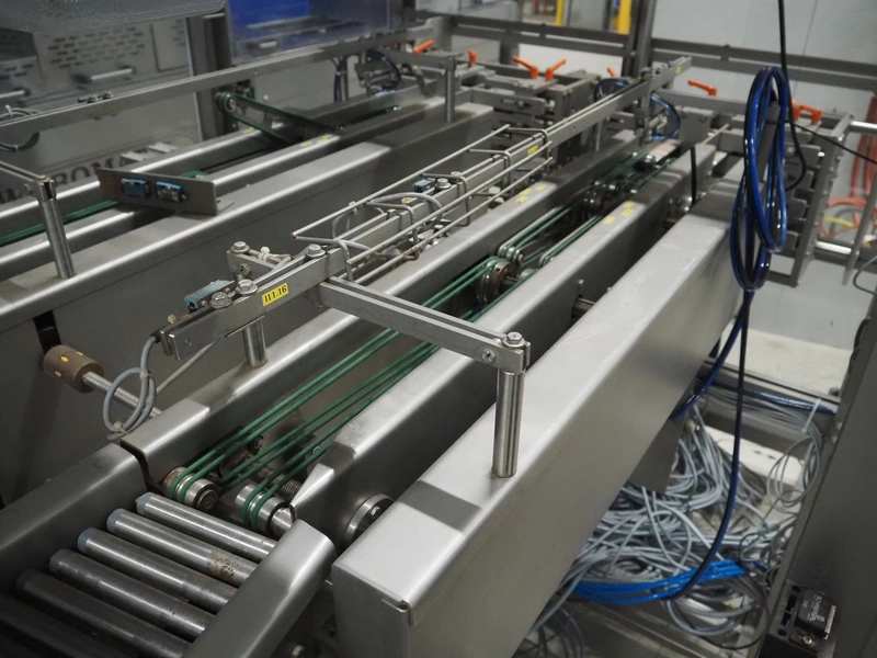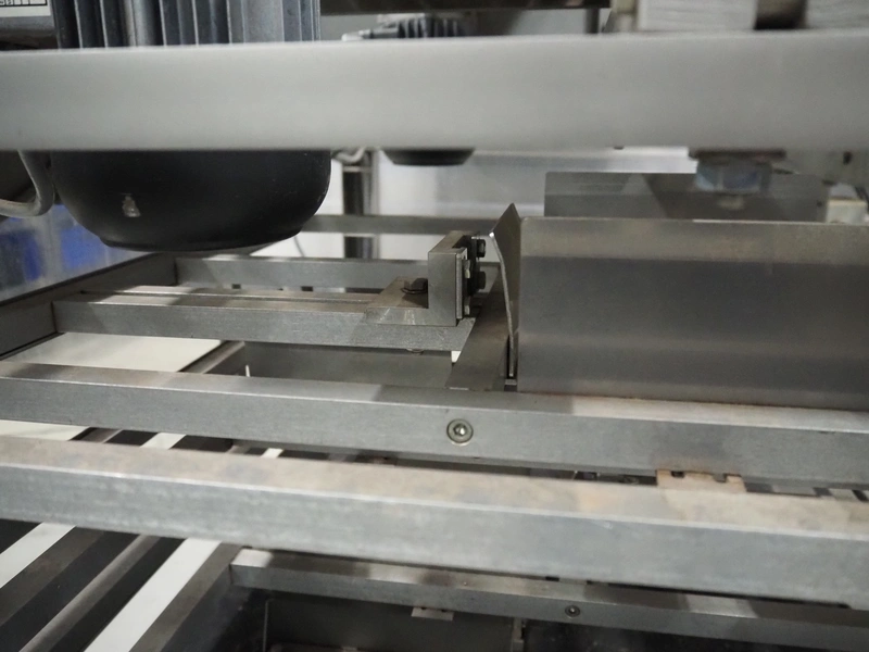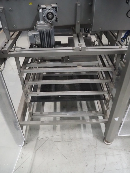 S/s stacker, s/s rollers, roller width: from 250 mm to 150 mm, plastic string belt, belt width: (2x) 110 mm, total dimensions: 2500 mm x 1740 mm x 1770 mm. Incomplete.