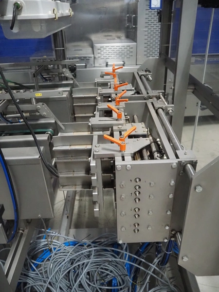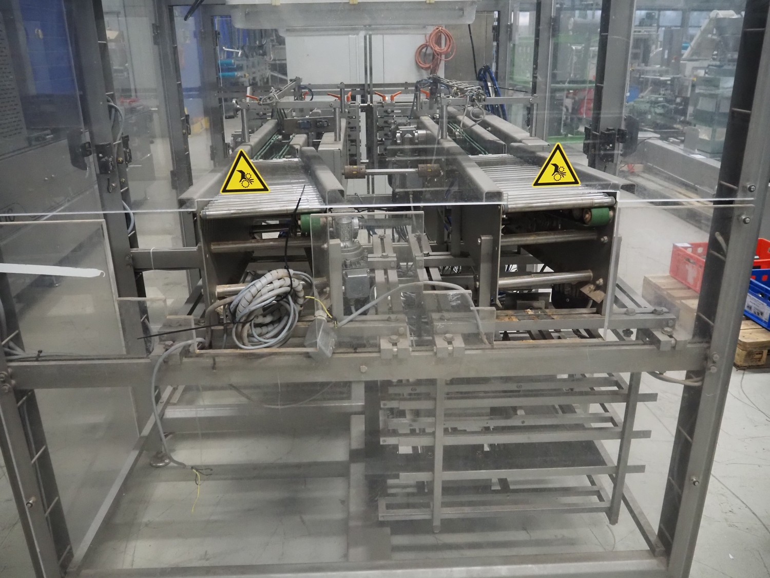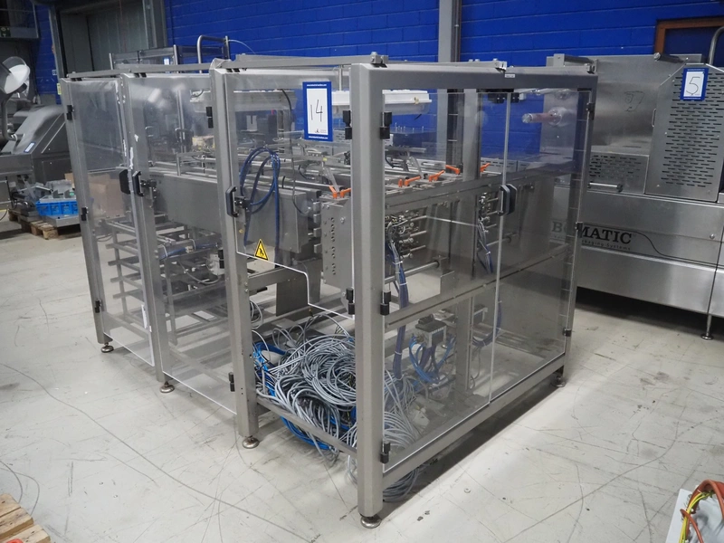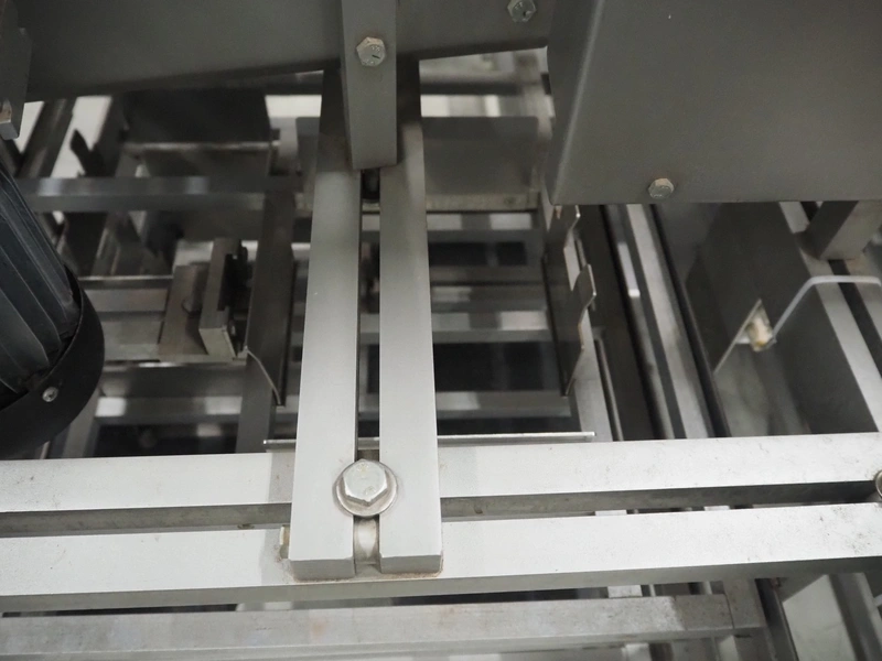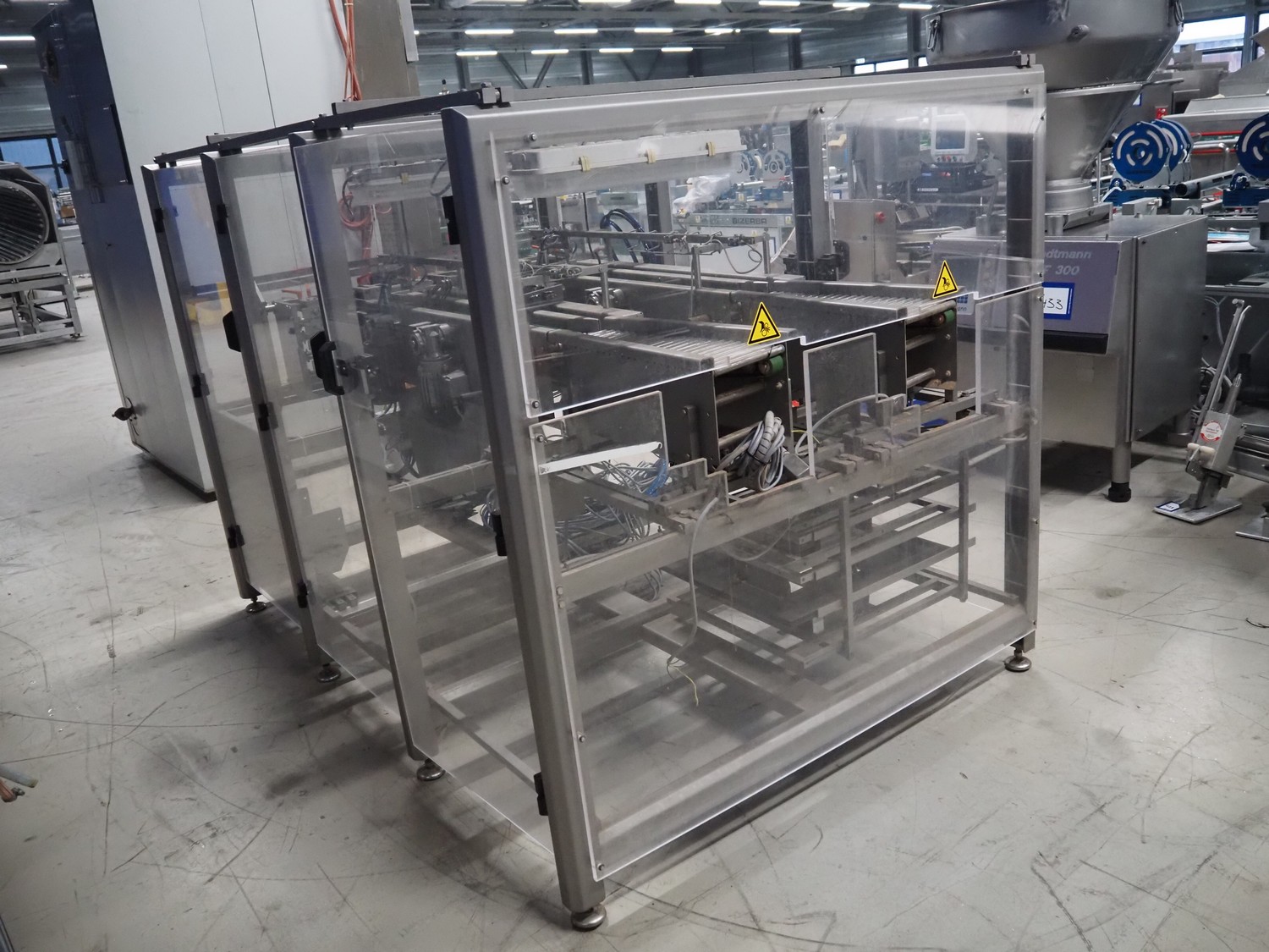S/s stacker, s/s rollers, roller width: from 250 mm to 150 mm, plastic string belt, belt width: (2x) 110 mm, total dimensions: 2500 mm x 1740 mm x 1770 mm. Incomplete.