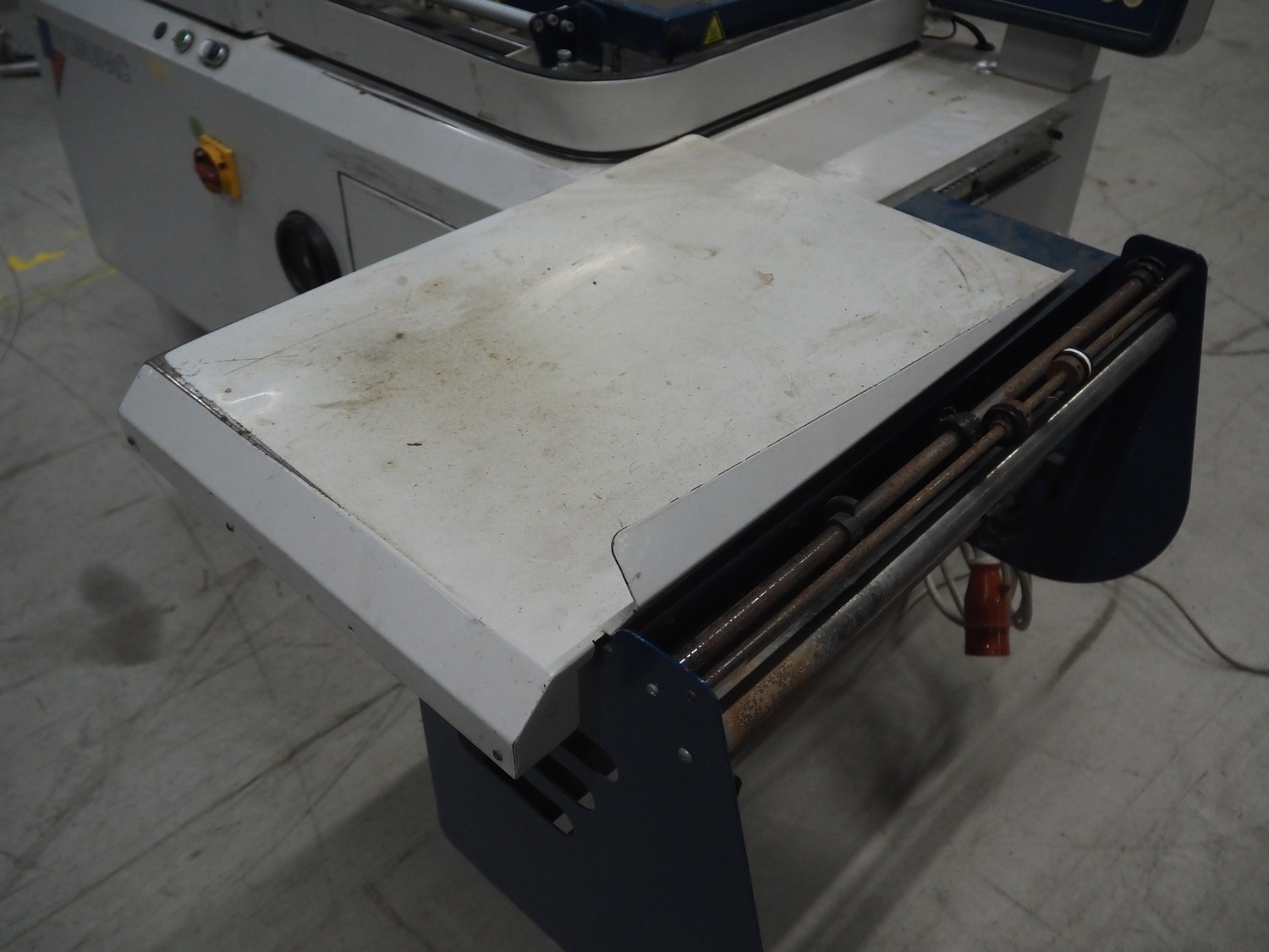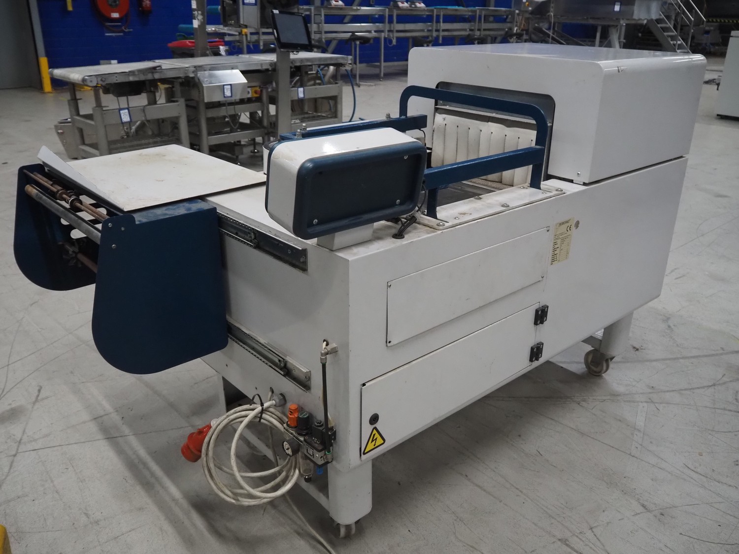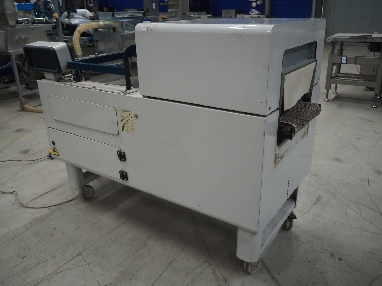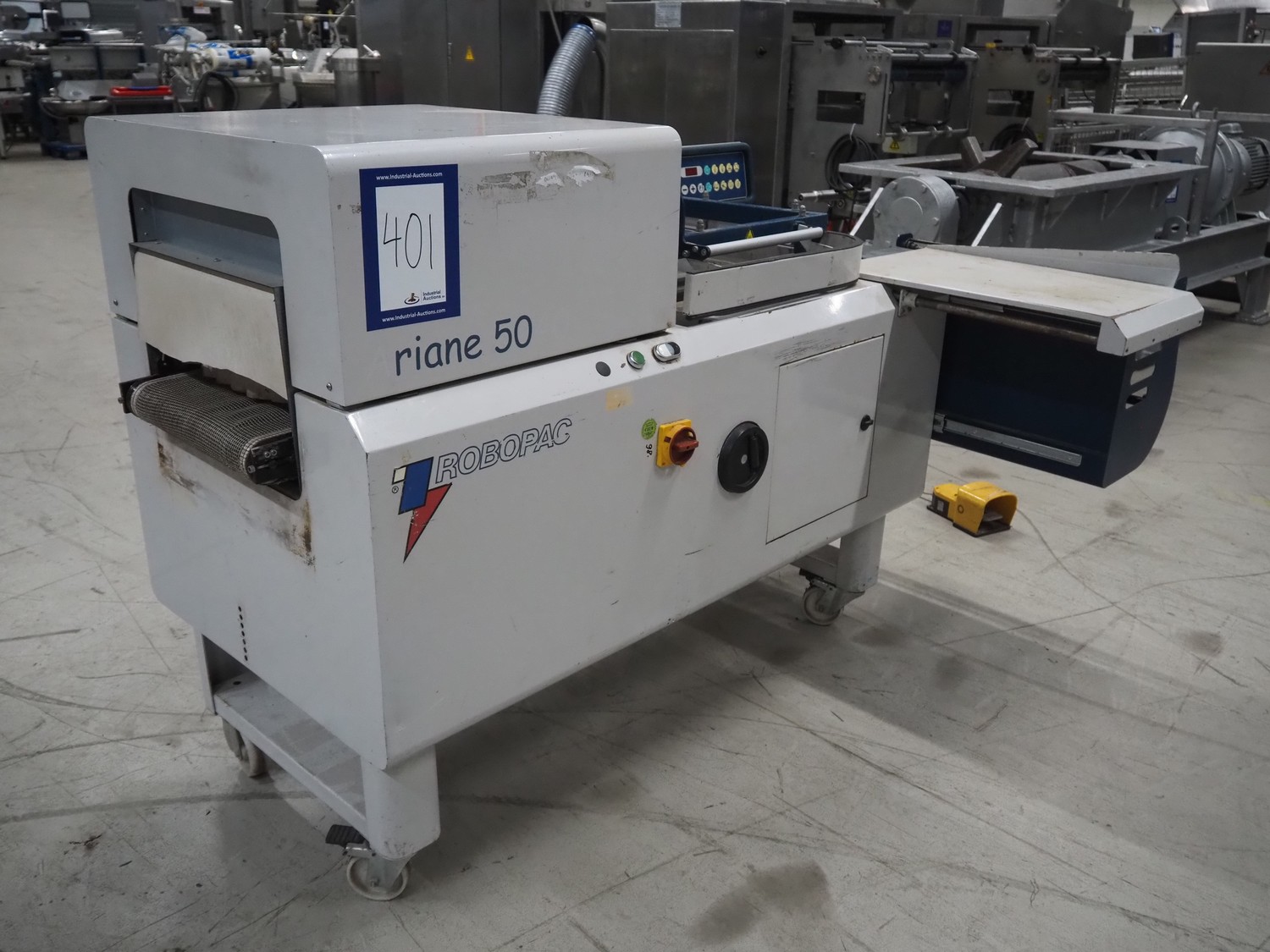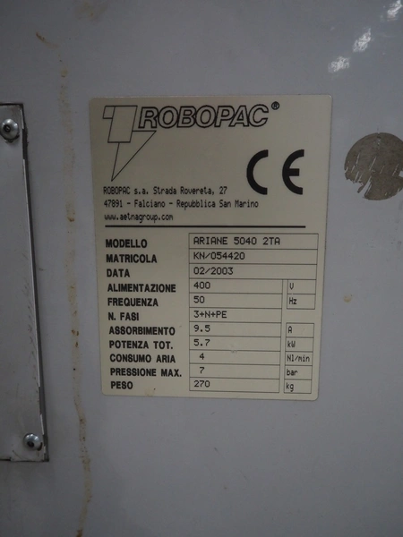 Robopac mobile automatic shrink wrapping machine, model: Ariane 5040 2TA, serial number: KN/054420, year of construction: 02/2003, 400 V, 3 Ph, 50 Hz, 9.5 A, 5.7 kW, seal length: 470 mm and 370 mm, plastic outfeed rollers, roller width: 450 mm, total dimensions: 2200 mm x 2250 mm x 1200 mm.