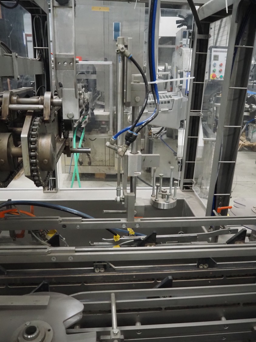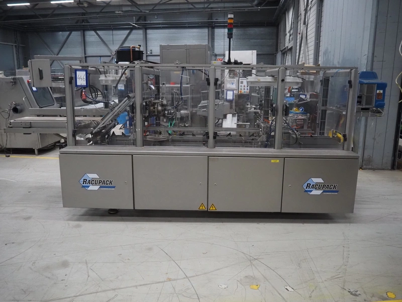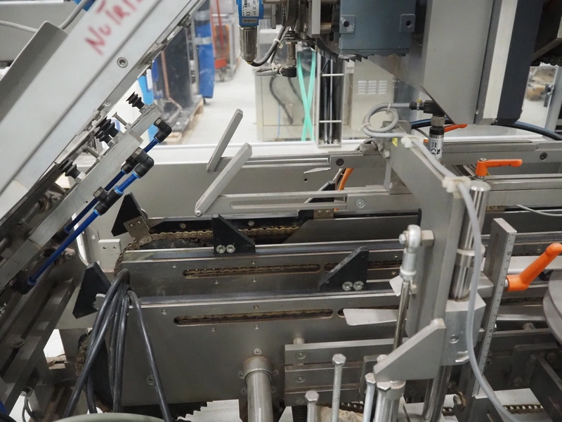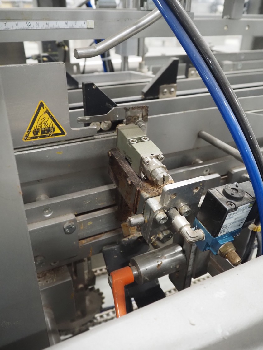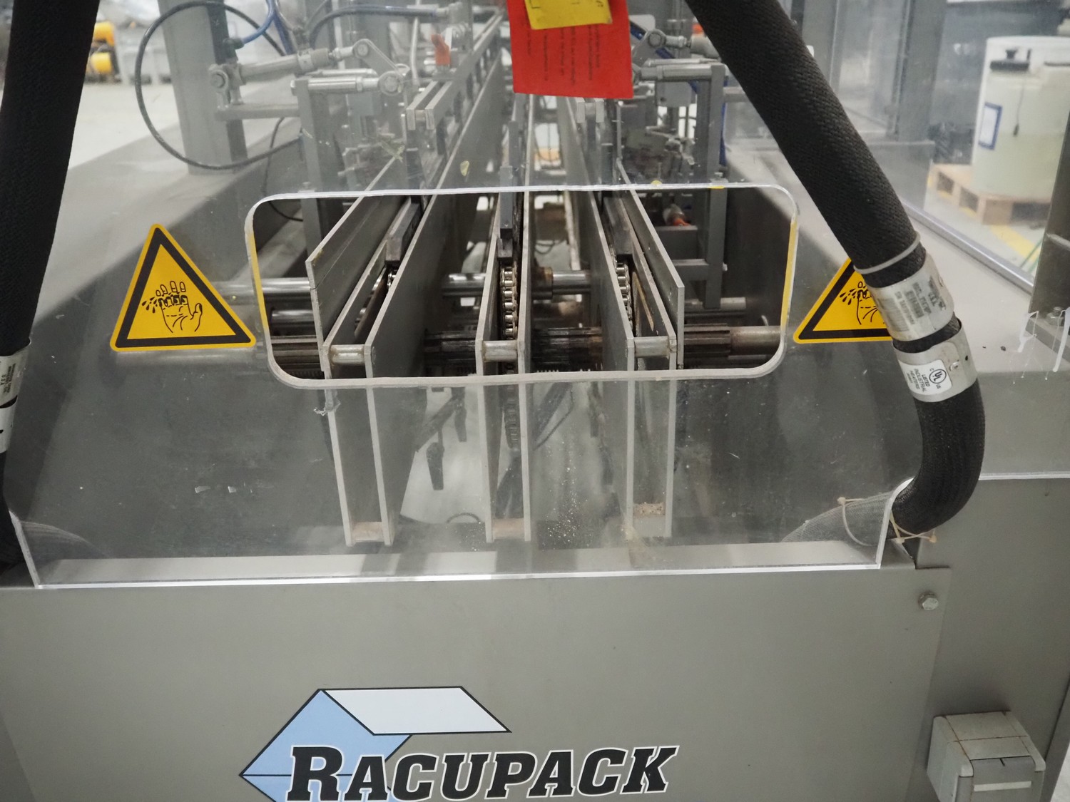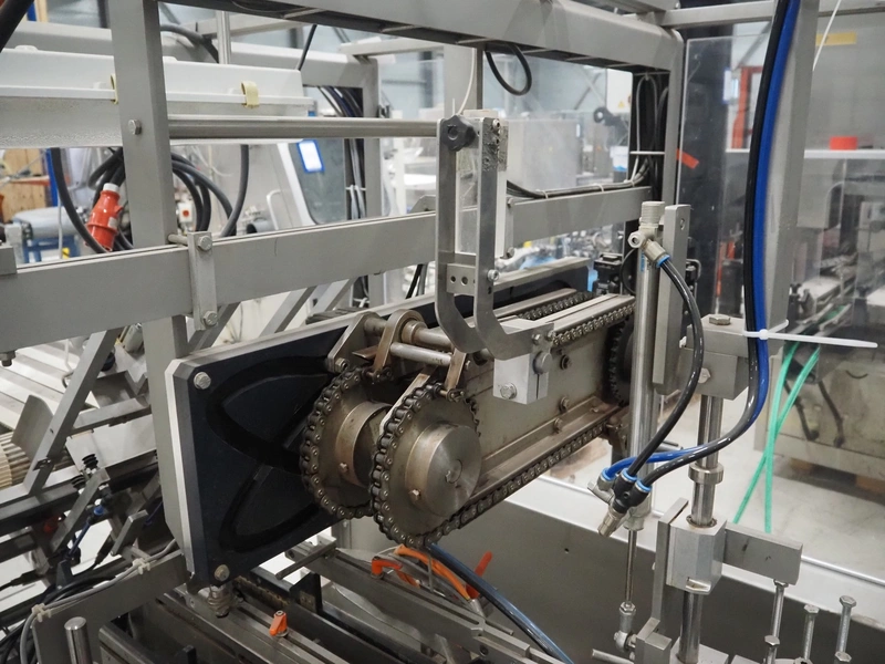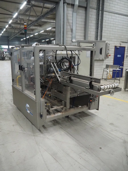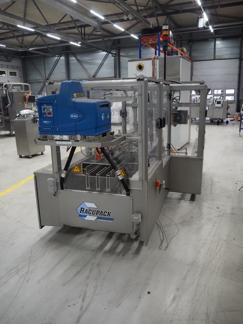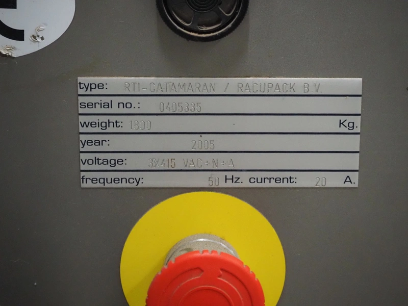 Racupack case packer, type: RTI-Catamaran, serial number: 0405335, year of construction: 2005, 400 V, 3 Ph, 50 Hz, 20 A, 1800 kg, Nordson glue unit, plastic infeed belt, belt width: 300 mm, clearance: 280 mm x 160 mm, chain conveyor with dividers, distance between dividers: 240 mm, divider height: 60 mm, total dimensions: 4650 mm x 1800 mm x 2450 mm.
