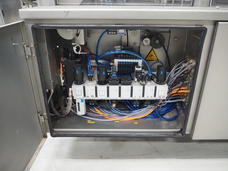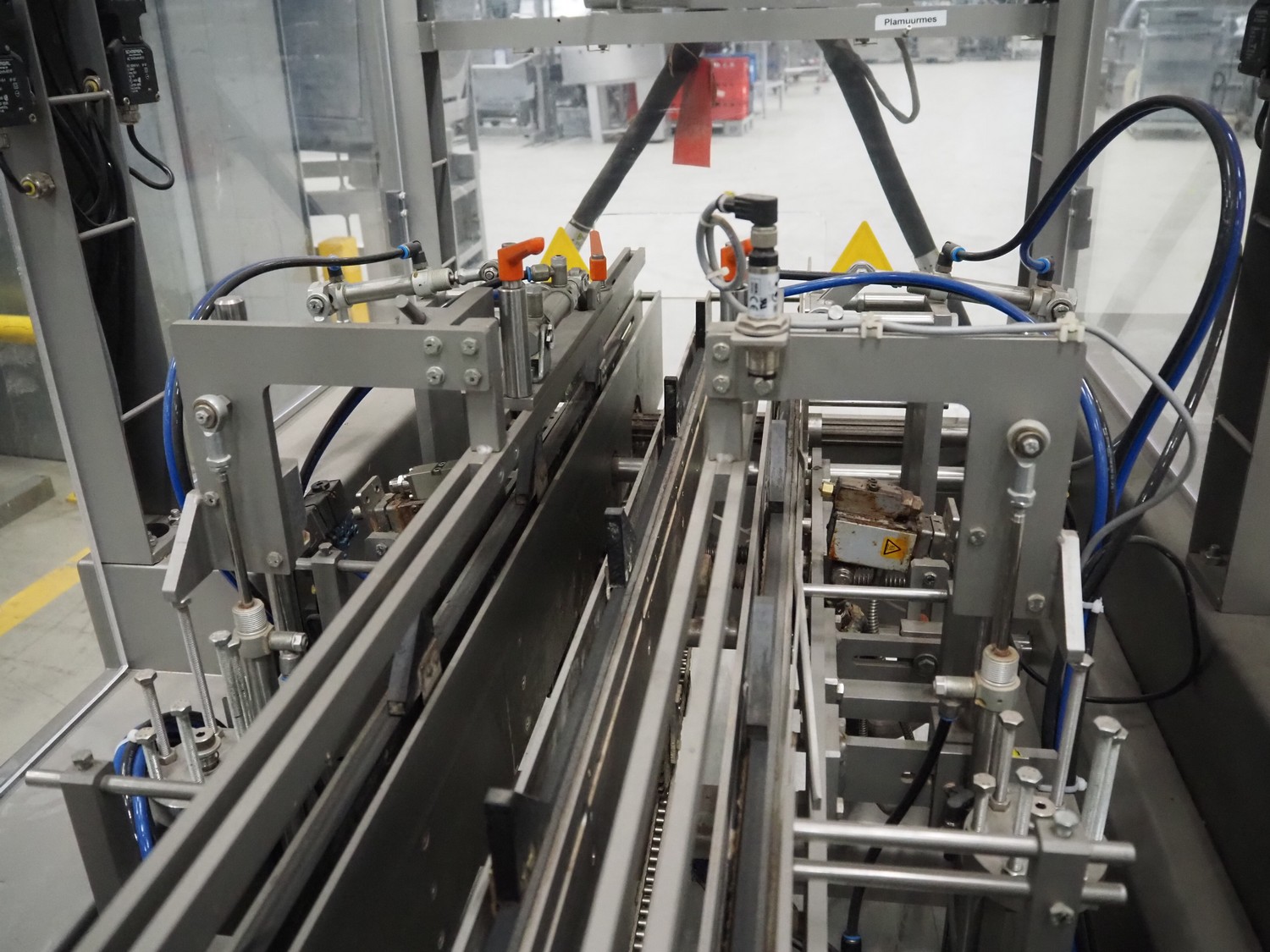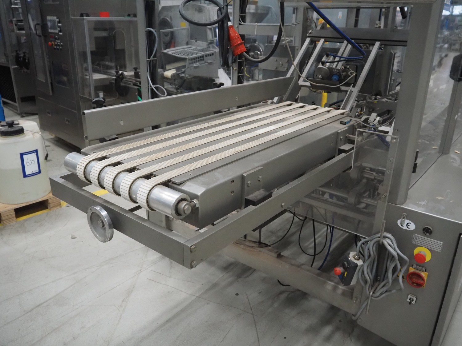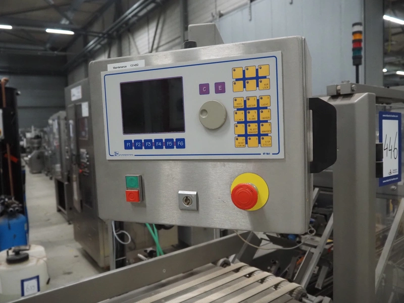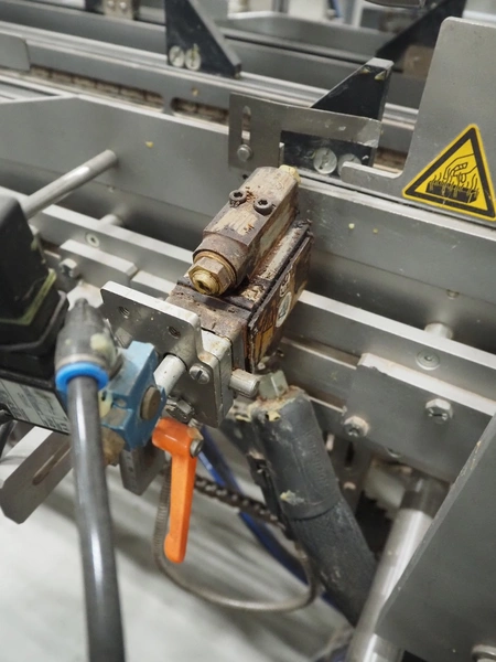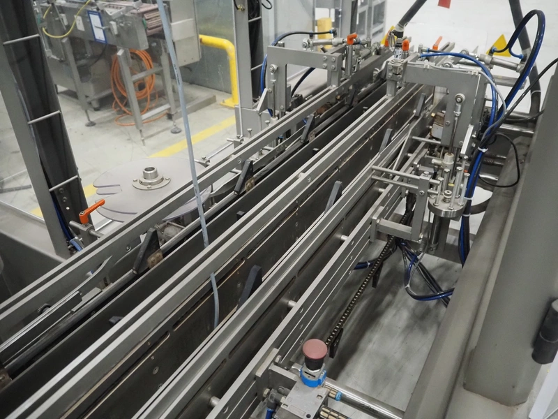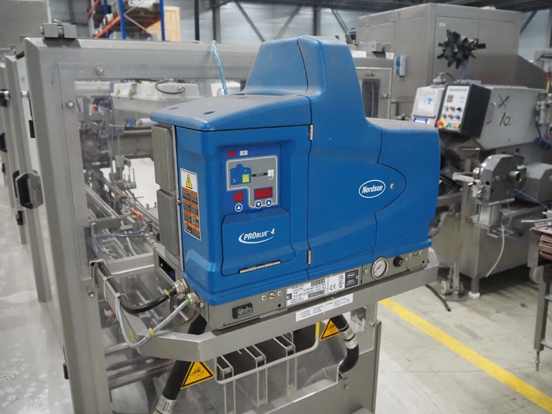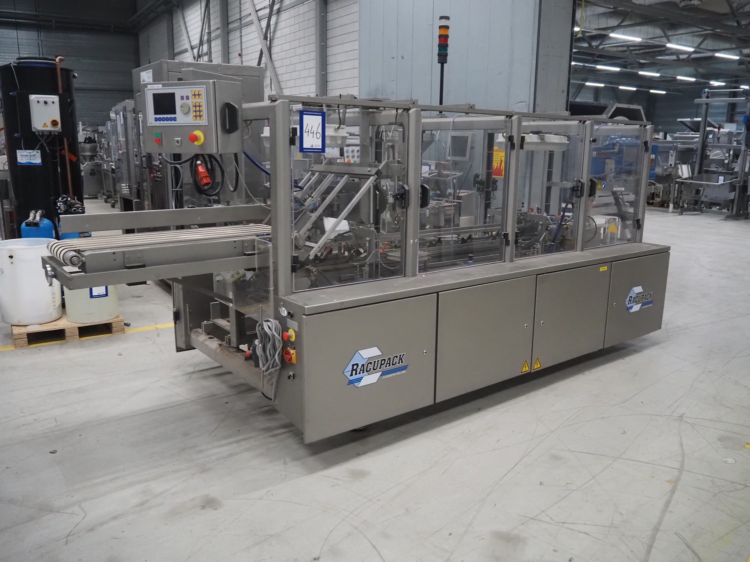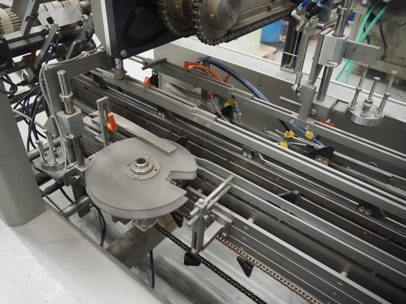 Racupack case packer, type: RTI-Catamaran, serial number: 0405335, year of construction: 2005, 400 V, 3 Ph, 50 Hz, 20 A, 1800 kg, Nordson glue unit, plastic infeed belt, belt width: 300 mm, clearance: 280 mm x 160 mm, chain conveyor with dividers, distance between dividers: 240 mm, divider height: 60 mm, total dimensions: 4650 mm x 1800 mm x 2450 mm.