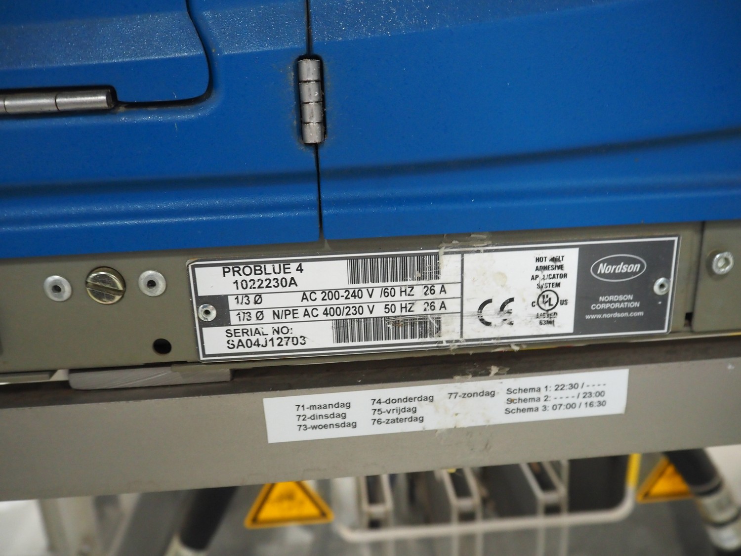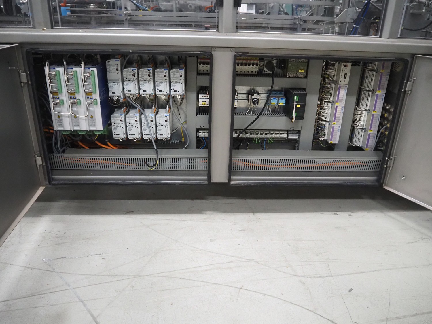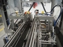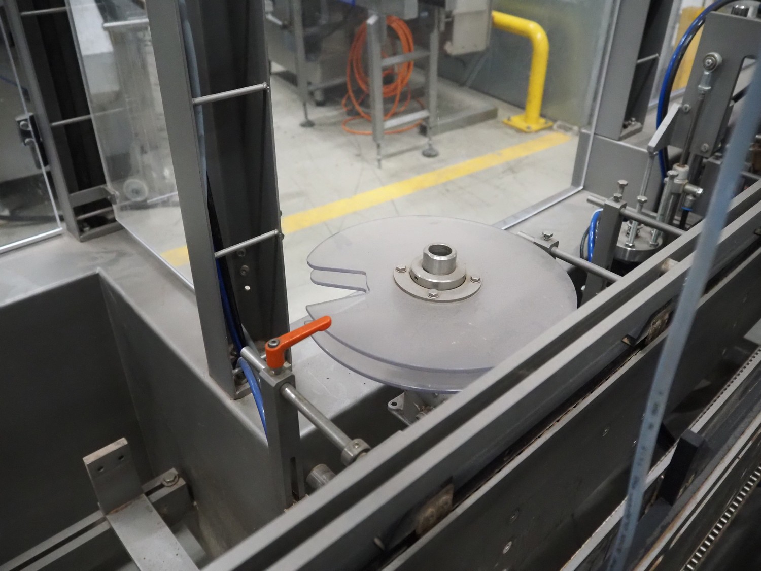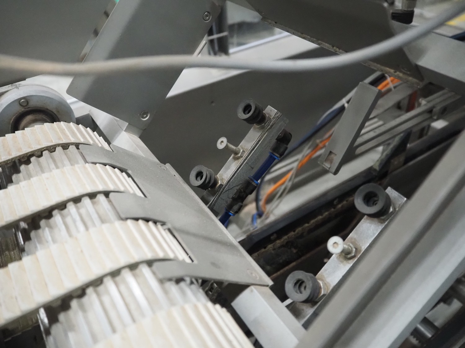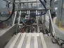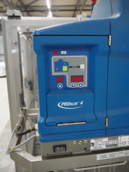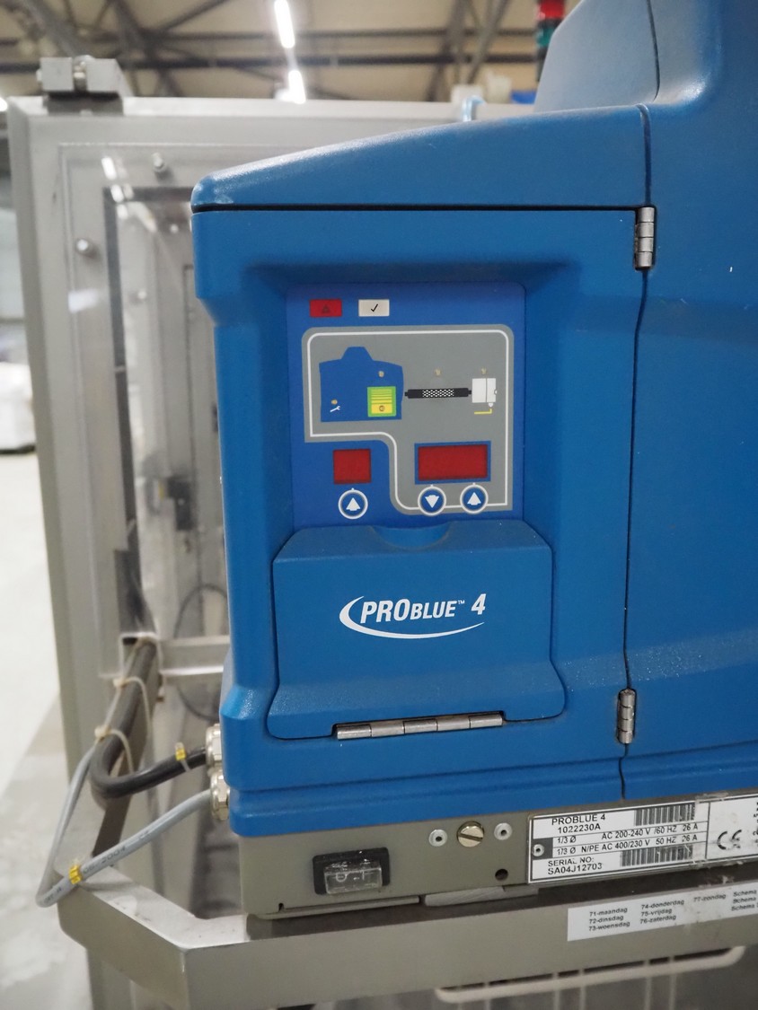 Racupack case packer, type: RTI-Catamaran, serial number: 0405335, year of construction: 2005, 400 V, 3 Ph, 50 Hz, 20 A, 1800 kg, Nordson glue unit, plastic infeed belt, belt width: 300 mm, clearance: 280 mm x 160 mm, chain conveyor with dividers, distance between dividers: 240 mm, divider height: 60 mm, total dimensions: 4650 mm x 1800 mm x 2450 mm.