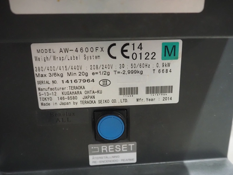 Teraoka Seiko Co., Ltd packaging machine, type: AW-4600FX, serial number: 14167964, year of construction: 2014, 380/400/415/440 V, 3 Ph, 50/60 Hz, 0.9 kW, weighing range: 20g - 3/6 kg, e=1/2g, T=2.999 kg, film width: 400 mm, total dimensions: 950 mm x 860 mm x 1400 mm.