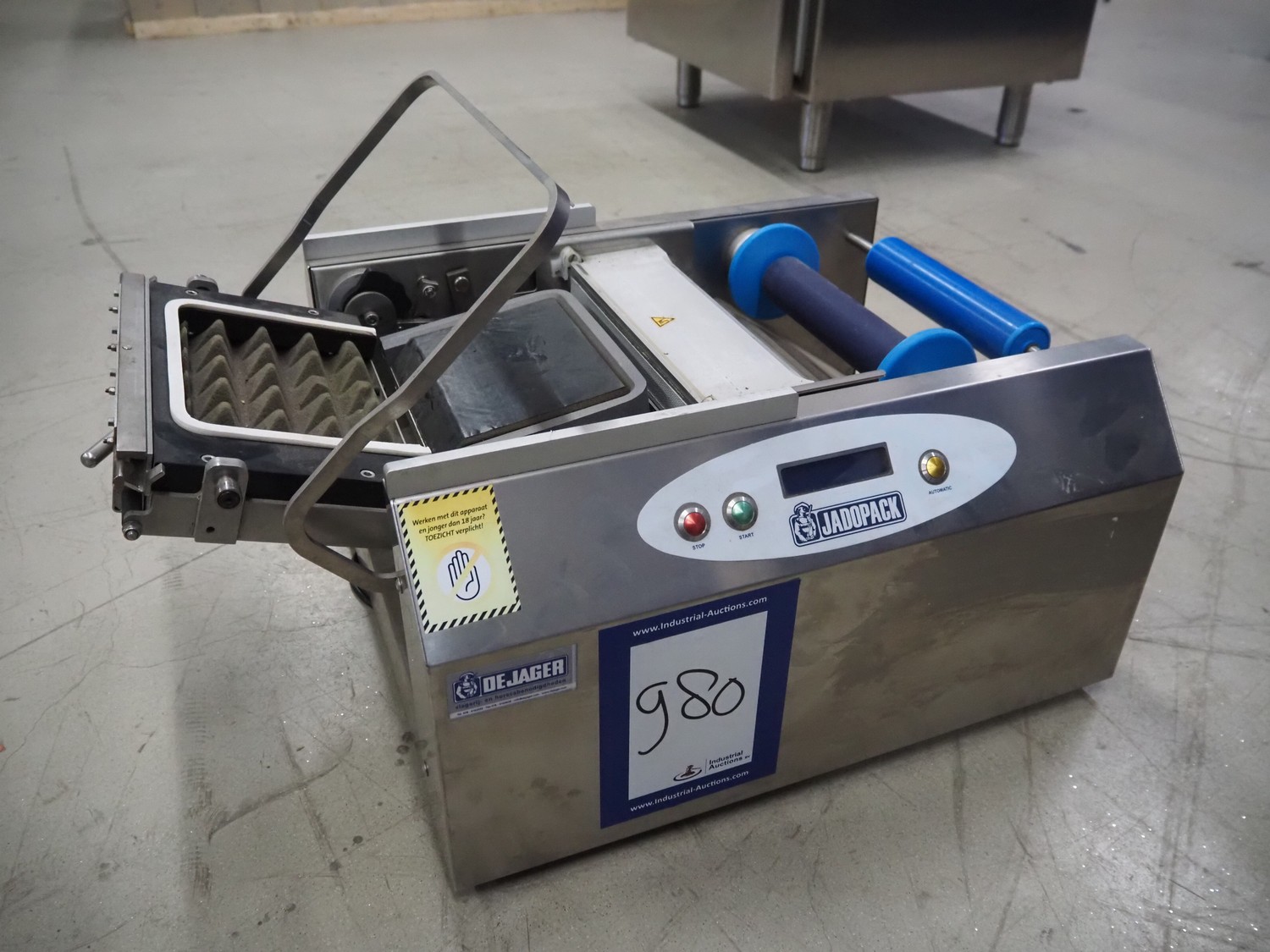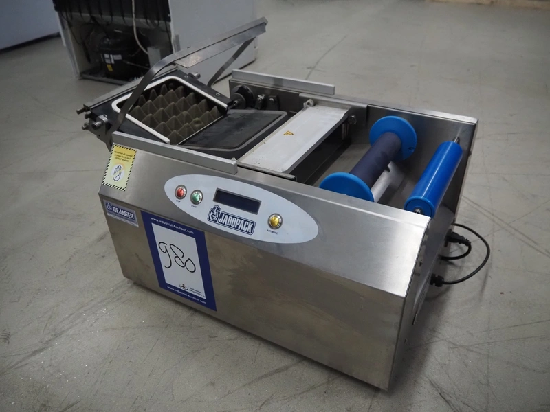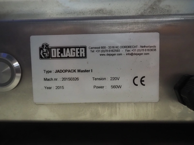 De Jager packaging machine, type: JADOPACK Master I, machine number: 20150326, year of construction: 2015, 220 V, 560 W, film width: 230 mm, seal: 220 mm x 170 mm, total dimensions: 730 mm x 520 mm x 450 mm.