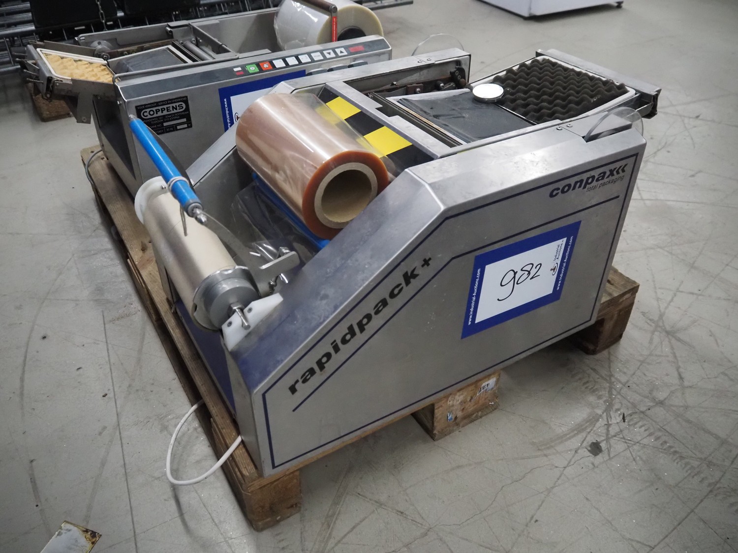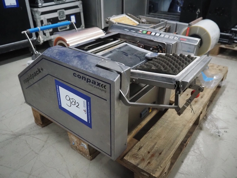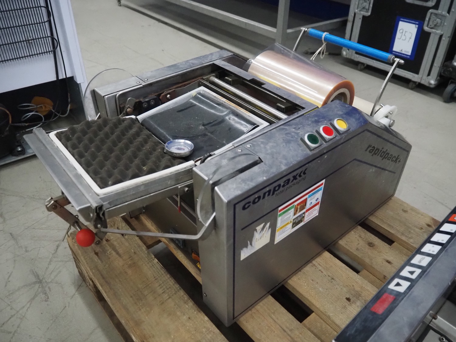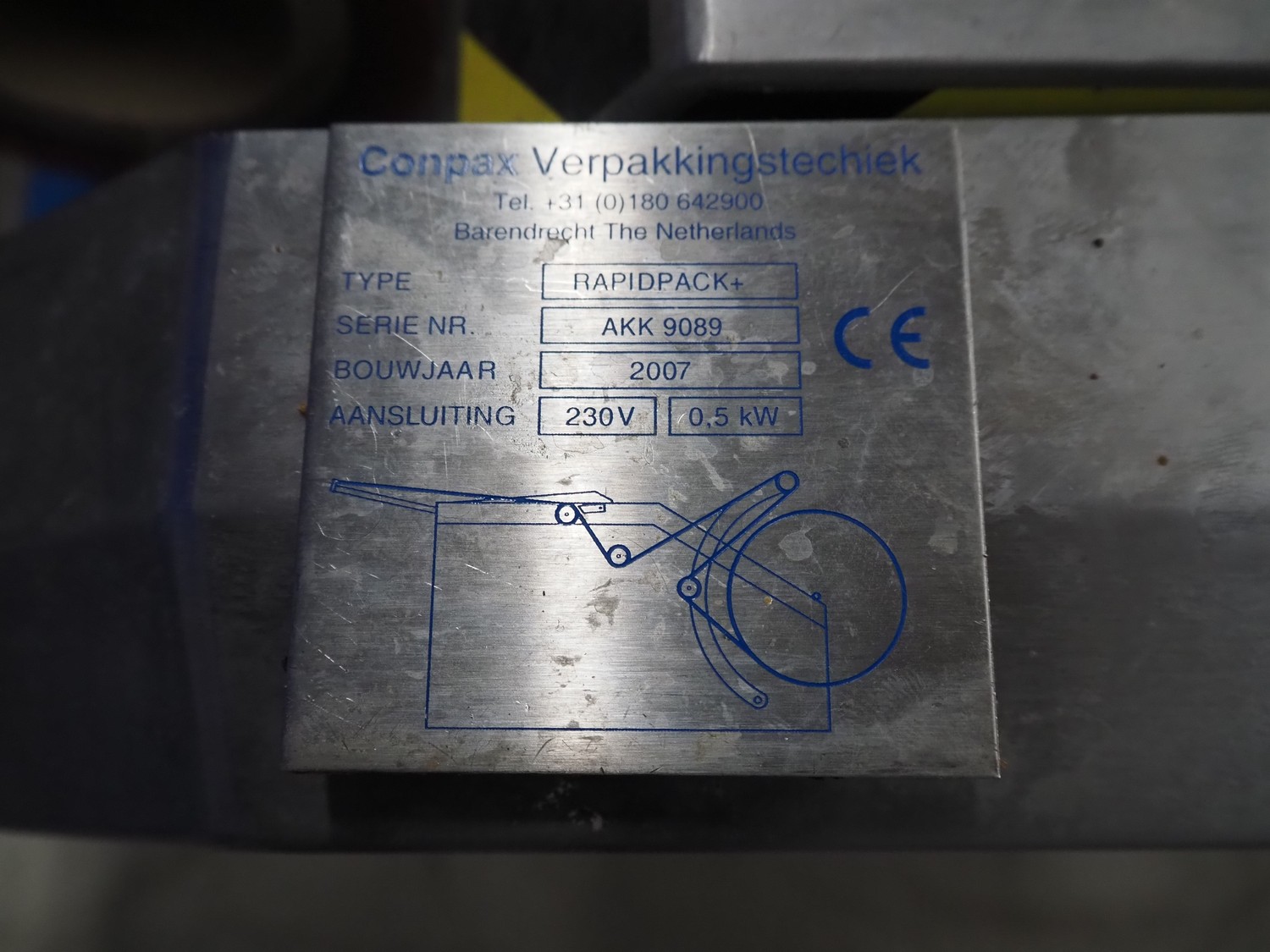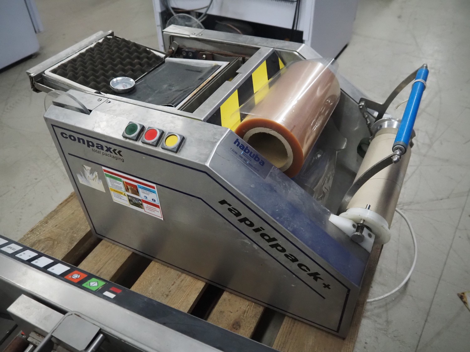 Conpax packaging machine, type: Rapidpack+, serial number: AKK 9089, year of construction: 2007, 230 V, 0.5 kW, film width: 230 mm, seal length: 170 mm x 220 mm, total dimensions: 700 mm x 490 mm x 520 mm.