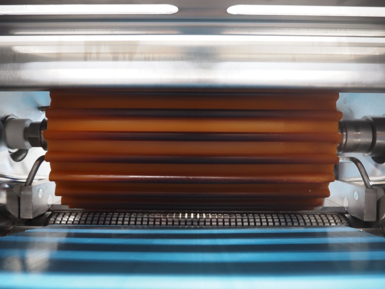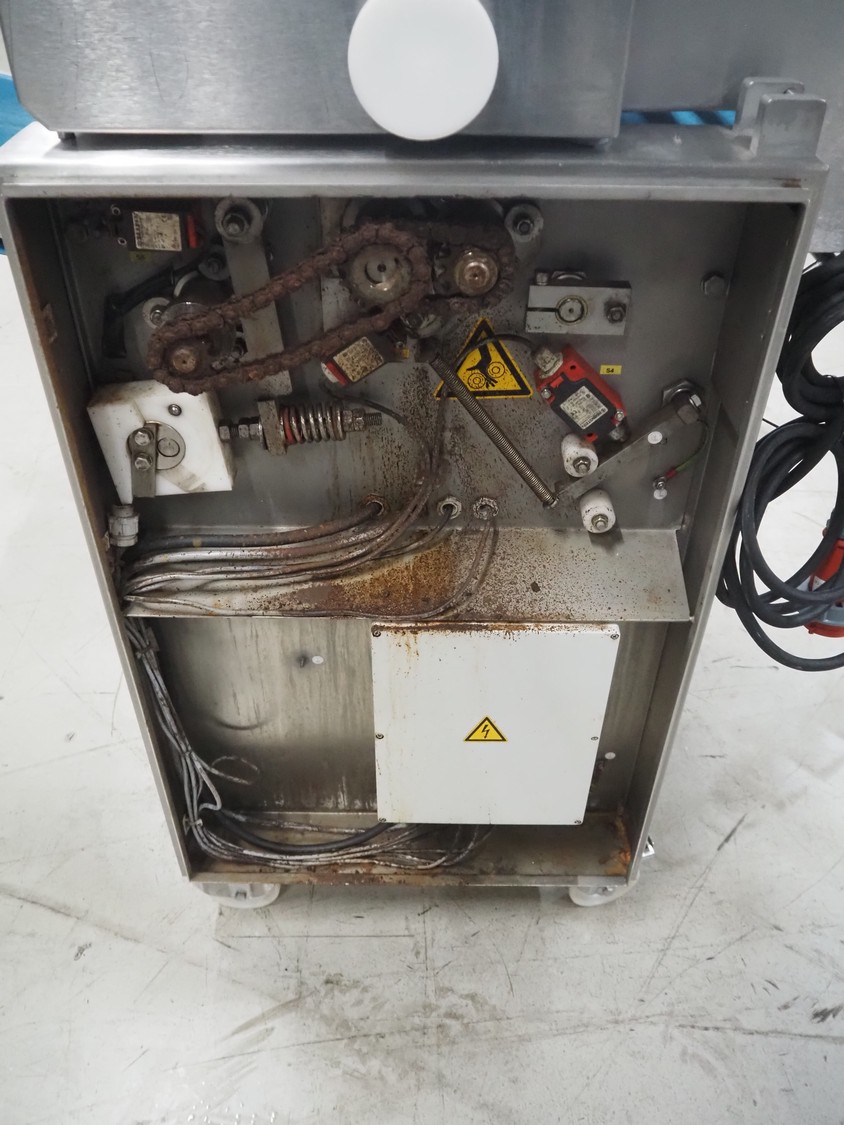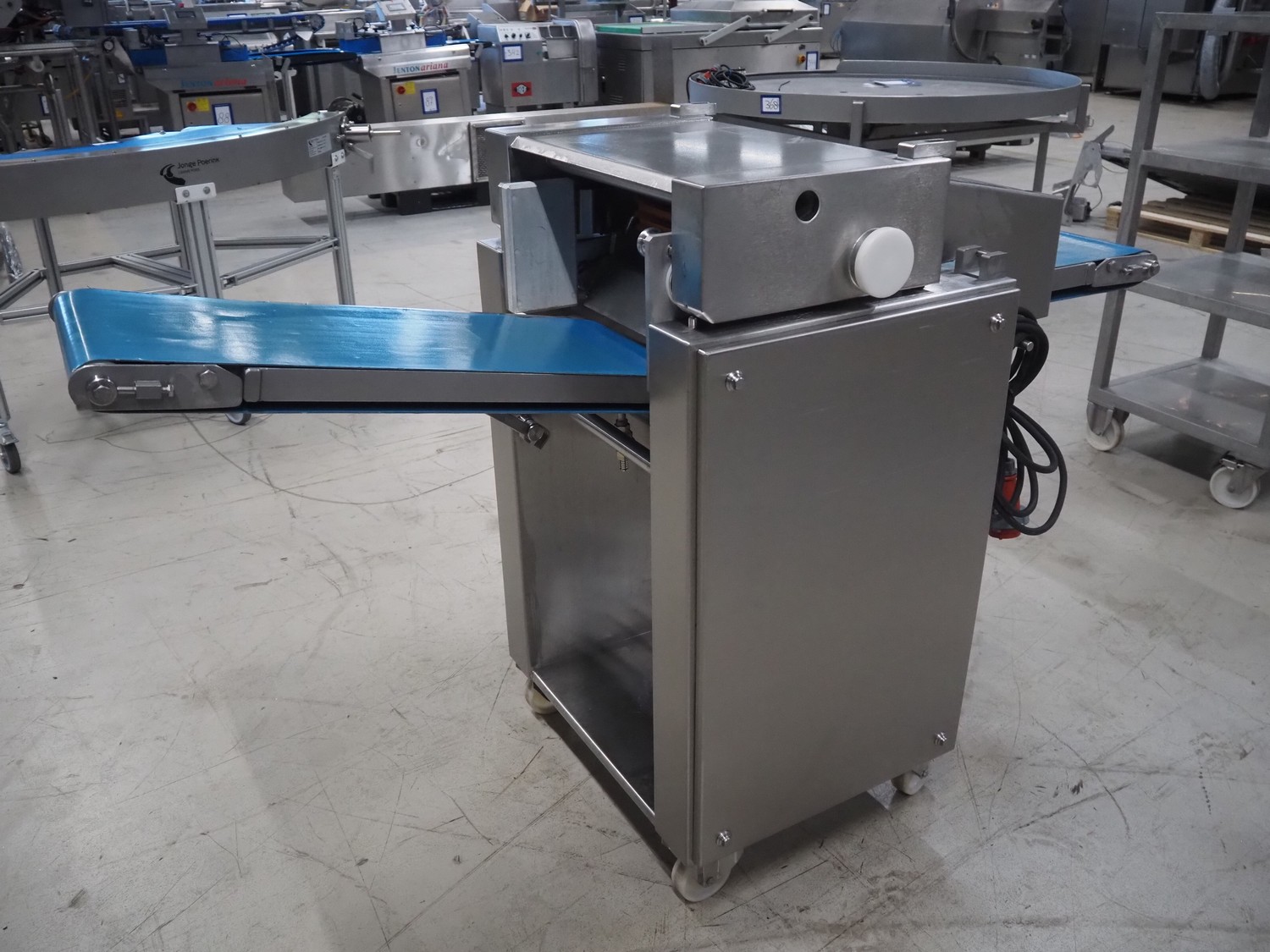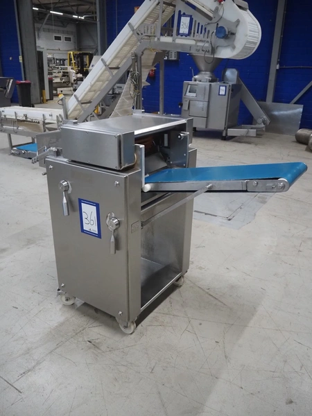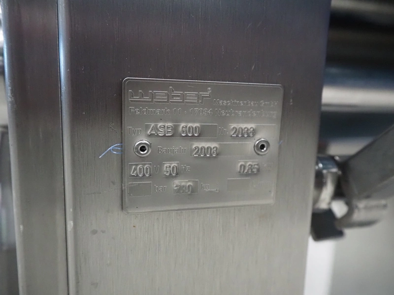 Weber mobile skinning and derinding machine, type: ASB 600, number: 2088, year of construction, 2003, 400 V, 50 Hz, 0.85 kW, weight: 230 kg, plastic belts, belt width: (2x) 320 mm, working width: 390 mm, roll width: 305 mm, total dimensions: 1800 mm x 750 mm x 1180 mm.