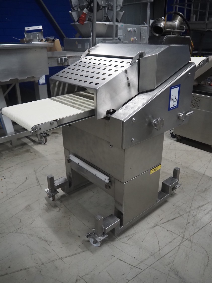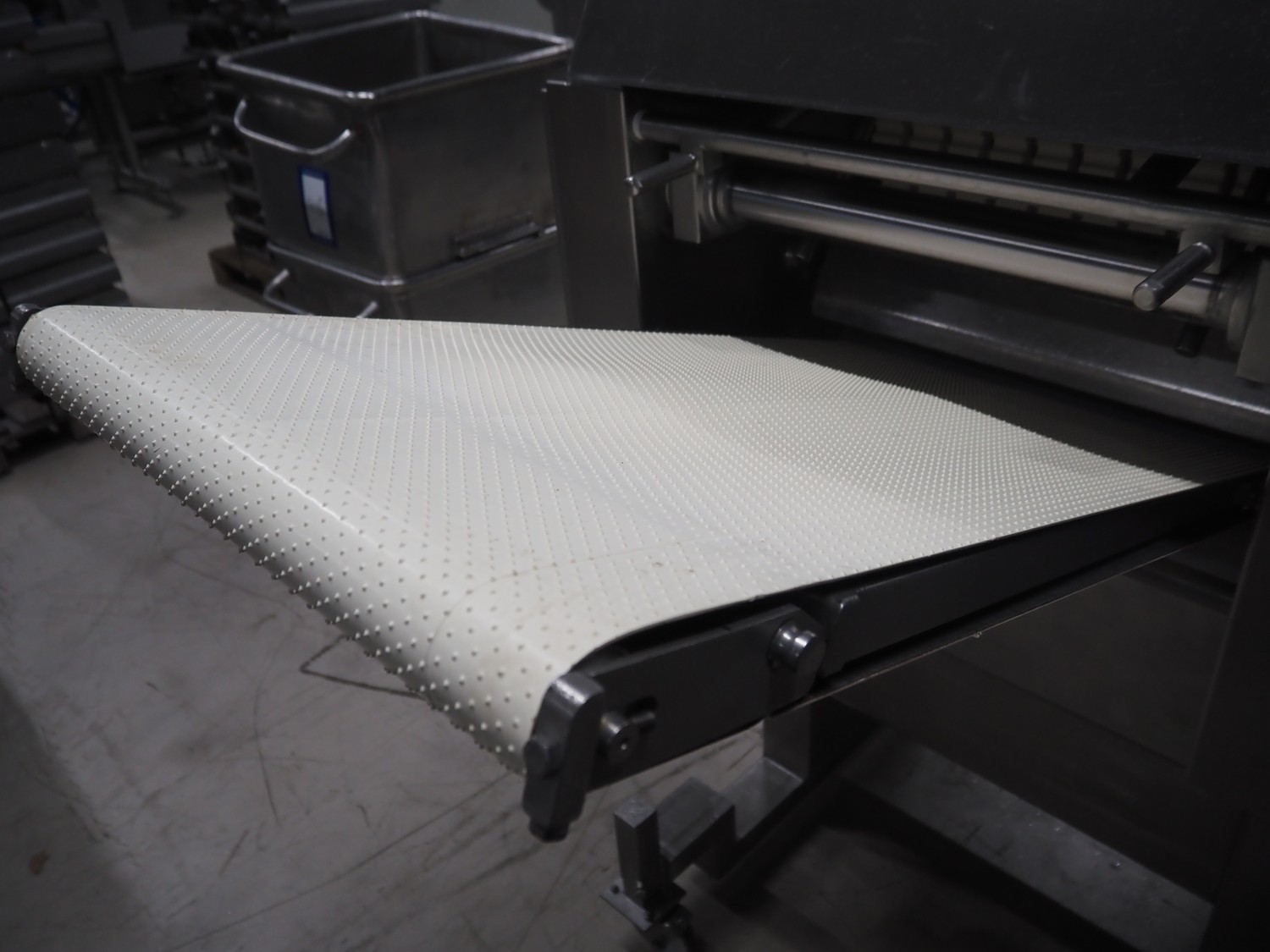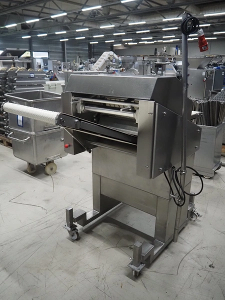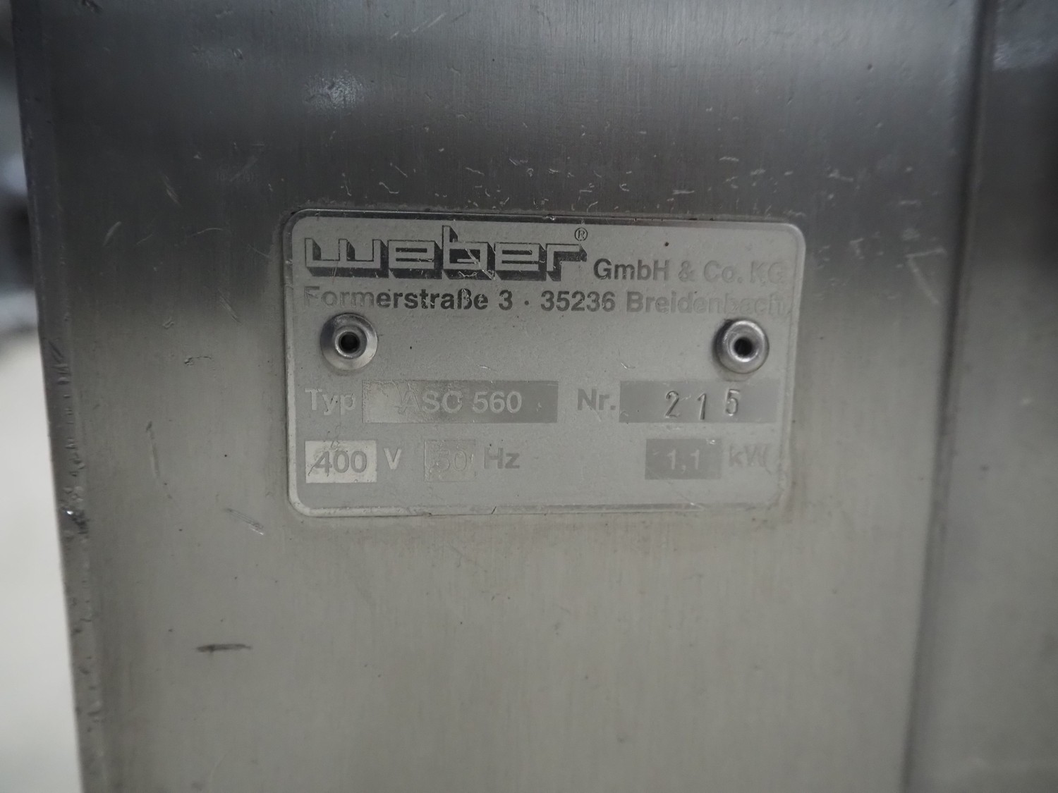 Weber mobile skinning and derinding machine, type: ASC 560, number: 215, 400 V, 50 Hz, 1.1 kW, plastic belt, belt width: 500 mm, working width: 560 mm, total dimensions: 2000 mm x 1050 mm x 1850 mm.