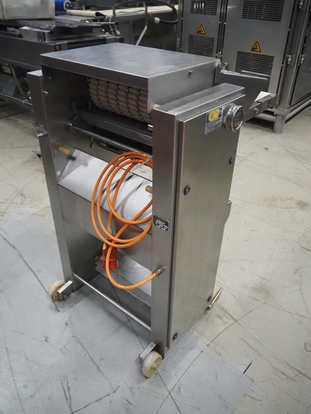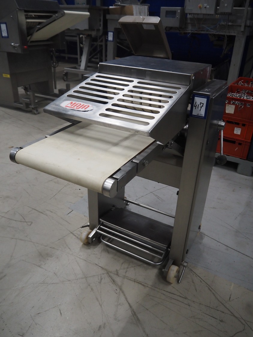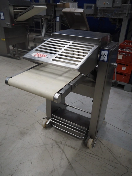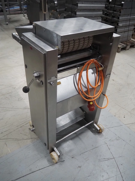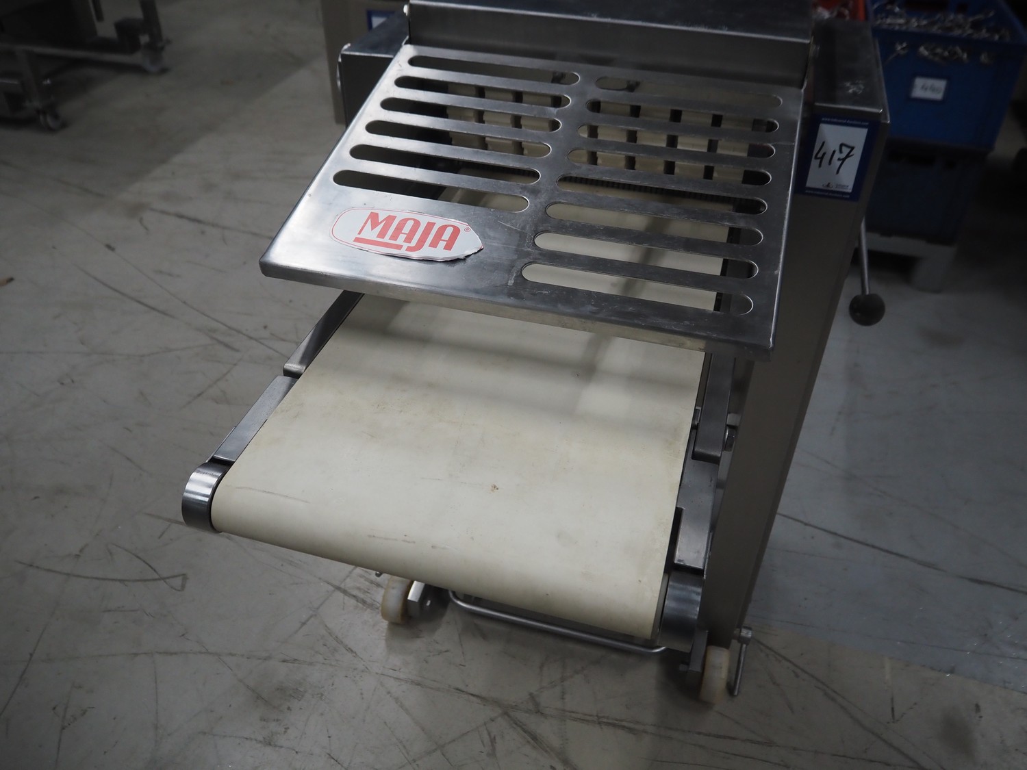 Maja Maschinenfabrik mobile skinning and derinding machine, type: ESB 441 H, number: 38228, year of construction: 1995, 380 V, 3 Ph, 50 Hz, 2.2 A, 0.75 kW, plastic belt, belt width: 370 mm, working width: 400 mm, total dimensions: 950 mm x 850 mm x 1150 mm.
