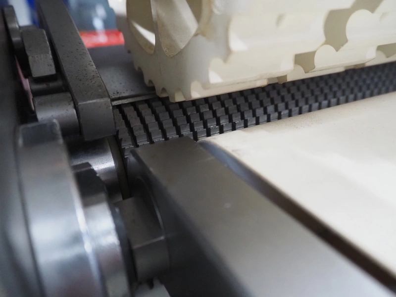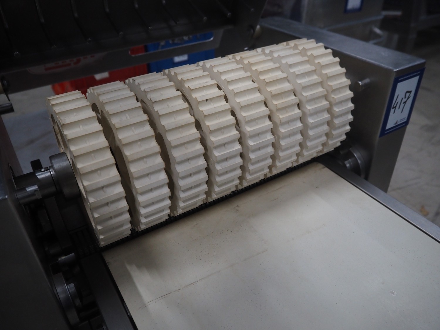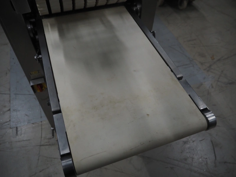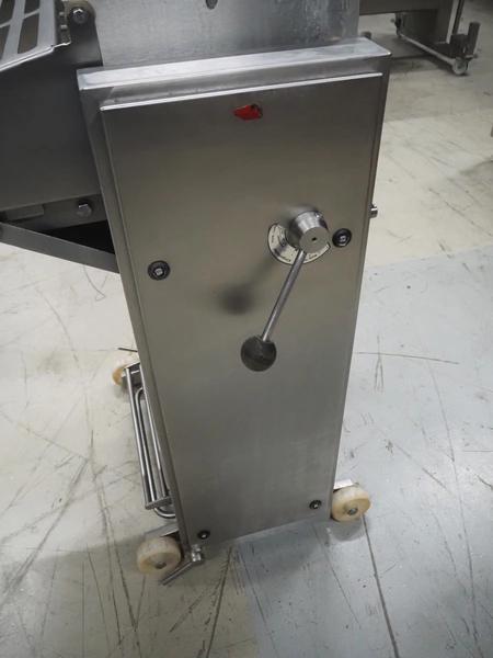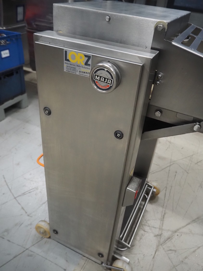 Maja Maschinenfabrik mobile skinning and derinding machine, type: ESB 441 H, number: 38228, year of construction: 1995, 380 V, 3 Ph, 50 Hz, 2.2 A, 0.75 kW, plastic belt, belt width: 370 mm, working width: 400 mm, total dimensions: 950 mm x 850 mm x 1150 mm.