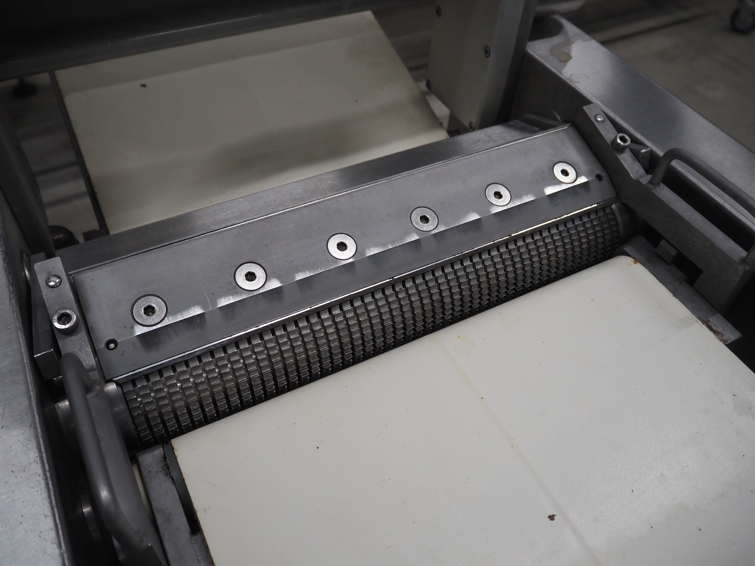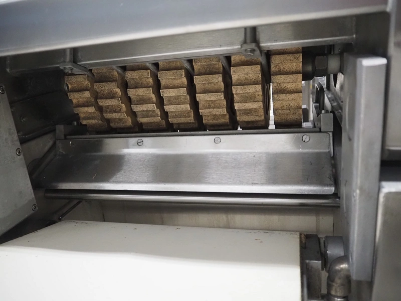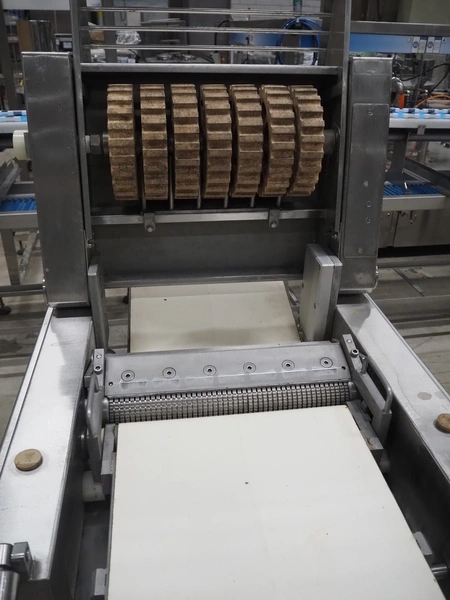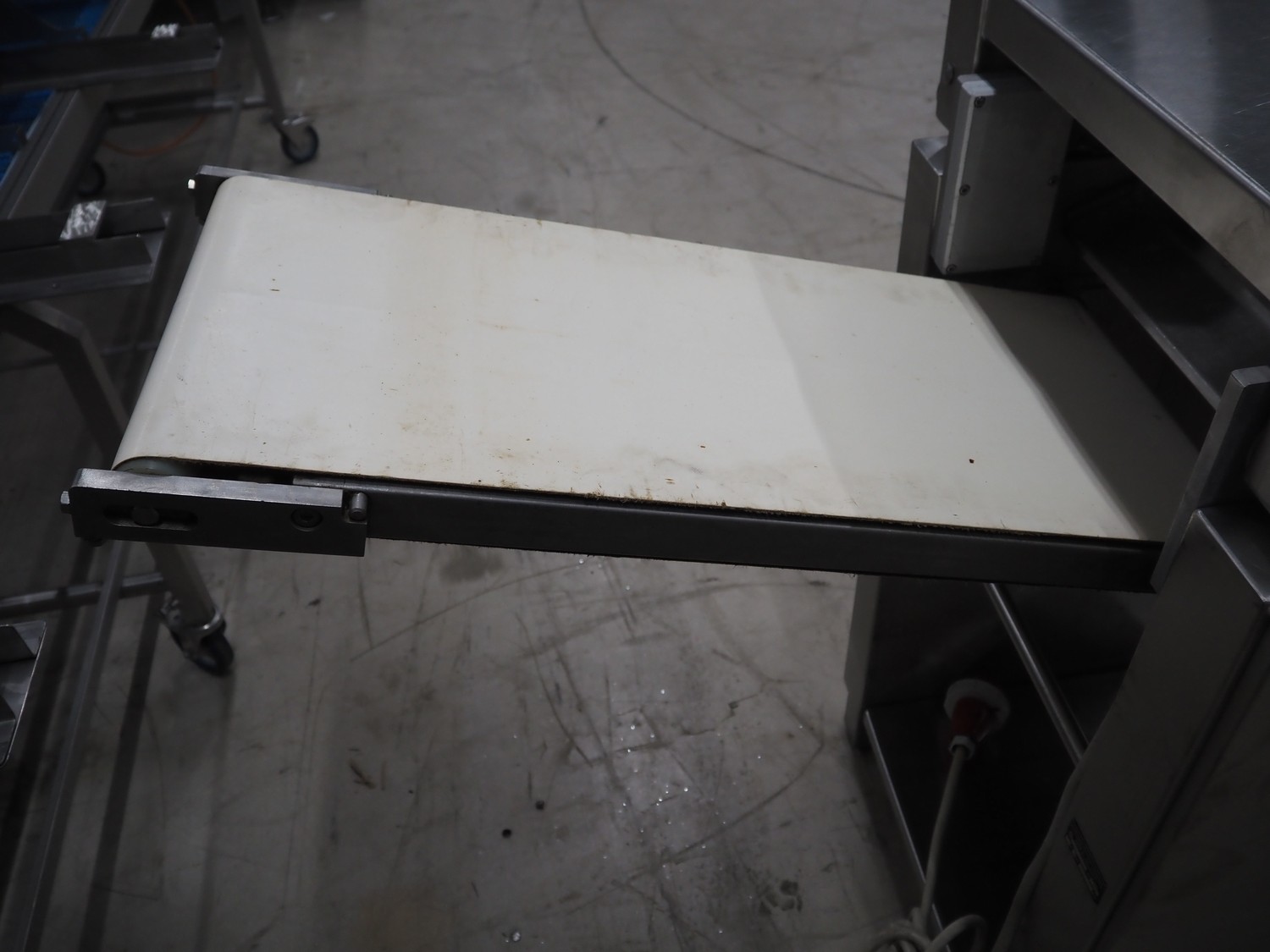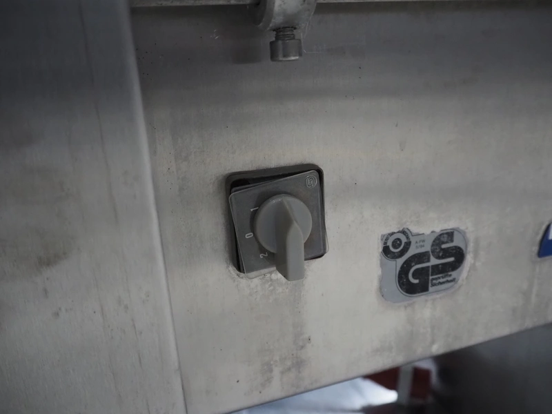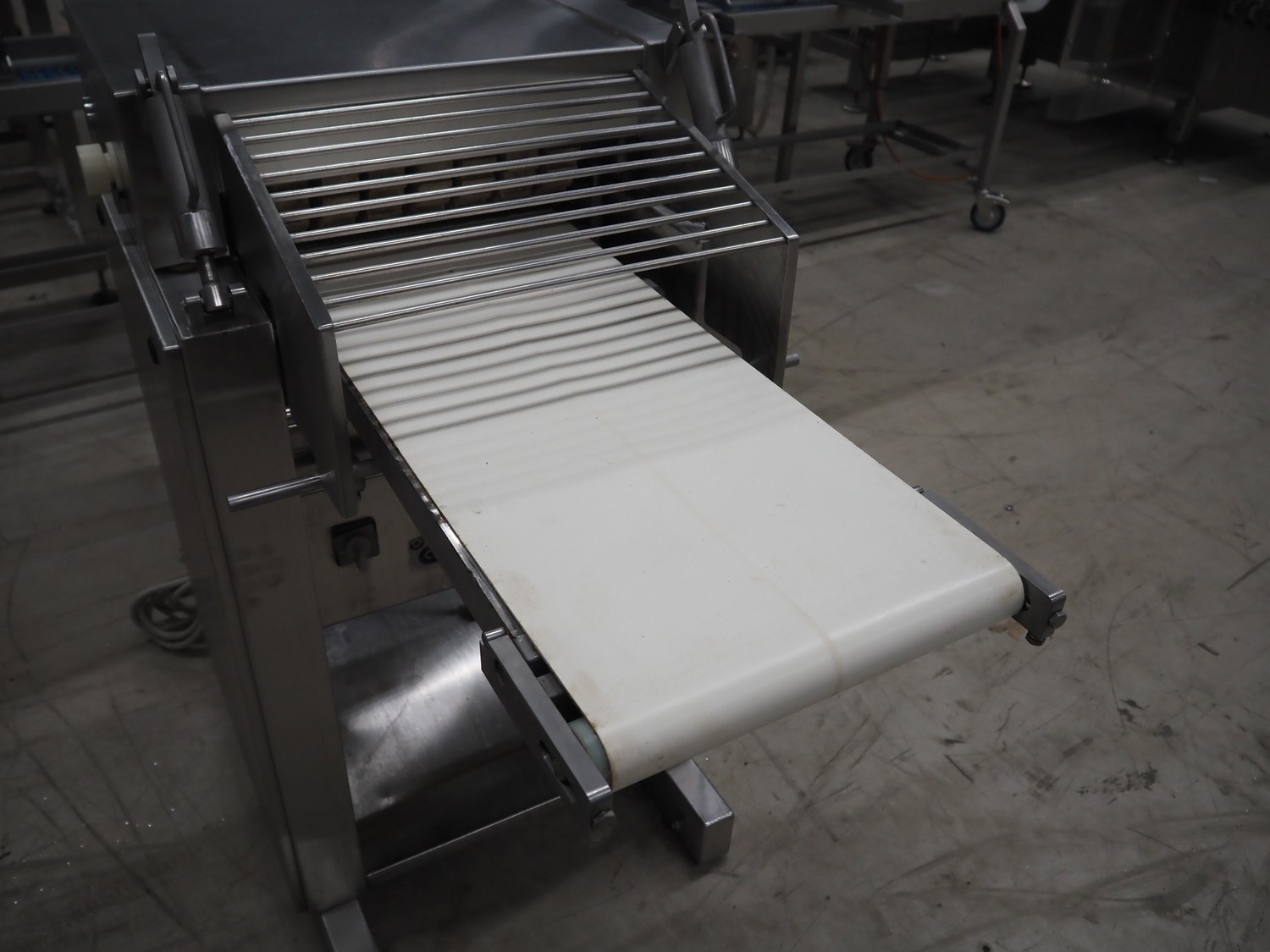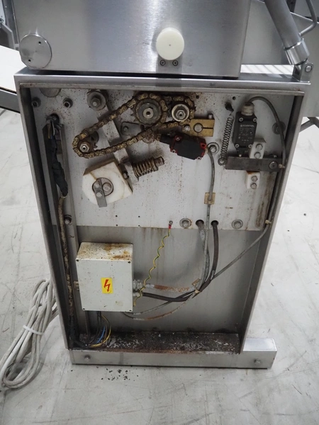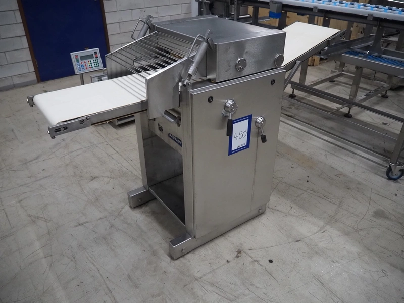 Weber mobile skinning and derinding machine, type: ASK600, number: 318, 380 V, 50 Hz, 0.60/0.75 kW, plastic belts, belt width: 350 mm, working width: 380 mm, total dimensions: 1850 mm x 650 mm x 1150 mm.
