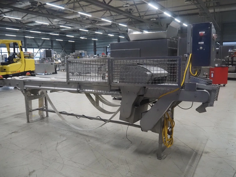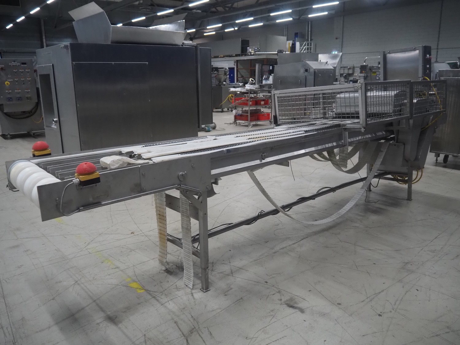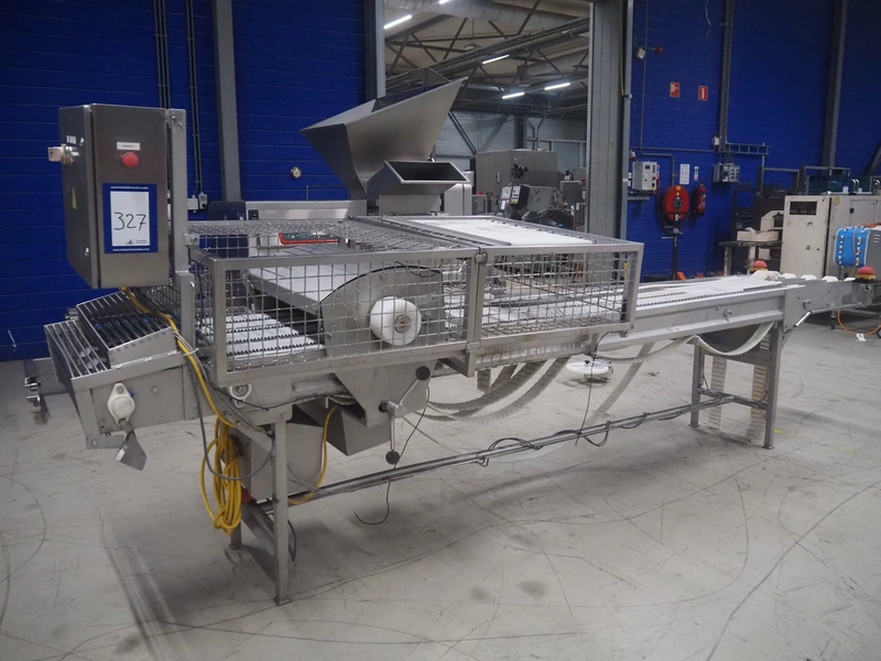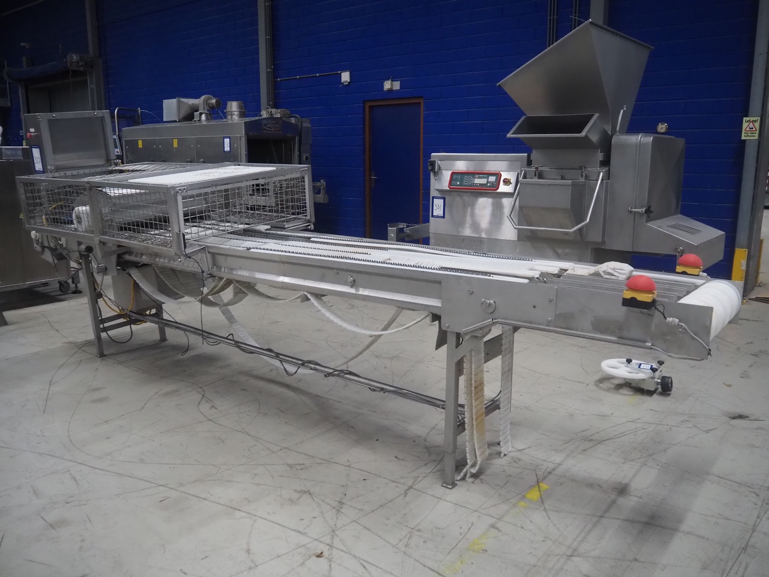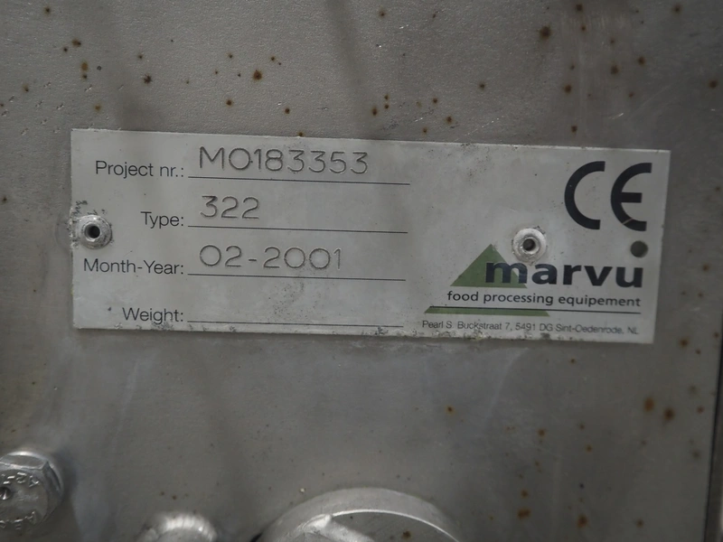 Marvu slicer, type: 322, year of construction: 02-2001, 4 knives ,diameter knives: 170 mm, plastic mesh belt, belt width: (3x) 90 mm and (2x) 60 mm, total dimensions: 4500 mm x 1000 mm x 1700 mm.