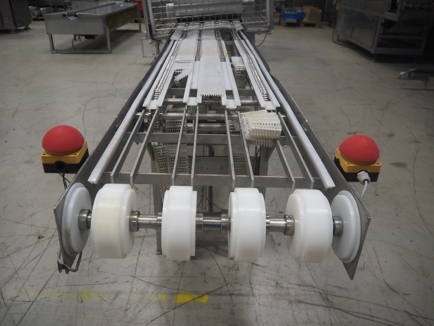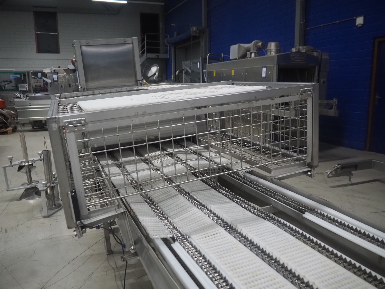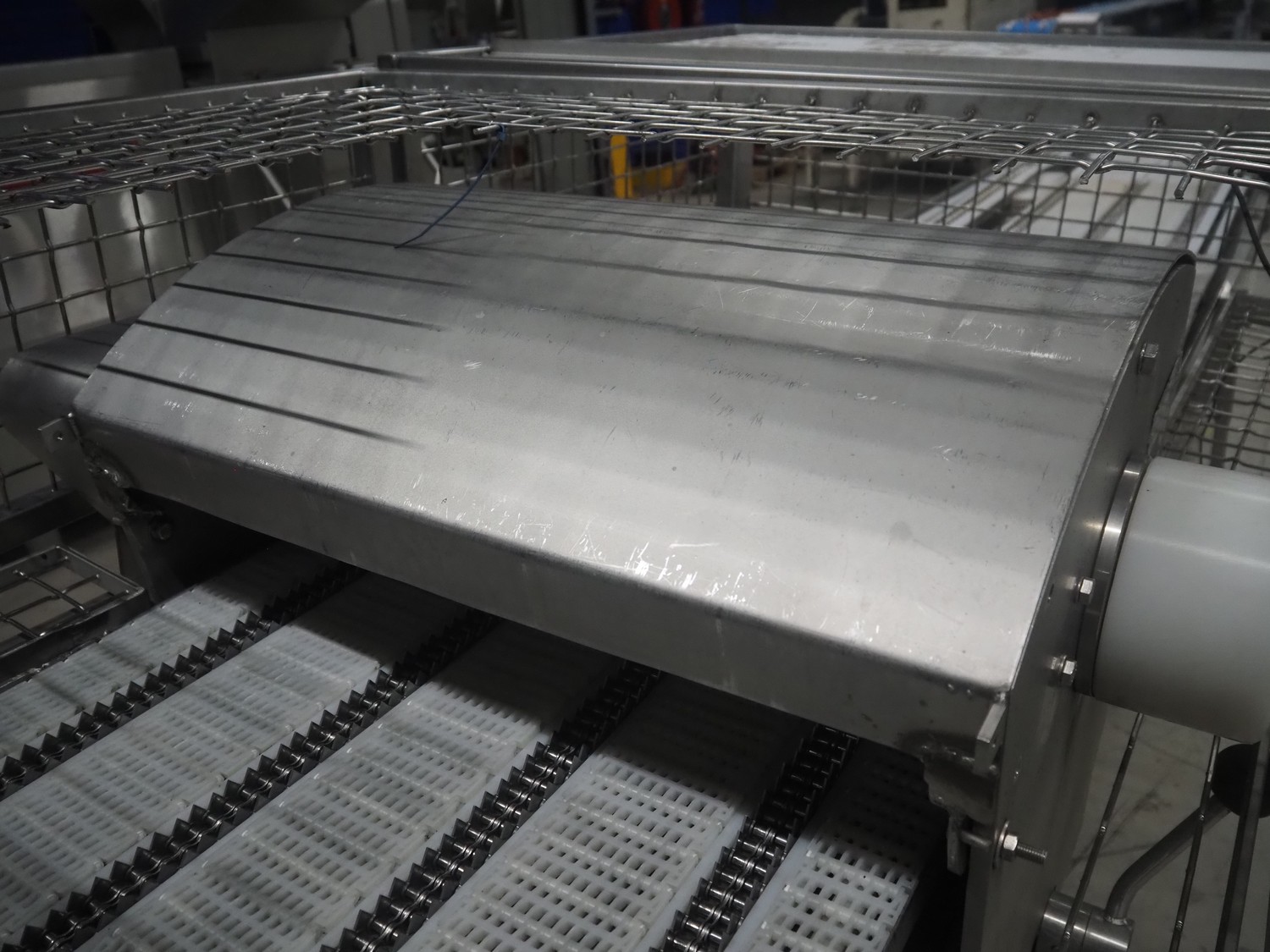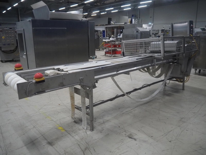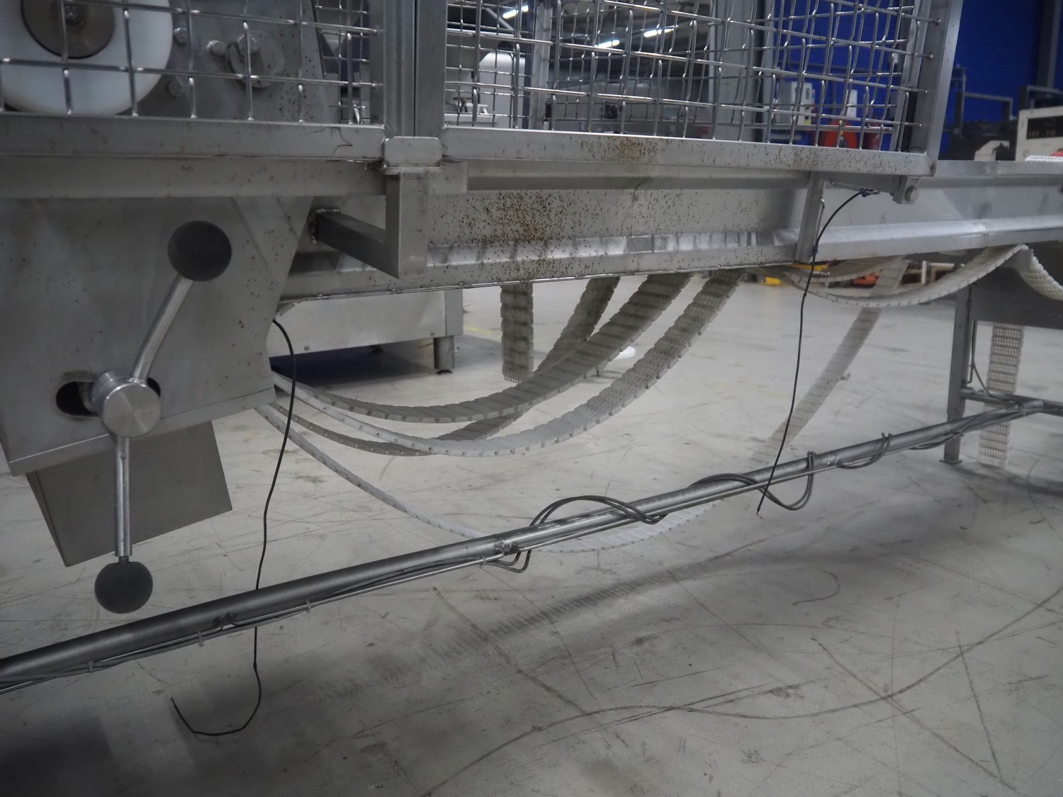 Marvu slicer, type: 322, year of construction: 02-2001, 4 knives ,diameter knives: 170 mm, plastic mesh belt, belt width: (3x) 90 mm and (2x) 60 mm, total dimensions: 4500 mm x 1000 mm x 1700 mm.