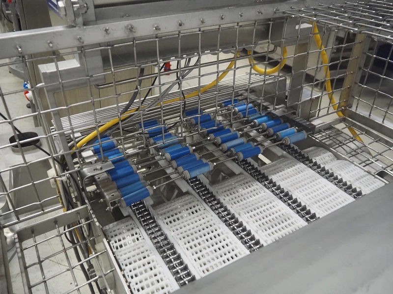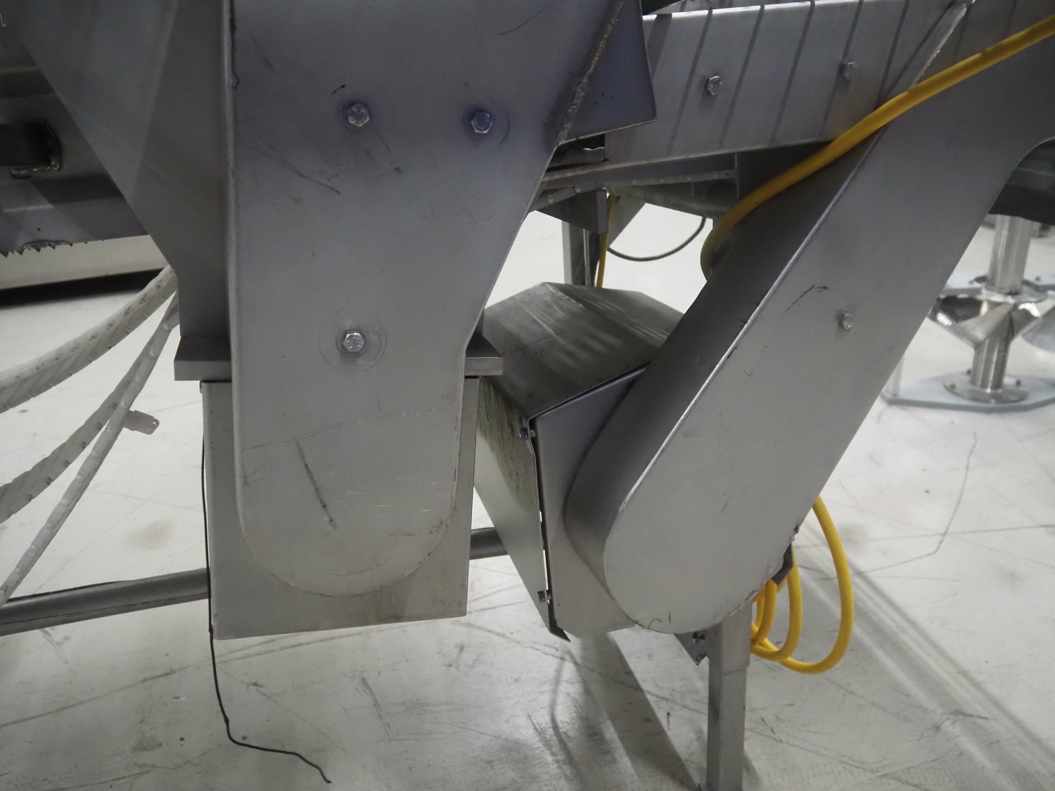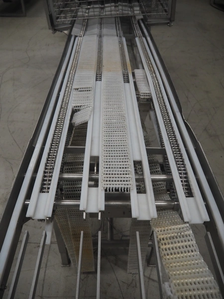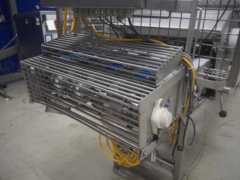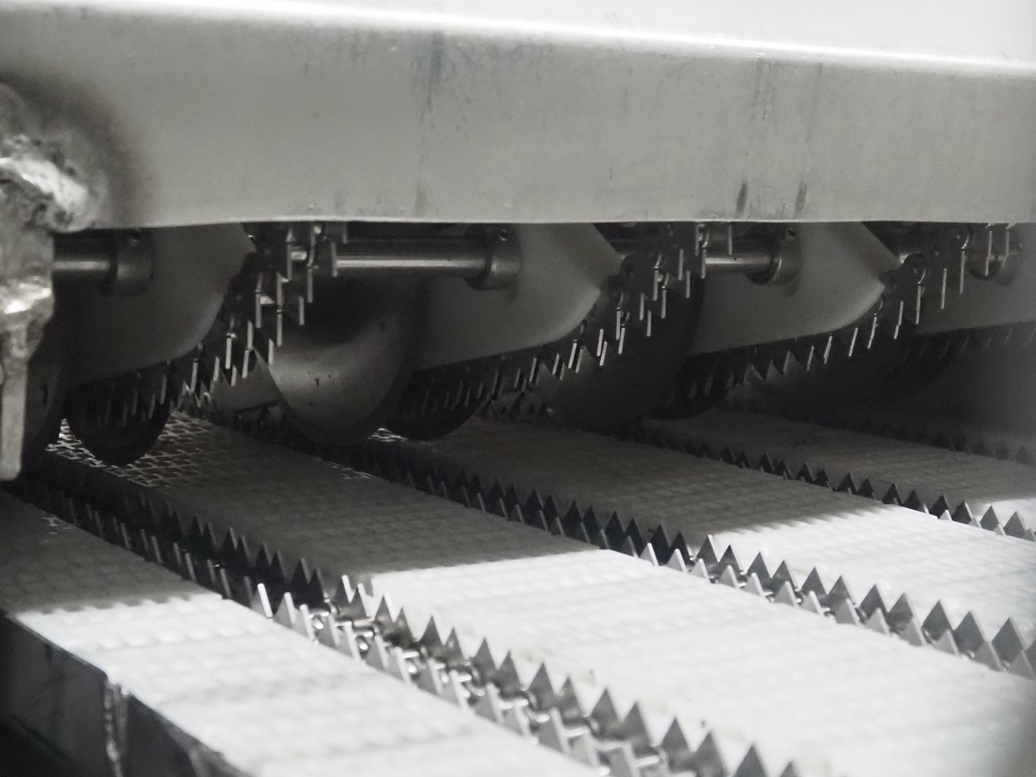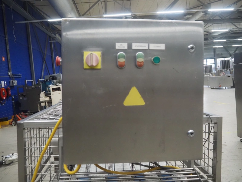 Marvu slicer, type: 322, year of construction: 02-2001, 4 knives ,diameter knives: 170 mm, plastic mesh belt, belt width: (3x) 90 mm and (2x) 60 mm, total dimensions: 4500 mm x 1000 mm x 1700 mm.