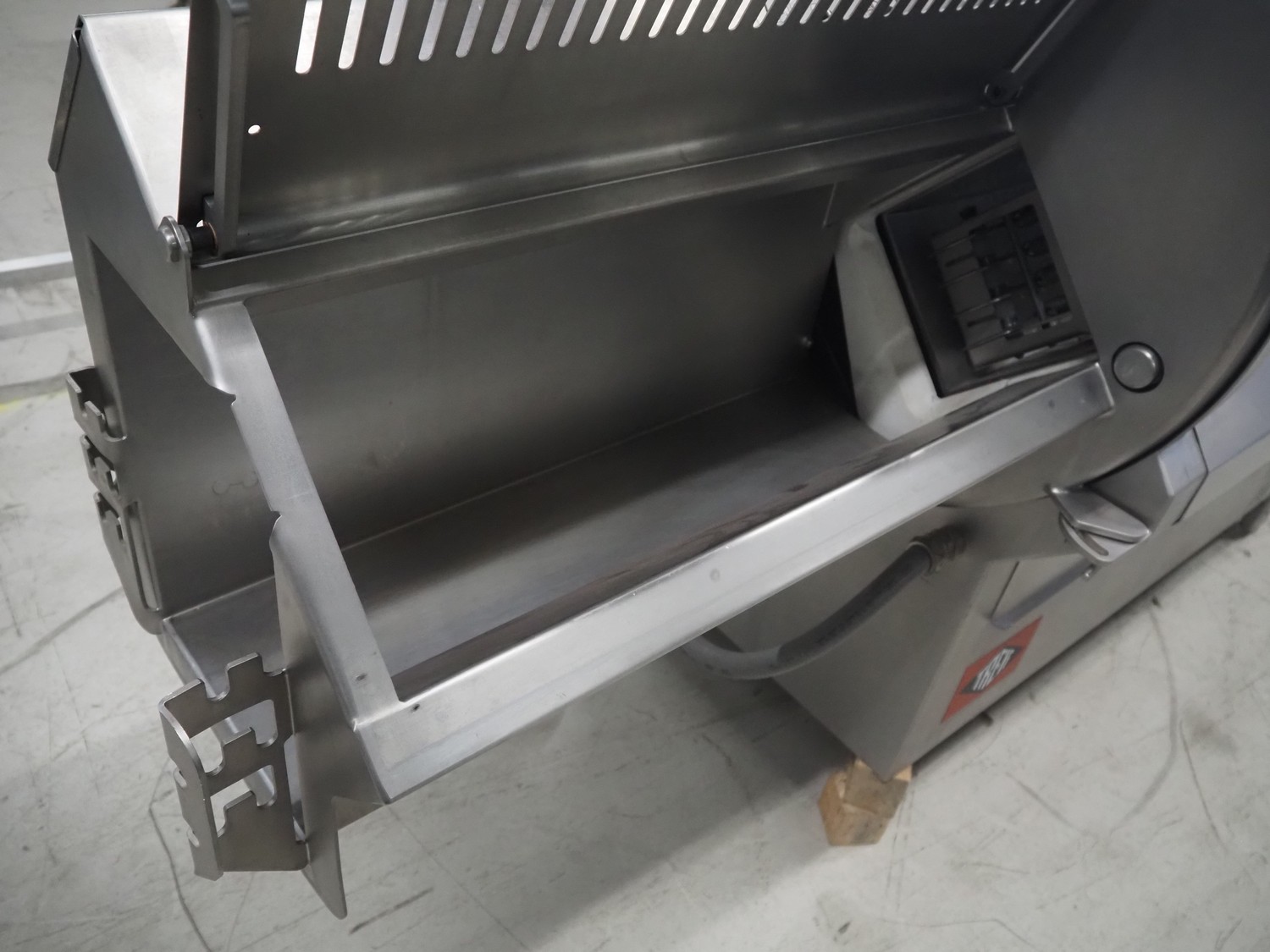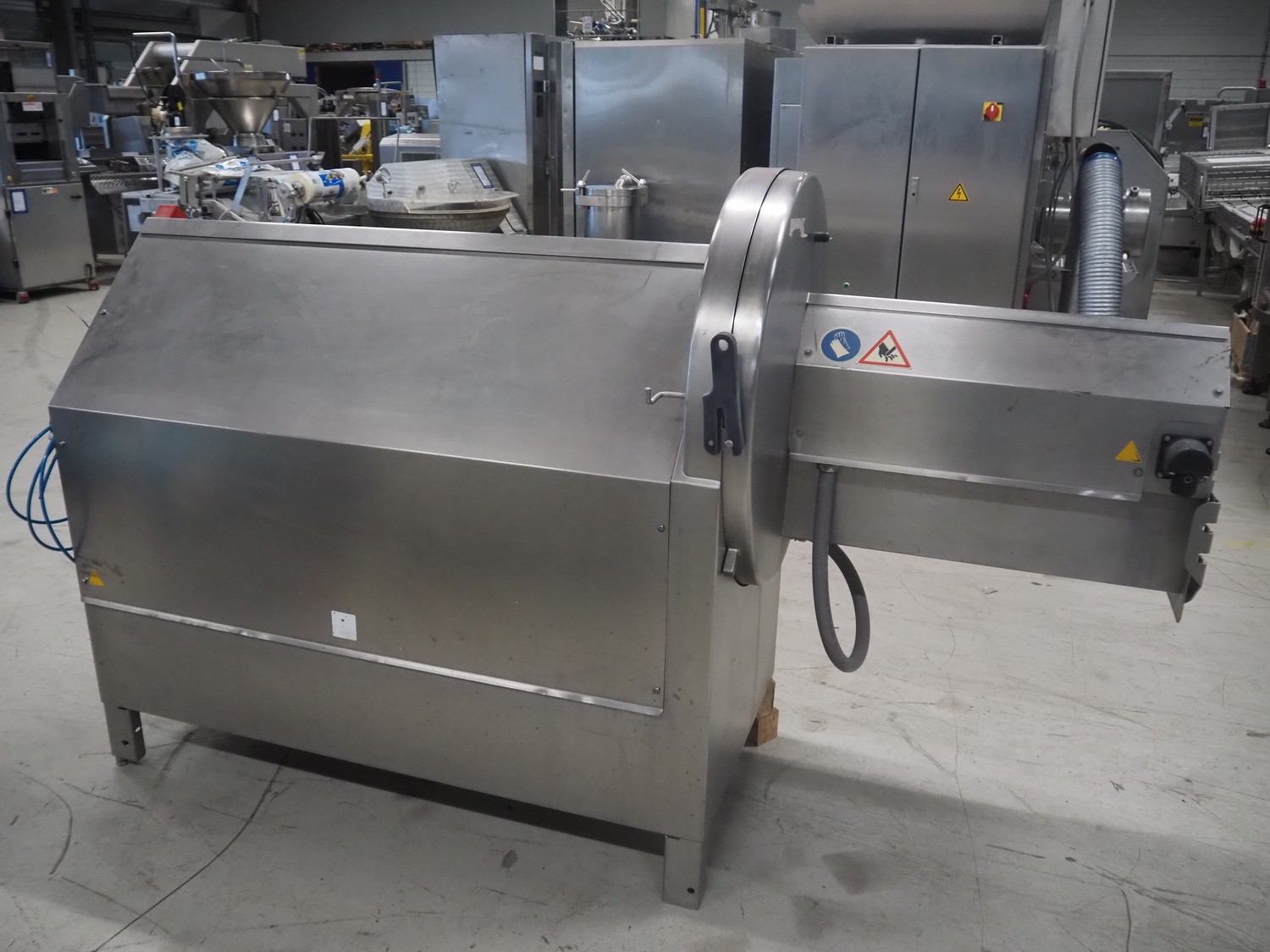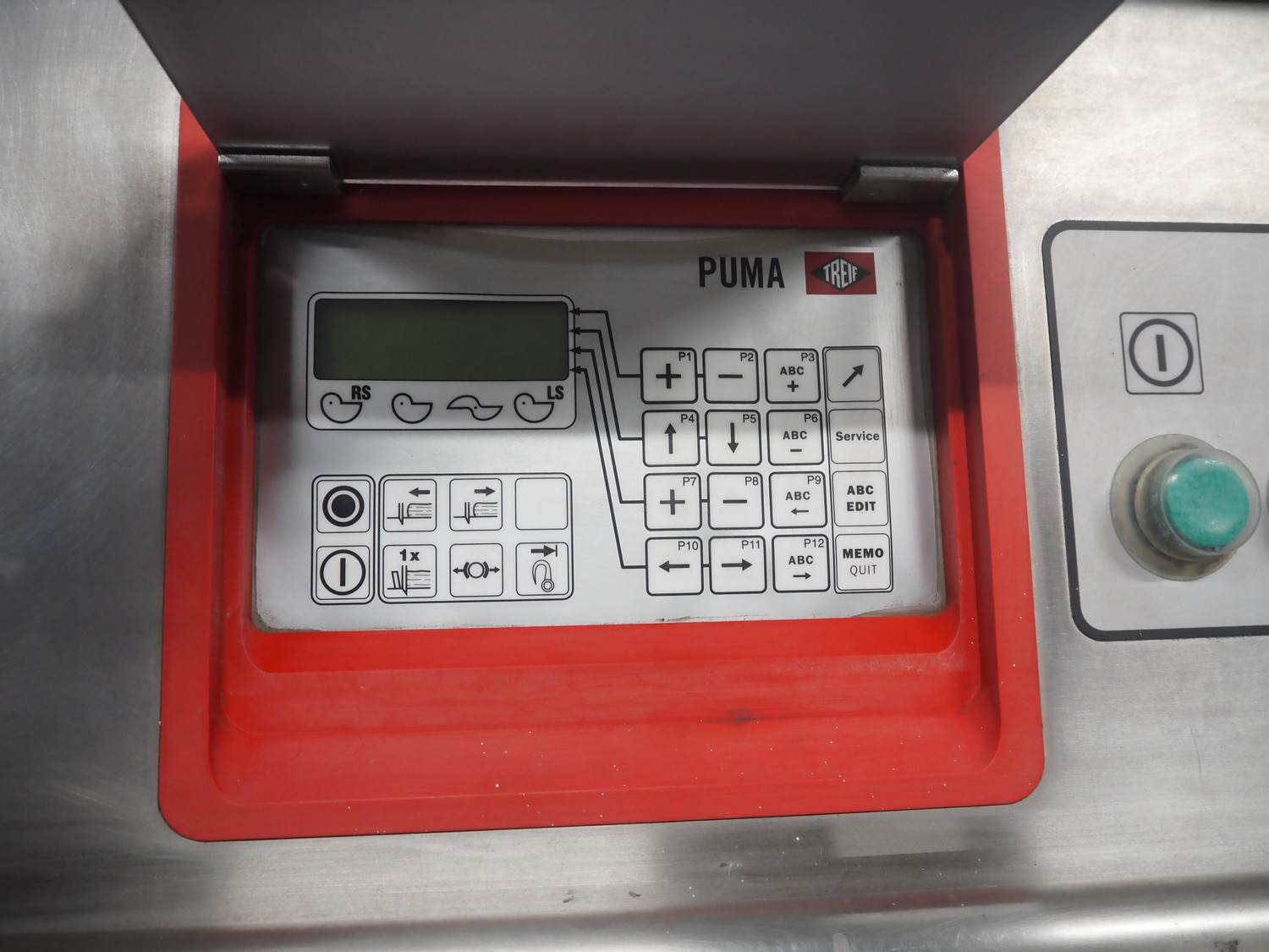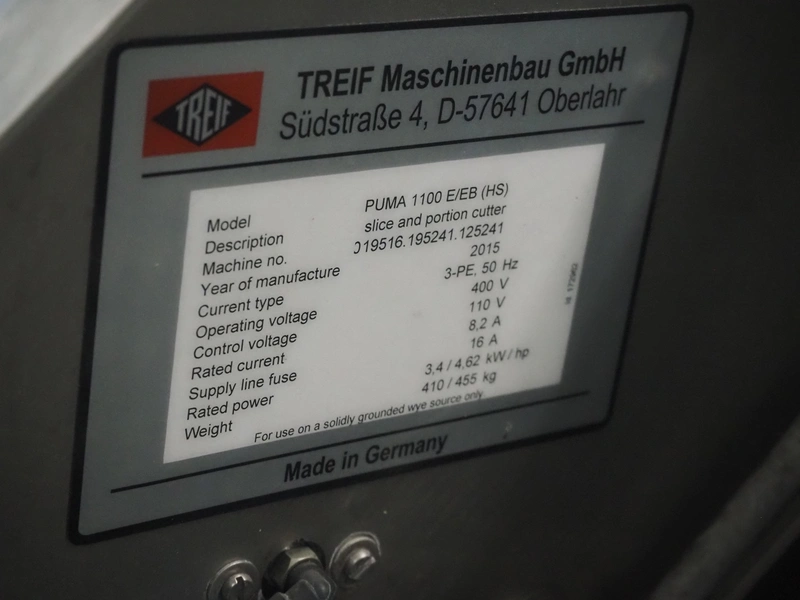 Treif Maschinenbau GmbH slicer, model: Puma 1100 E/EB (HS), machine number: 019516.195241.125241, year of construction: 2015, 400 V, 3 Ph, 50 Hz, 8.2 A, 3.4 kW, 455 kg, dimensions chamber: 230 mm x 210 mm, total dimensions: 2530 mm x 900 mm x 1430 mm. Outfeed belt damaged.