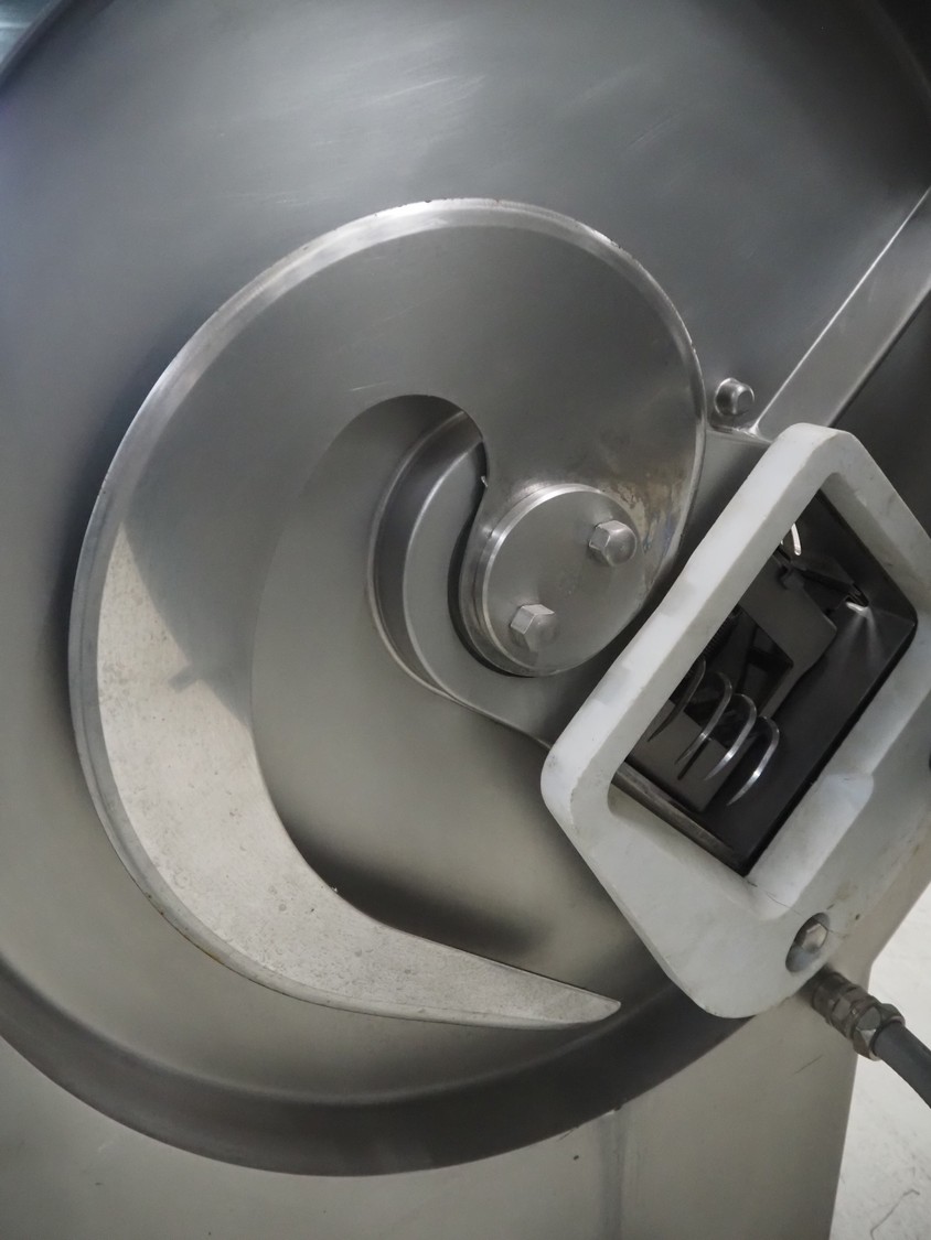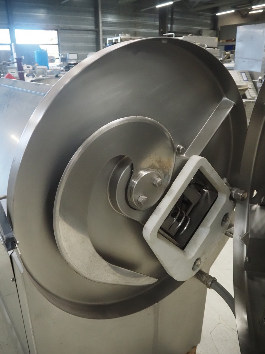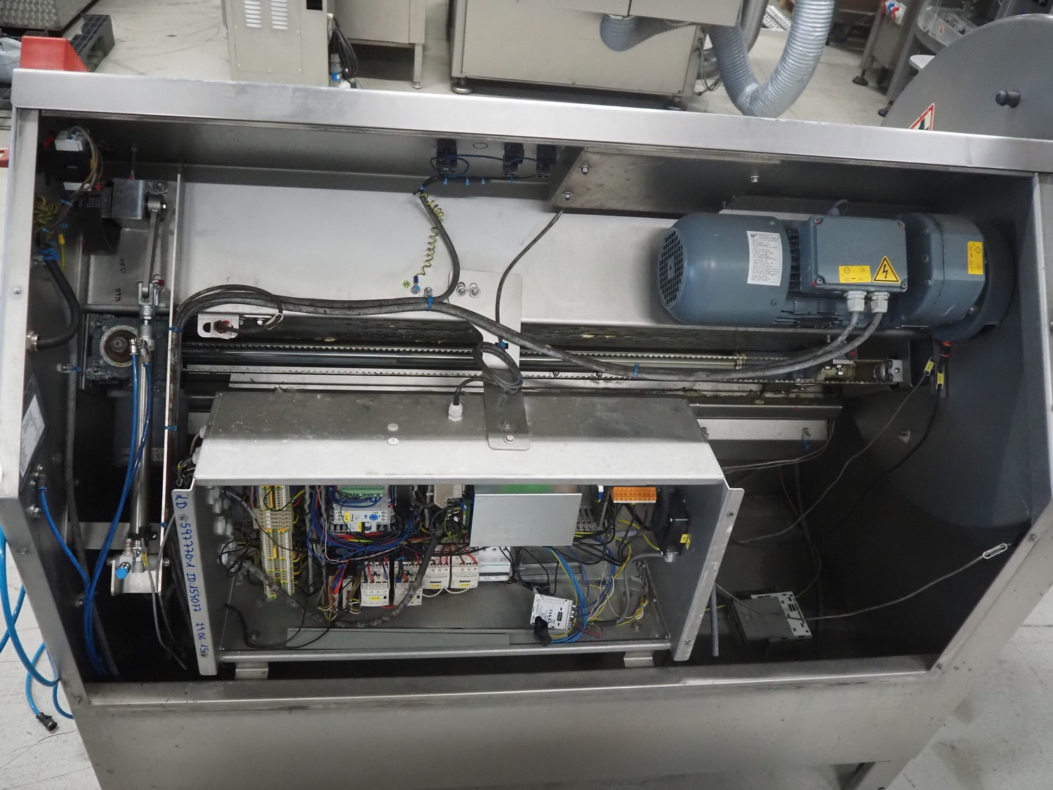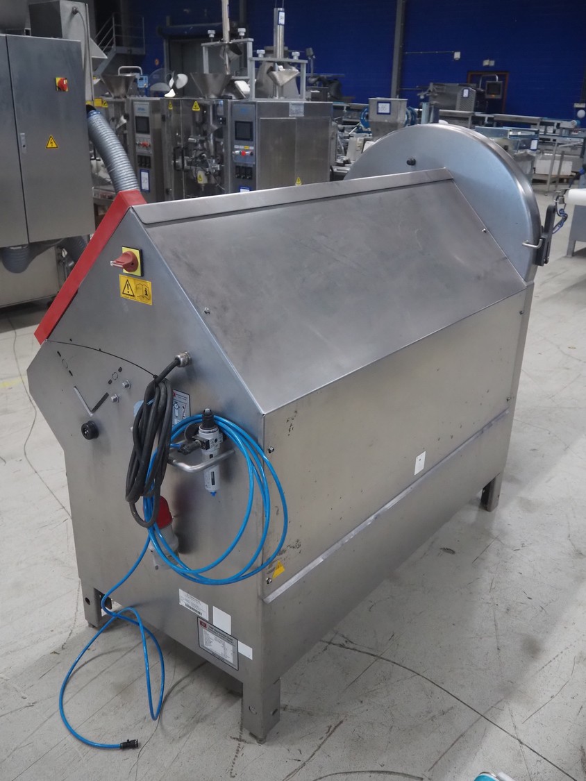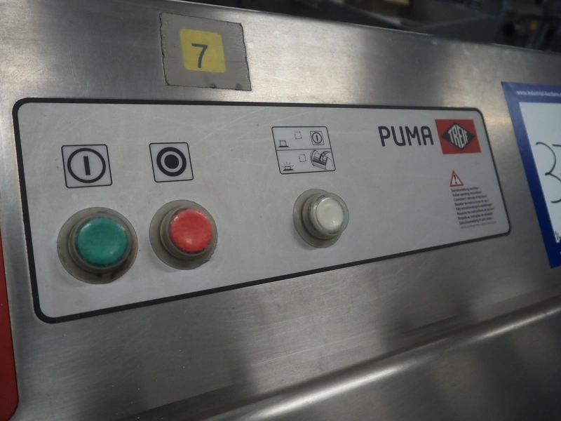 Treif Maschinenbau GmbH slicer, model: Puma 1100 E/EB (HS), machine number: 019516.195241.125241, year of construction: 2015, 400 V, 3 Ph, 50 Hz, 8.2 A, 3.4 kW, 455 kg, dimensions chamber: 230 mm x 210 mm, total dimensions: 2530 mm x 900 mm x 1430 mm. Outfeed belt damaged.