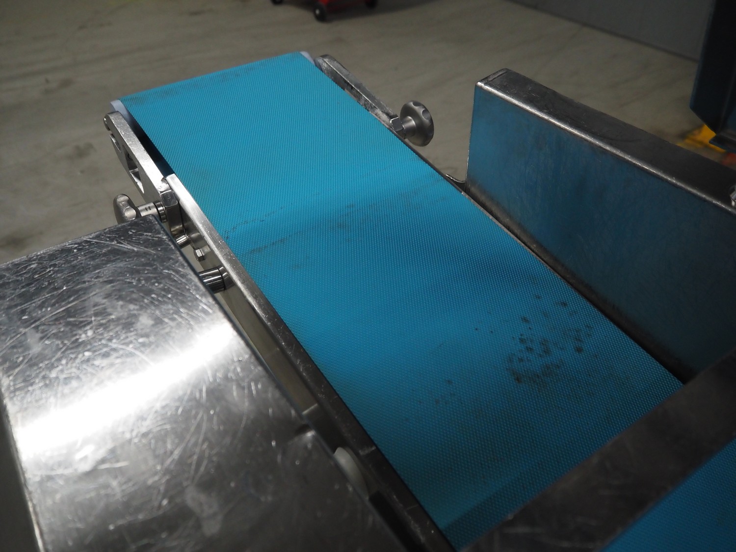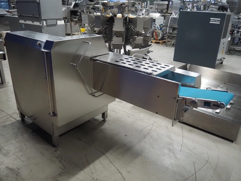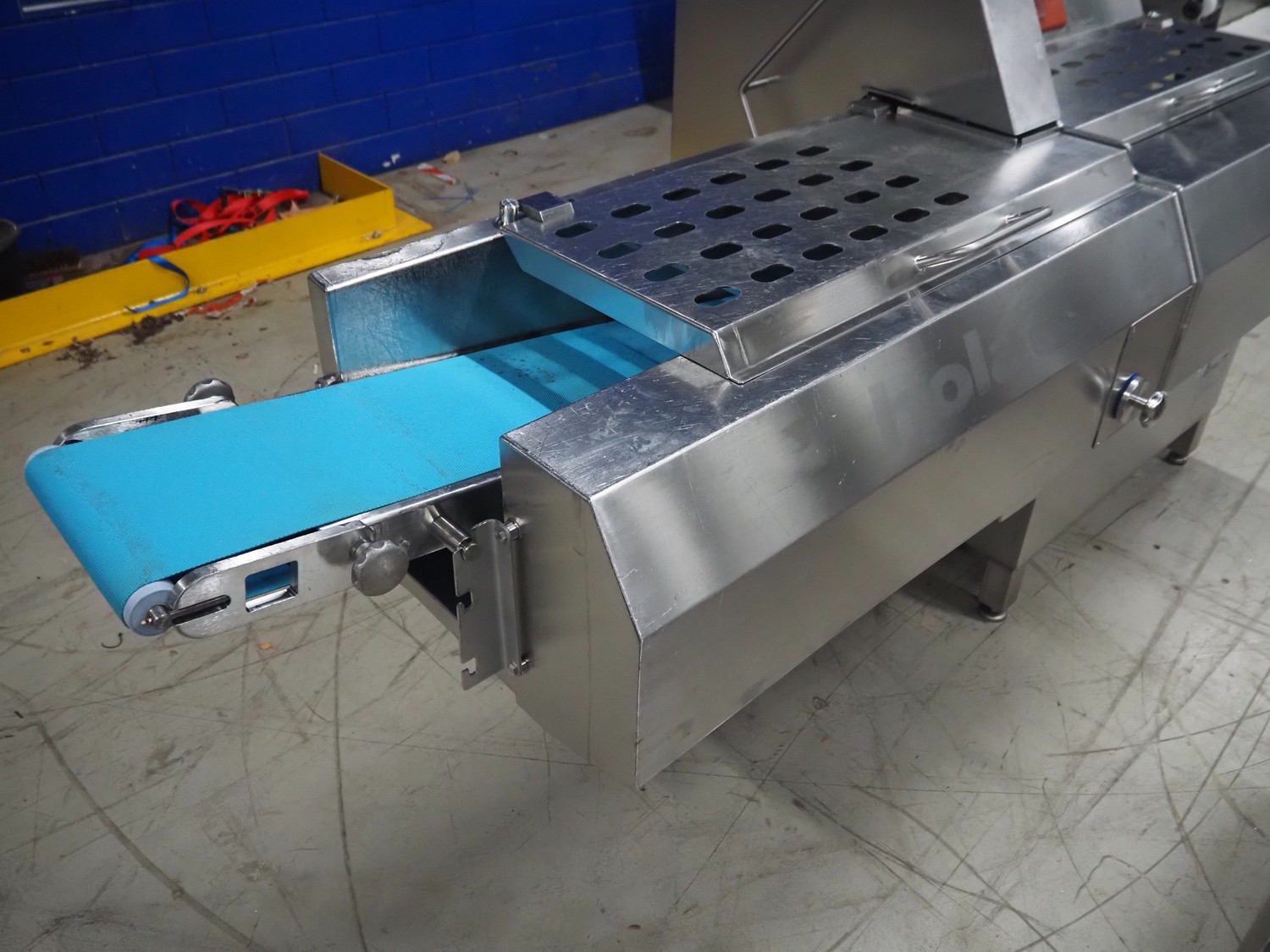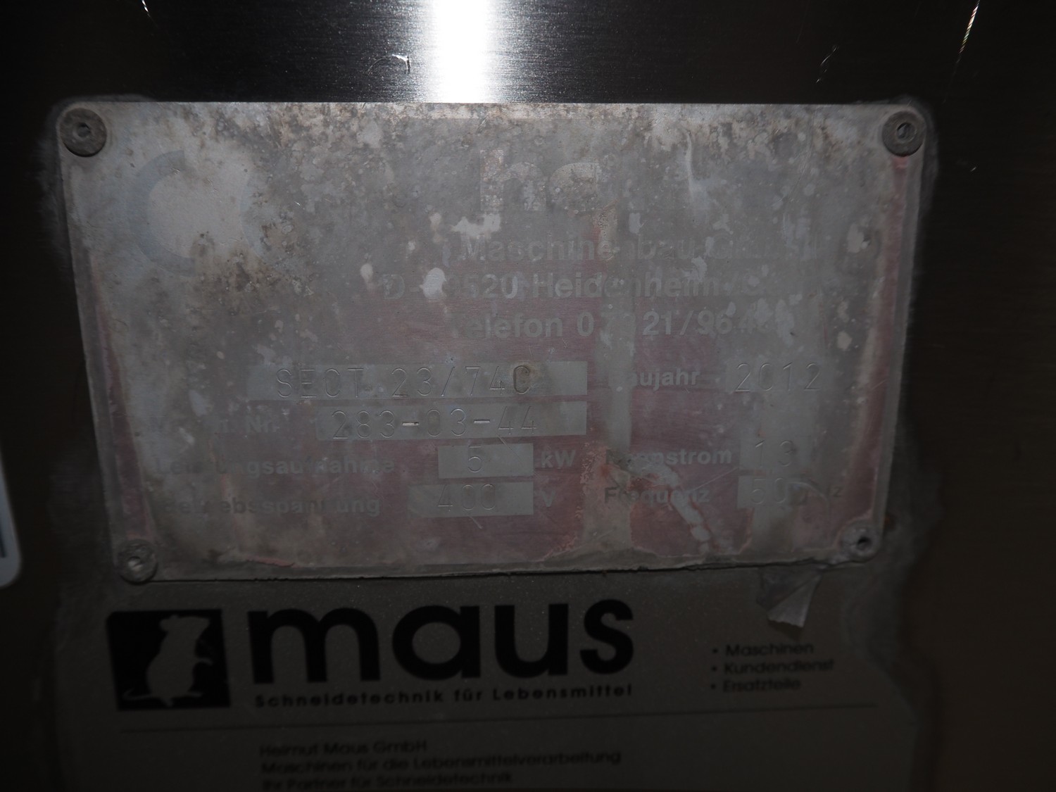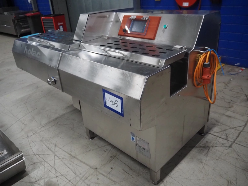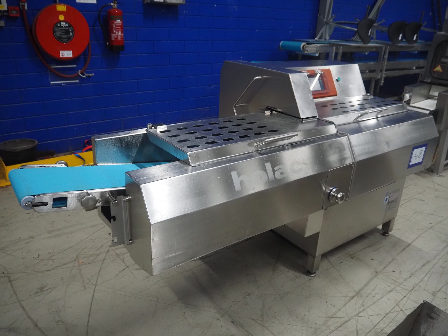 Holac slicer, model: Sect 23/74C, machine number: 283-03-44, year of construction: 2012, 400 V, 50 Hz, 13 A, 5 kW, clearance: 230 mm x 230 mm, plastic outfeed belt, belt width: 245 mm, total dimensions: 2450 mm x 1030 mm x 1230 mm.