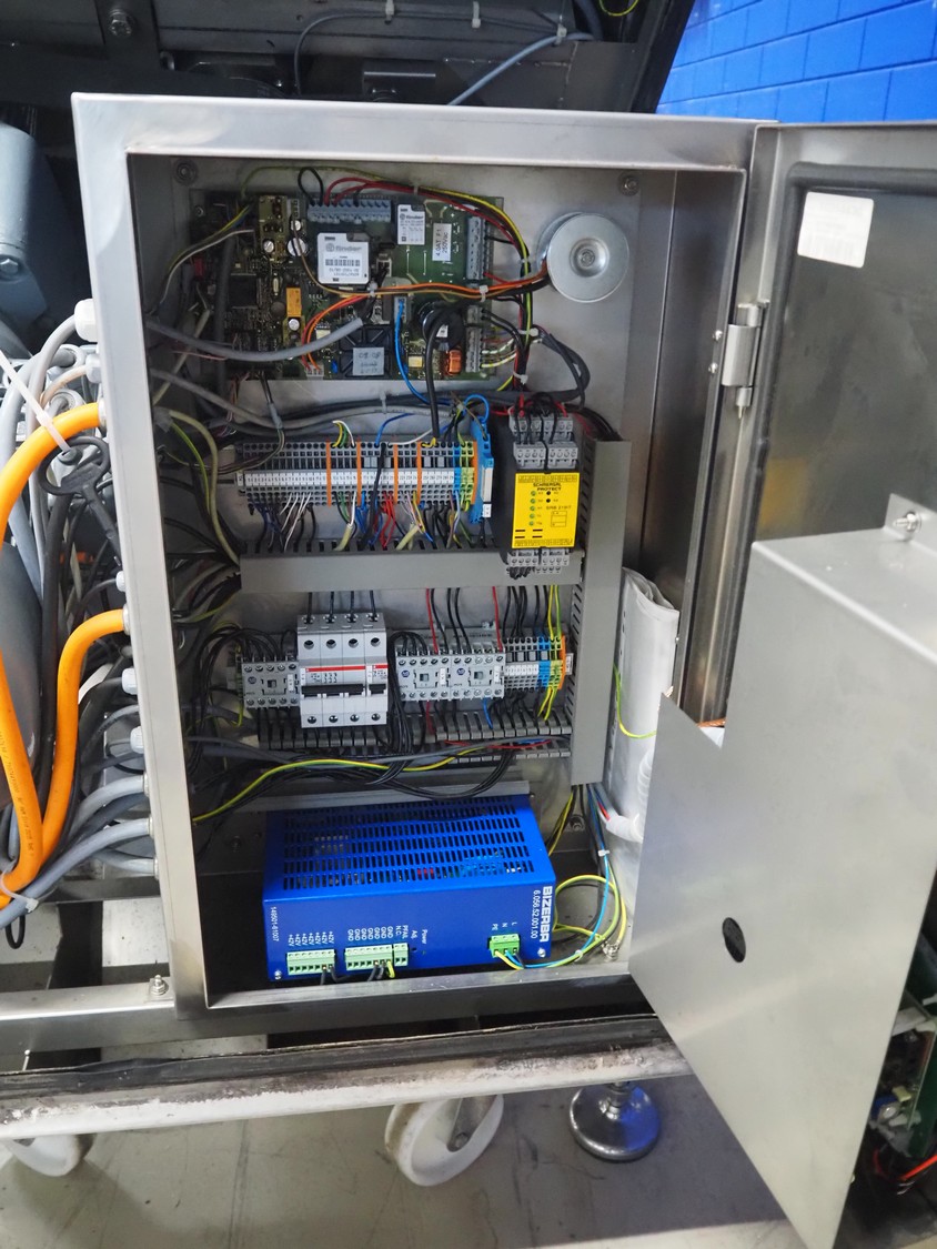 Bizerba mobile slicer, type: A 500, number: 10354430, 400 V, 3 Ph, 50 Hz, s/s mesh belt, belt width: 300 mm, total dimensions: 2300 mm x 800 mm x 1800 mm.