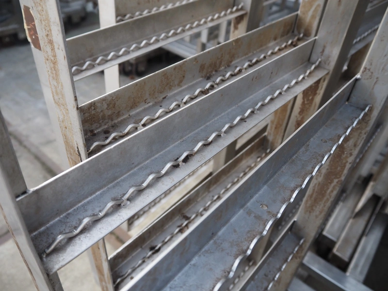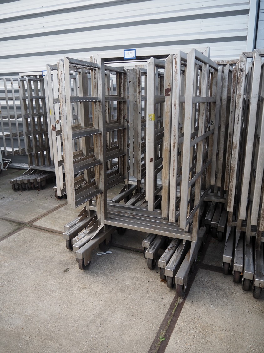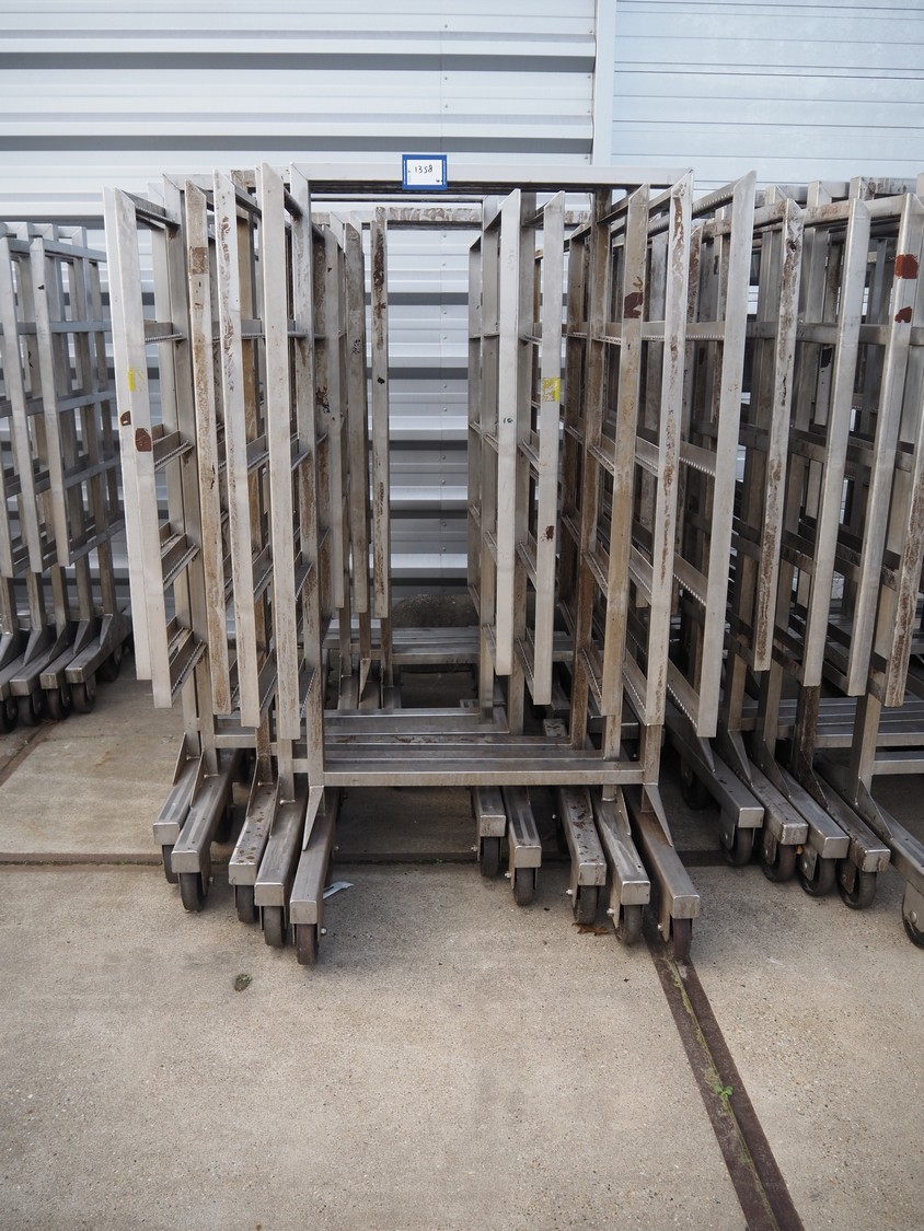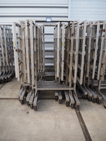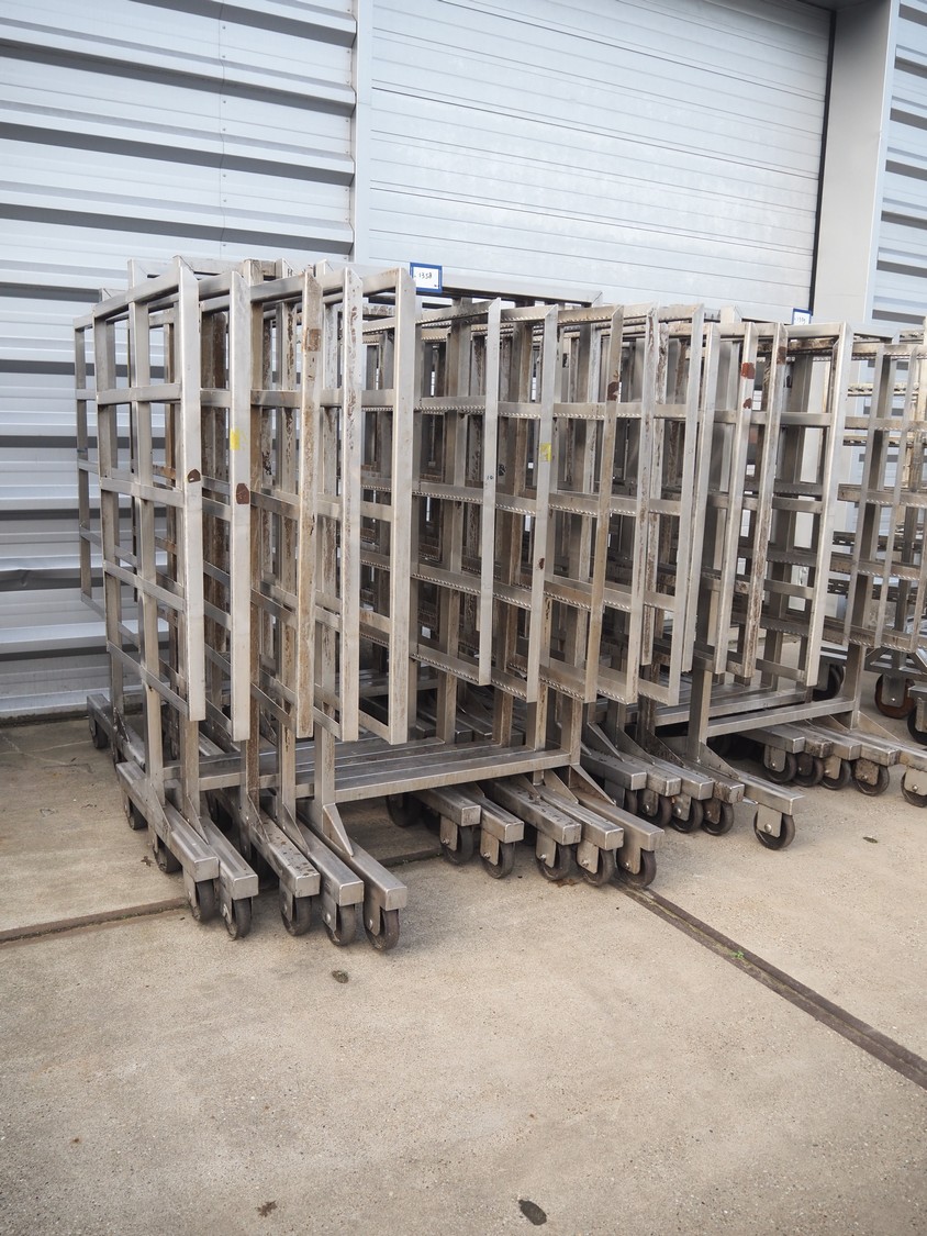 10 s/s smoke trolleys, 5 floors each, dimensions each floor: 960 mm x 900 mm, total dimensions: (10x) 960 mm x 910 mm x 1800 mm.