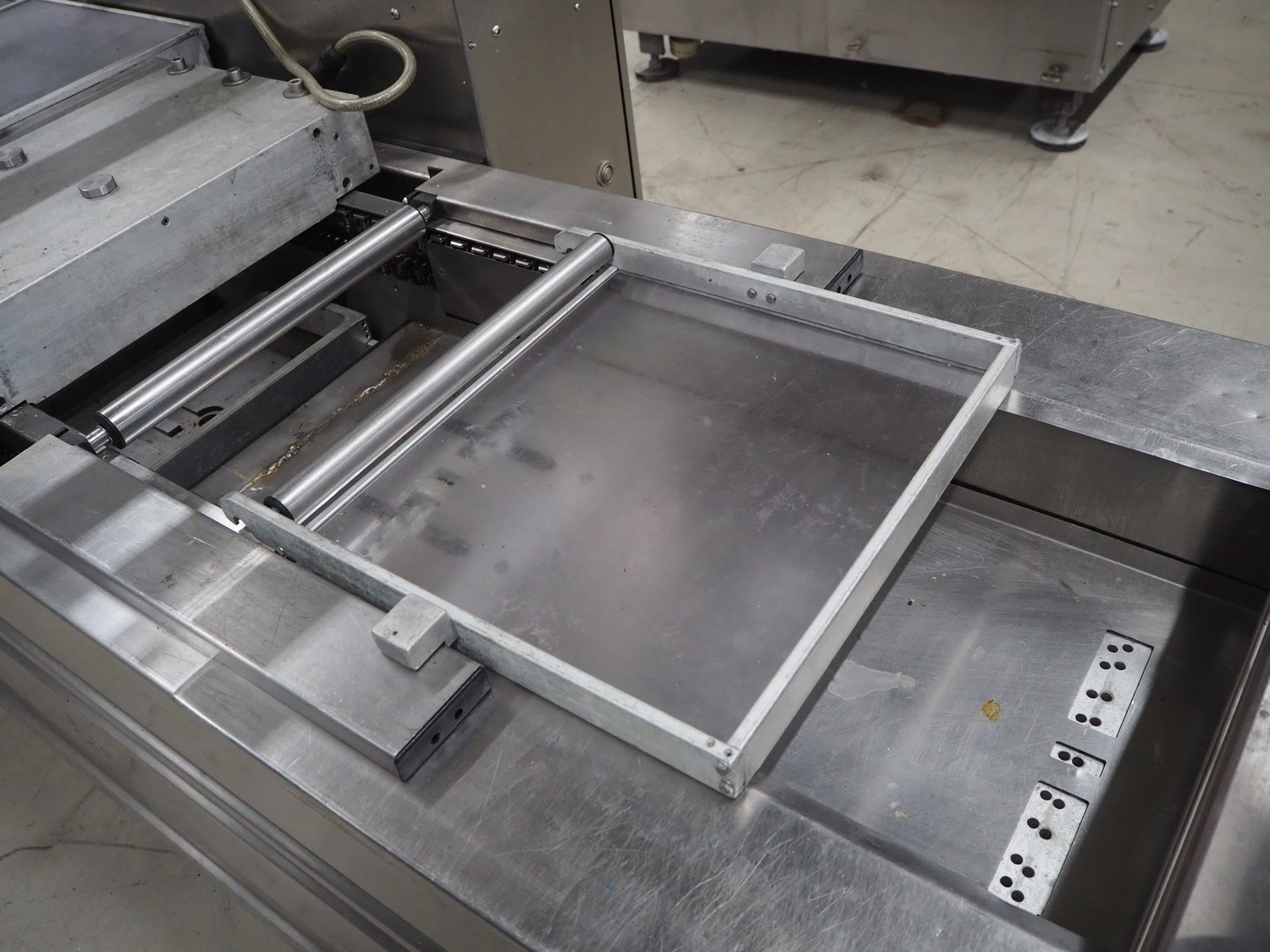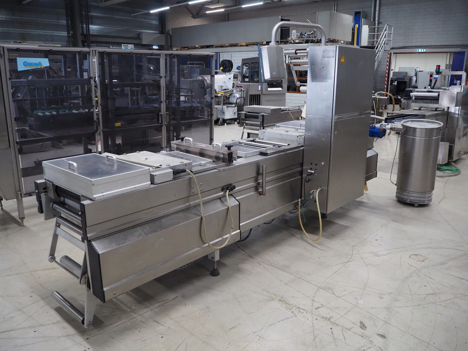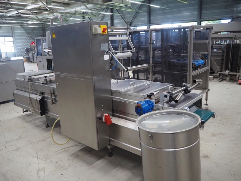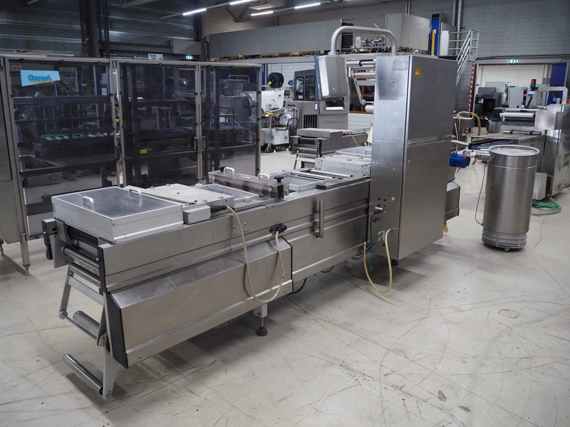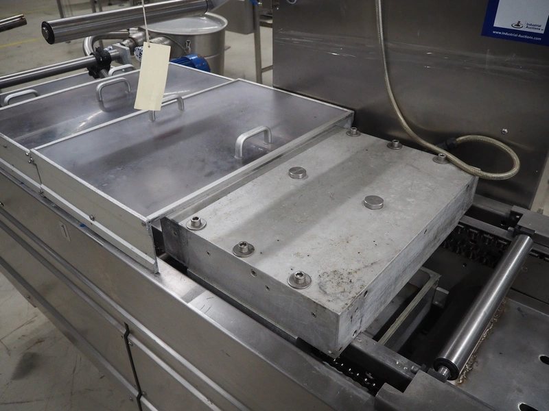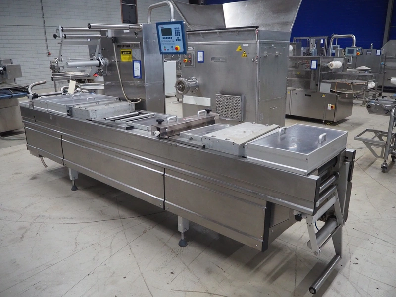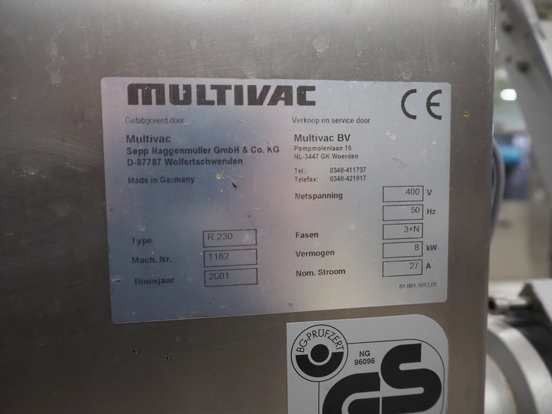 Multivac thermoformer with suction device for rest film, type: R 230, machine number: 1182, year of construction: 2001, 400 V, 3 Ph, 50 Hz, 27 A, 8 kW, dye: (2x) 387 mm x 174 mm, plastic belt, belt width: 350 mm, total dimensions: 4250 mm x 1050 mm x 2050 mm, dimensions suction device: 700 mm x 520 mm x 1150 mm. Without vacuum pump.