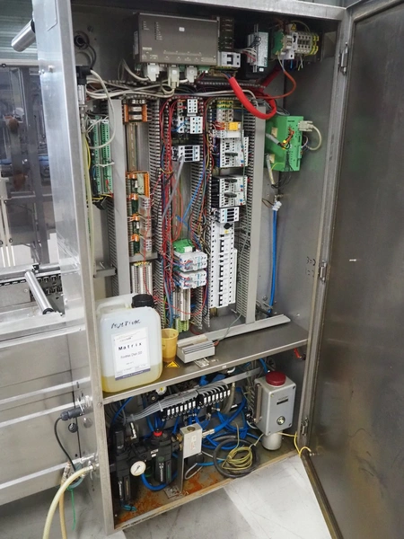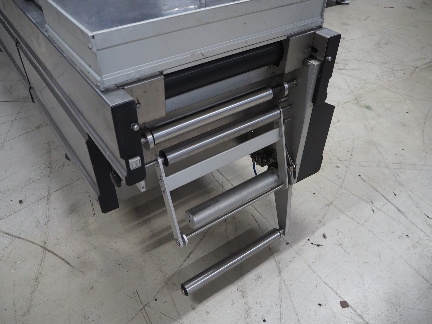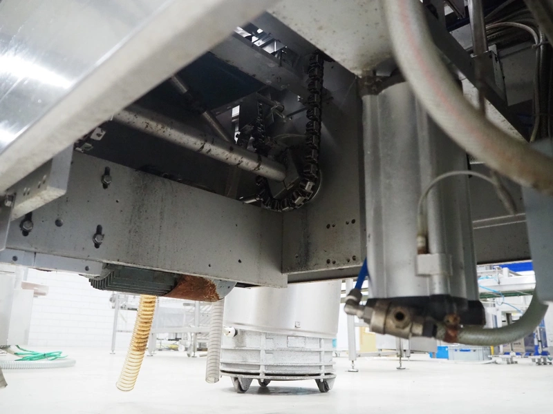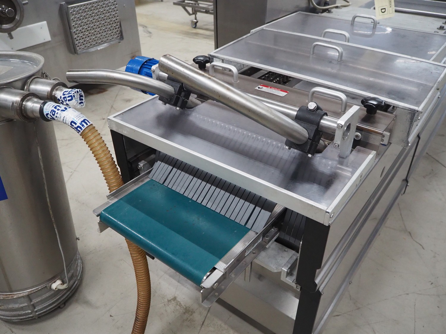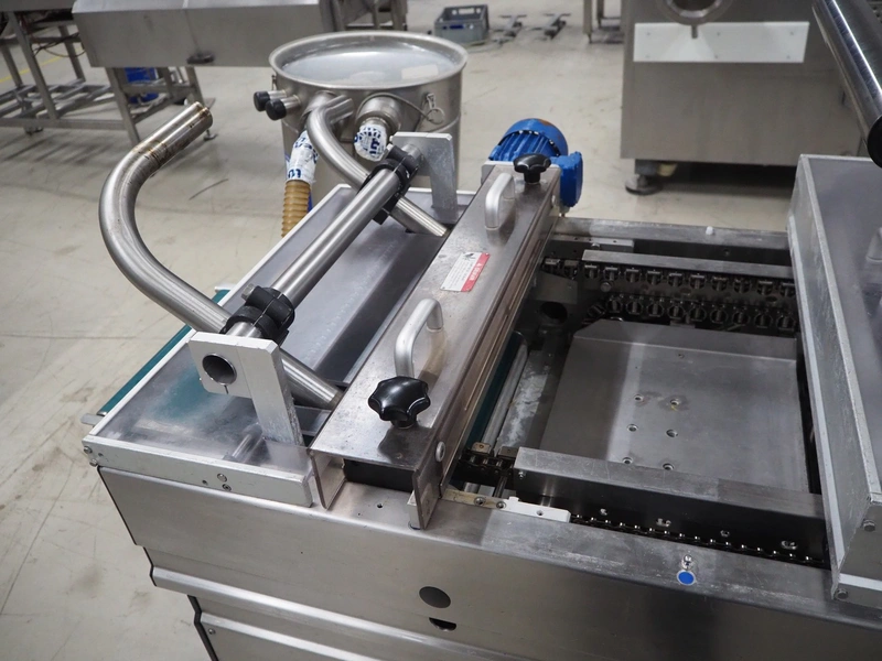 Multivac thermoformer with suction device for rest film, type: R 230, machine number: 1182, year of construction: 2001, 400 V, 3 Ph, 50 Hz, 27 A, 8 kW, dye: (2x) 387 mm x 174 mm, plastic belt, belt width: 350 mm, total dimensions: 4250 mm x 1050 mm x 2050 mm, dimensions suction device: 700 mm x 520 mm x 1150 mm. Without vacuum pump.