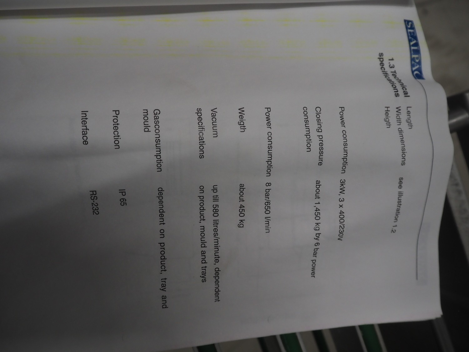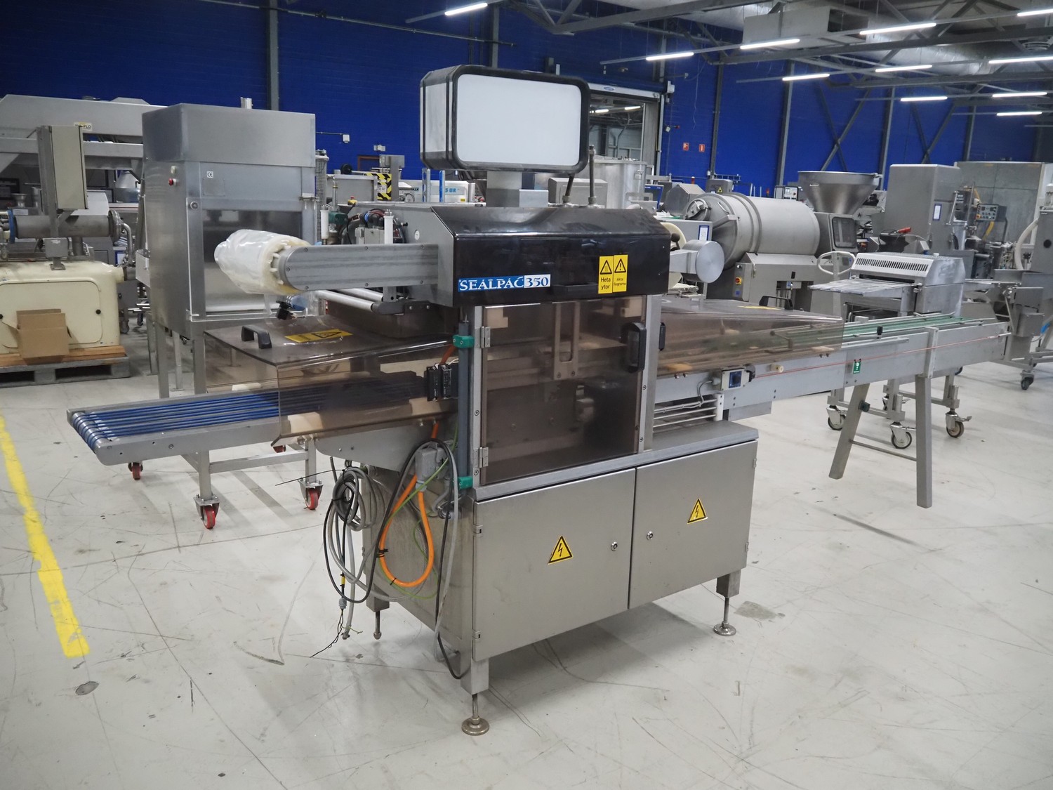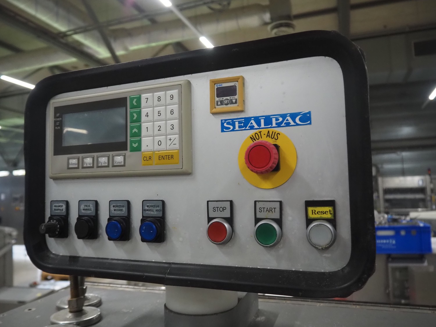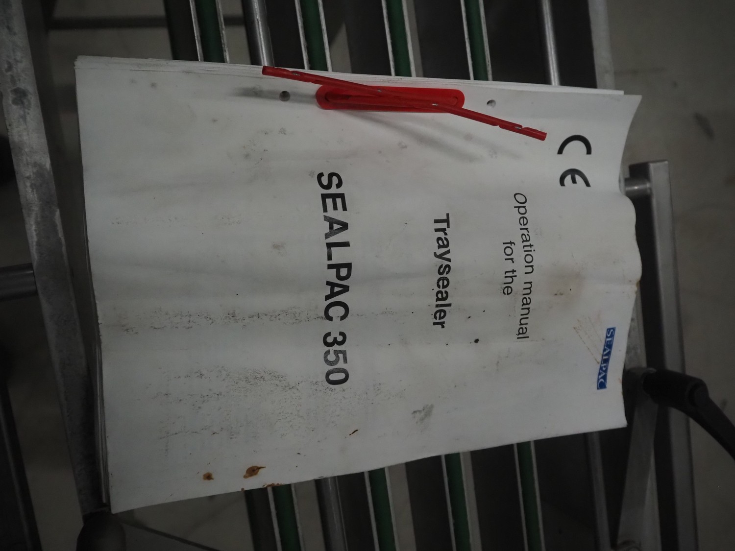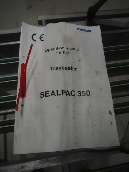 Sealpac traysealer, type: Sealpac 350, serial number: TVG 0122901, year of construction: 1999, 400/230 V, 3 Ph, 1.5 kW, weight: 1.5 kW, film width: 305 mm, dye: 300 mm x 260 mm, total dimensions: 4050 mm x 800 mm x 1850 mm.