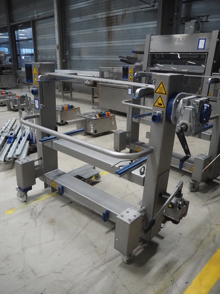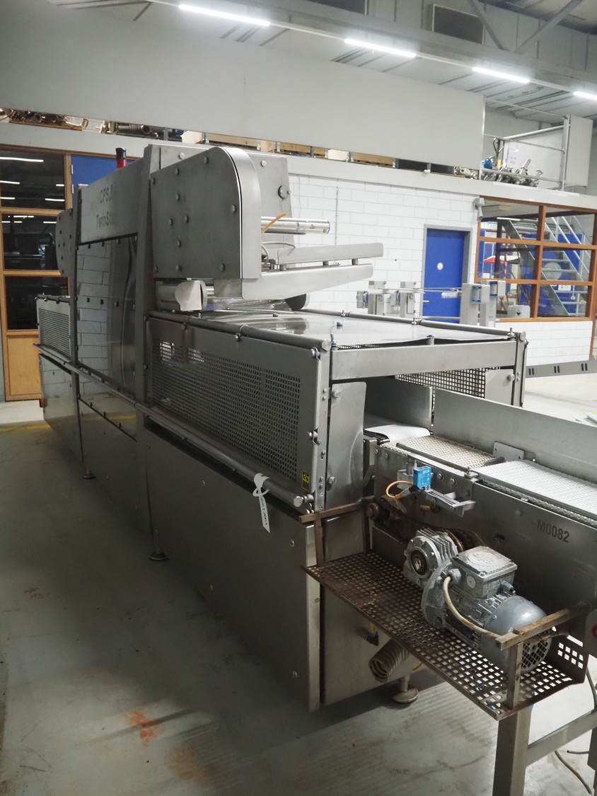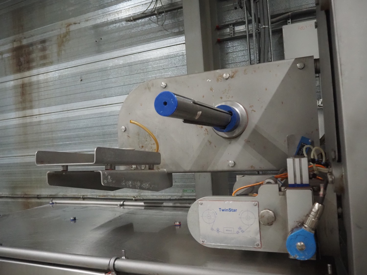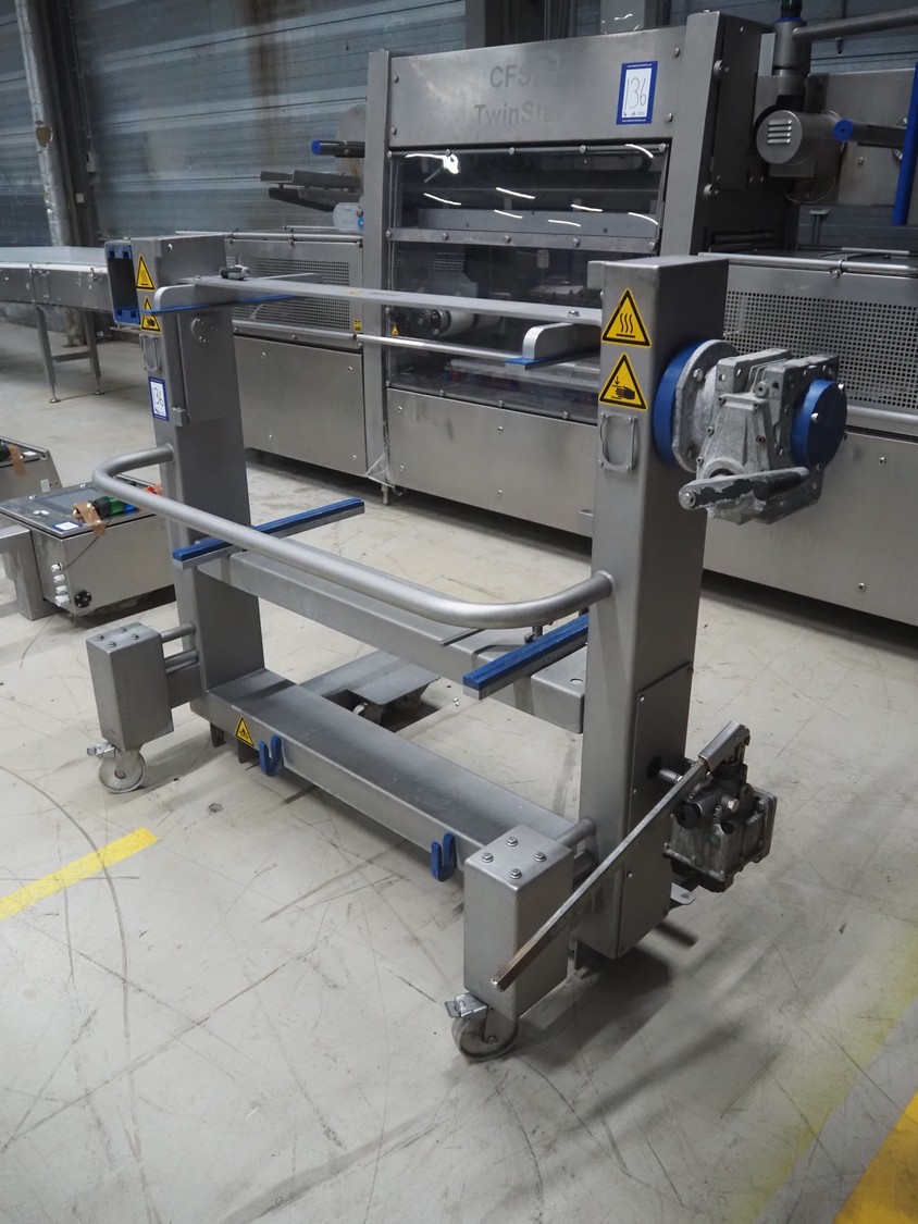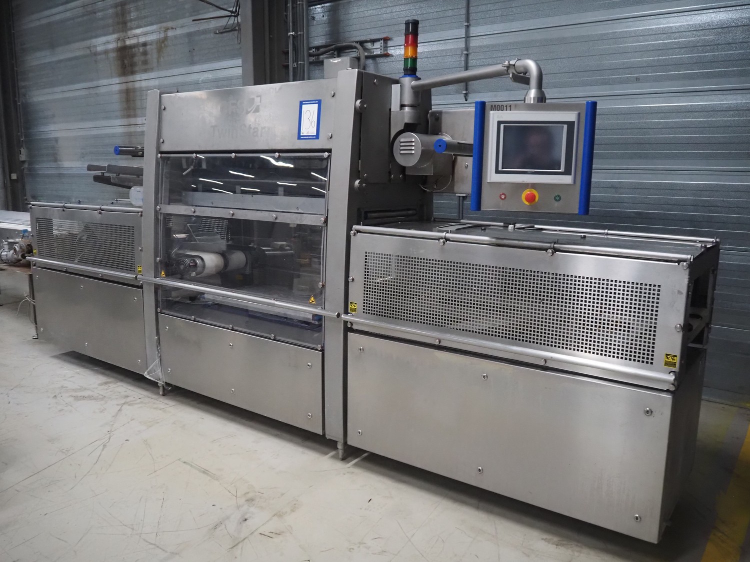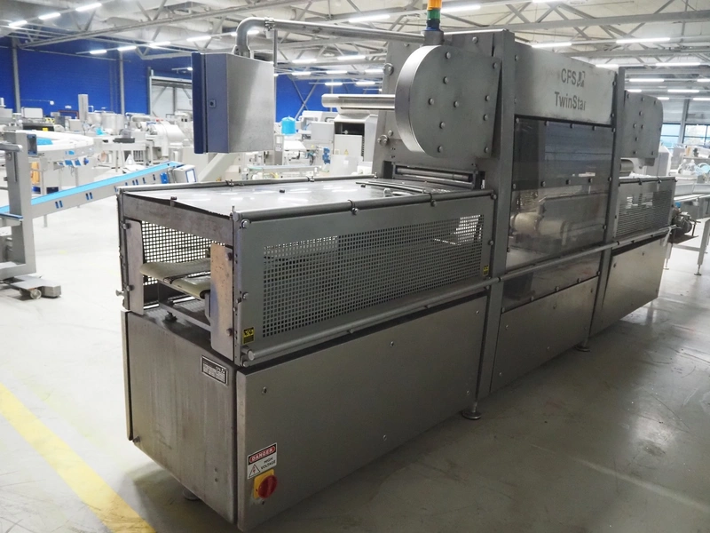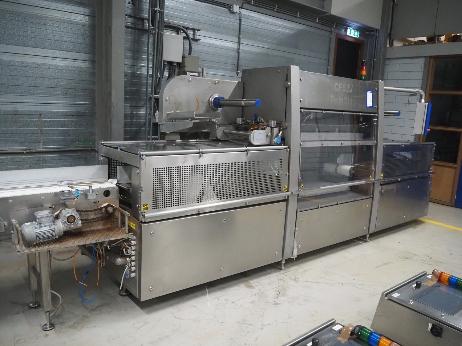 CFS traysealer, type: Twin Star, machine number: 773-116, year of construction: 2004, 400 V, 3 Ph, 50 Hz, 18 A, 12 kW, 2200 kg, plastic mesh infeed belts, belt width: (2x) 170 mm, total dimensions: 4600 mm x 1100 mm x 2200 mm, 2100 mm x 600 mm x 1100 mm and 4000 mm x 1000 mm x 1100 mm. With pallet with spacers and 2 trolleys for changing dyes, dimensions pallet: 2000 mm x 1300 mm x 900 mm, dimensions trolleys: (2x) 1900 mm x 1100 mm x 1350 mm. Incomplete.