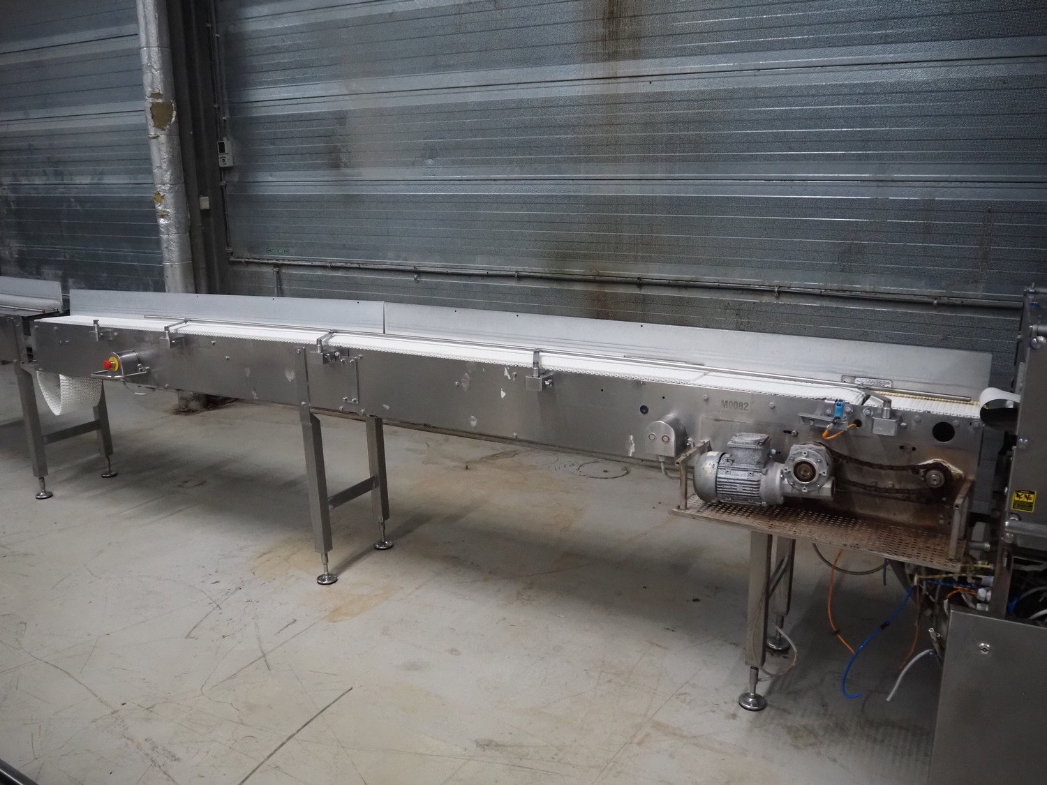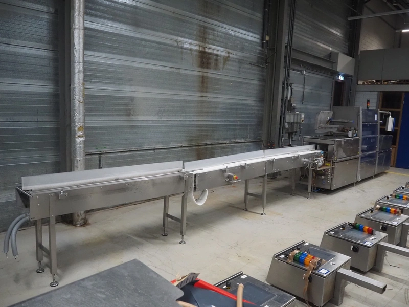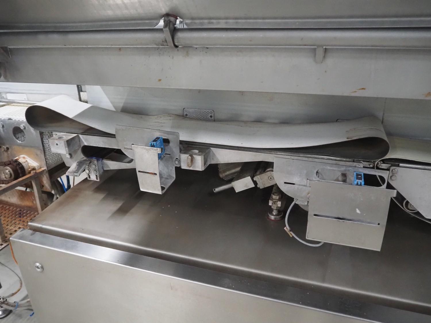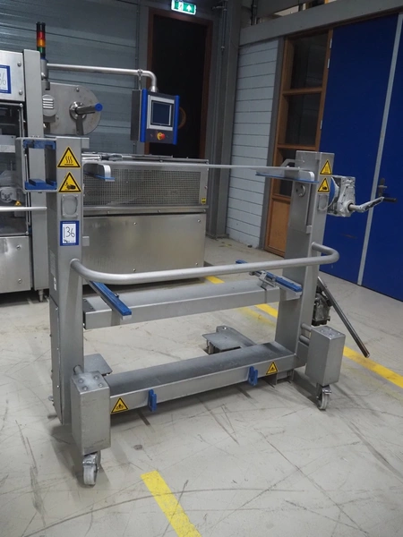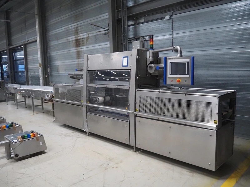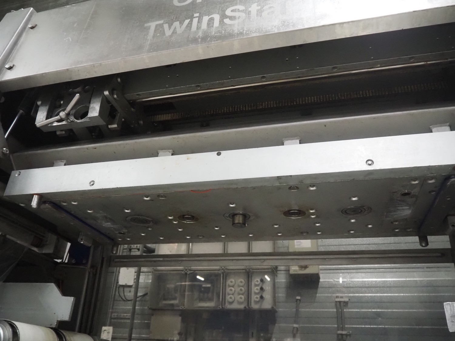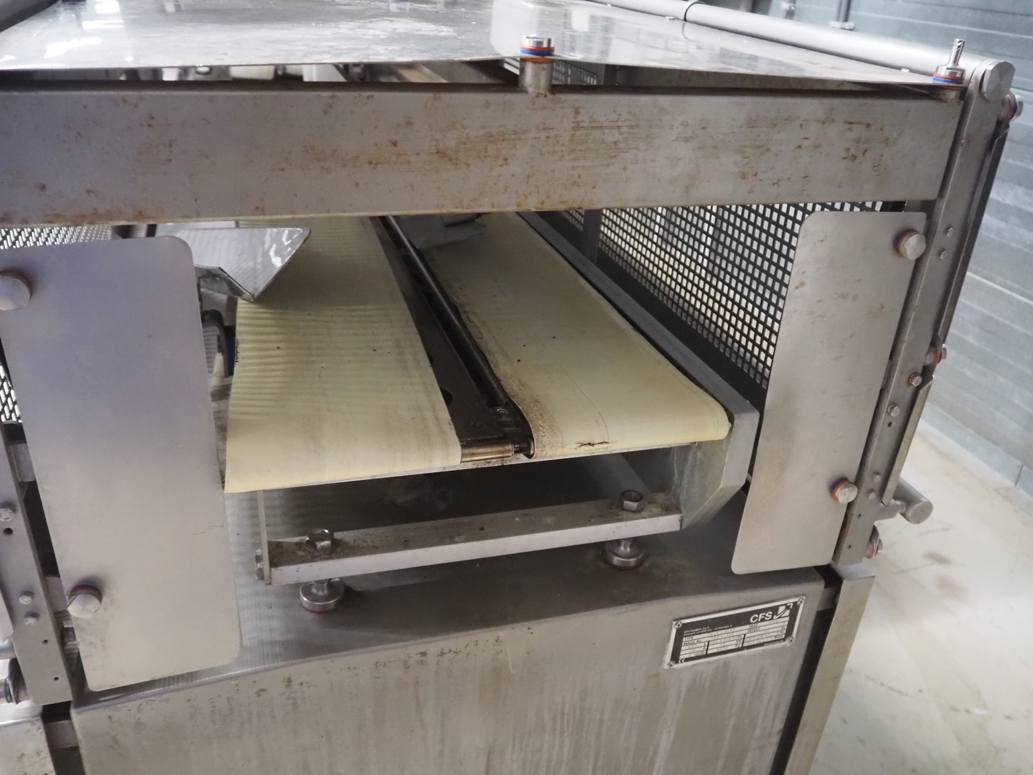 CFS traysealer, type: Twin Star, machine number: 773-116, year of construction: 2004, 400 V, 3 Ph, 50 Hz, 18 A, 12 kW, 2200 kg, plastic mesh infeed belts, belt width: (2x) 170 mm, total dimensions: 4600 mm x 1100 mm x 2200 mm, 2100 mm x 600 mm x 1100 mm and 4000 mm x 1000 mm x 1100 mm. With pallet with spacers and 2 trolleys for changing dyes, dimensions pallet: 2000 mm x 1300 mm x 900 mm, dimensions trolleys: (2x) 1900 mm x 1100 mm x 1350 mm. Incomplete.
