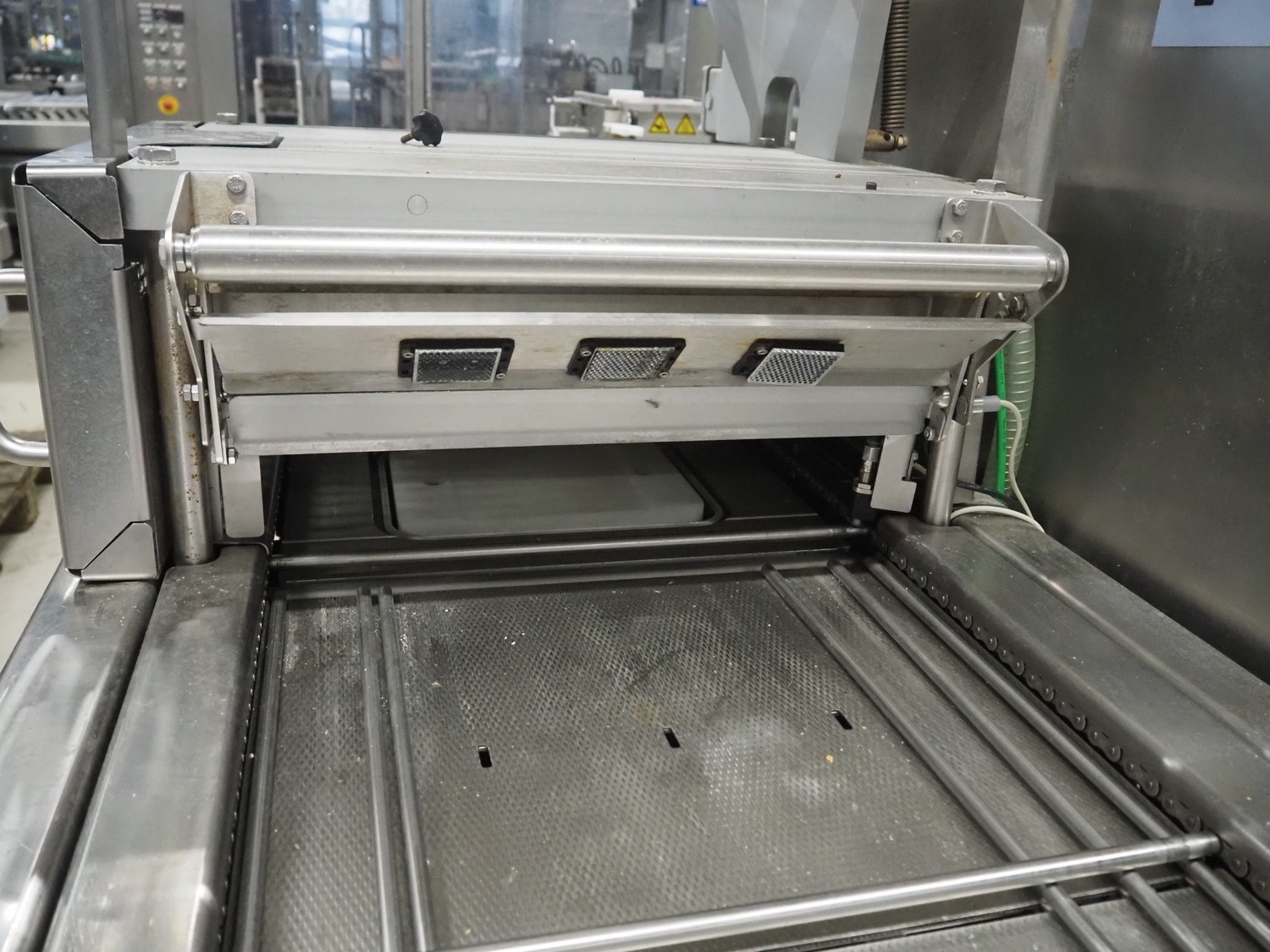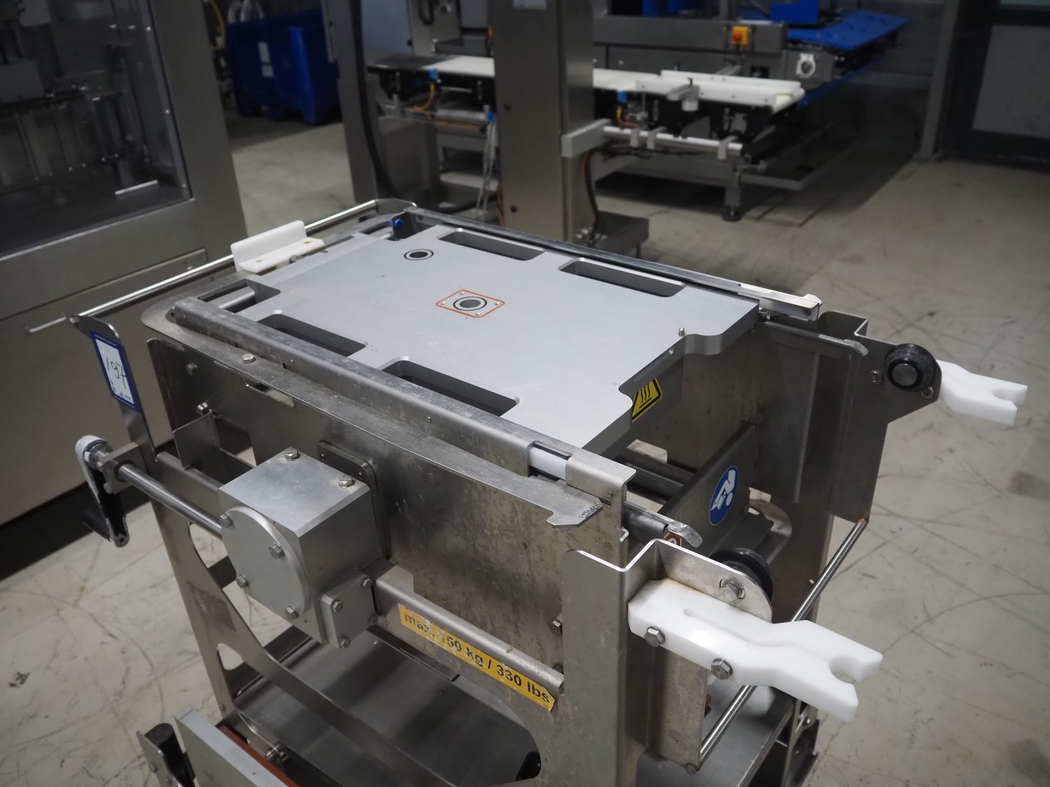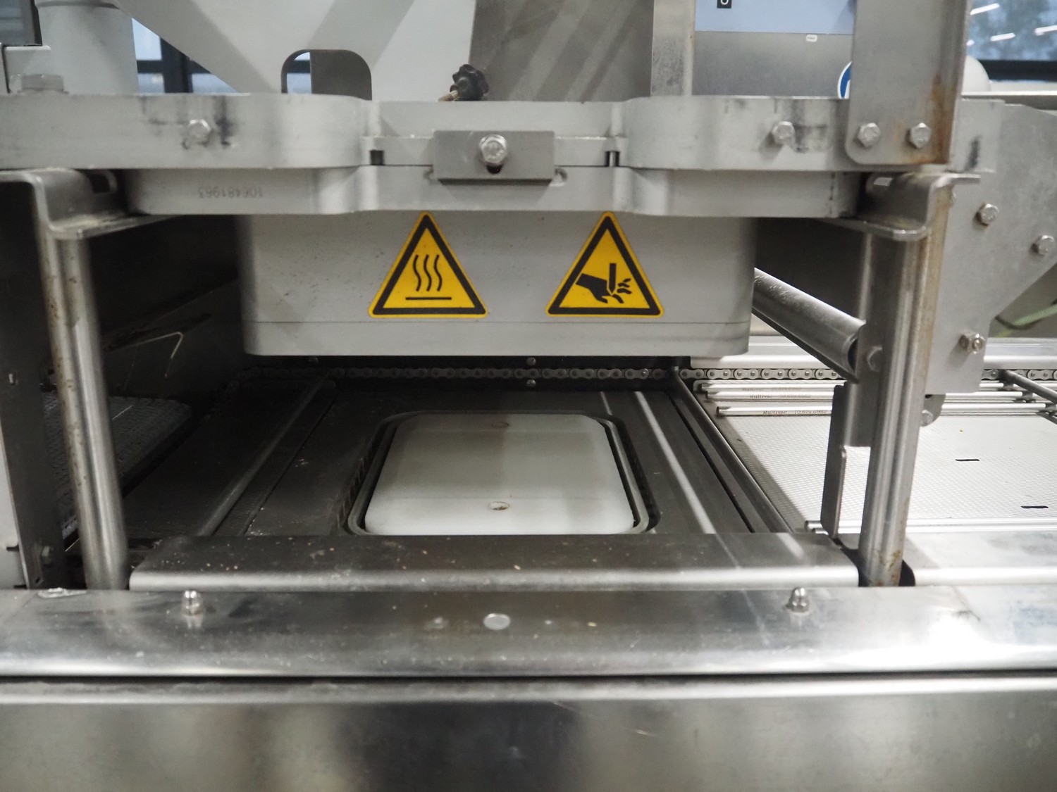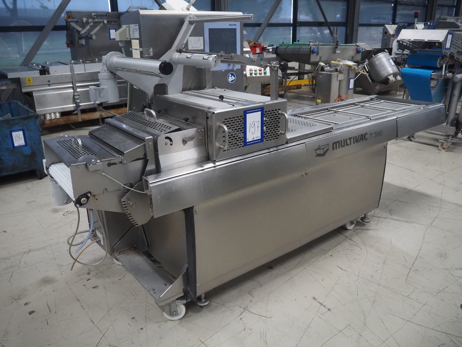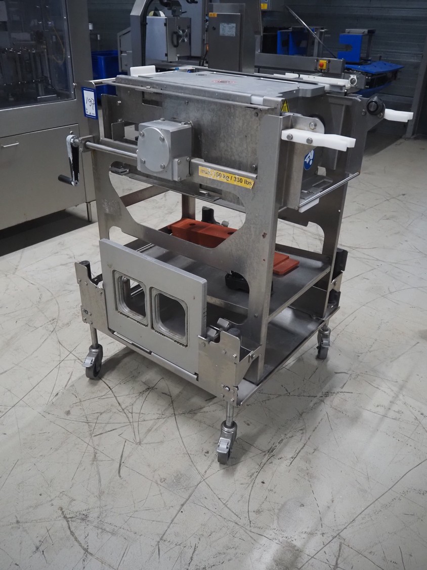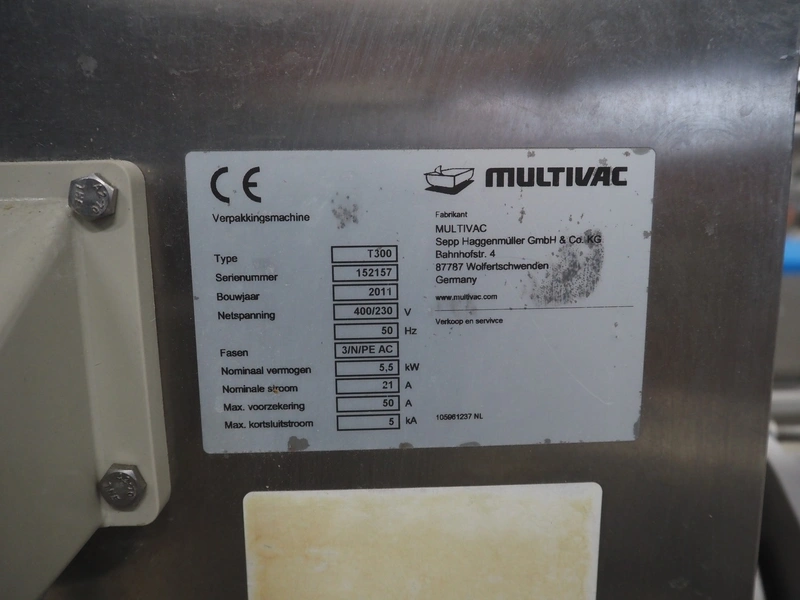 Multivac mobile traysealer, type: T300, serial number: 152157, year of construction: 2011, 400/230 V, 3 Ph, 50 Hz, 21 A, 5.5 kW, s/s chain and pin conveyor, belt width: 470 mm, distance between dividers: 400 mm, divider height: 20 mm, dimensions dye: 280 mm x 240 mm, total dimensions: 3300 mm x 1150 mm x 1700 mm. With trolley with additional dye, dimensions: 1150 mm x 800 mm x 1150 mm.