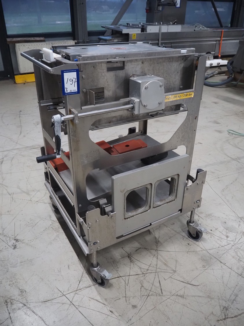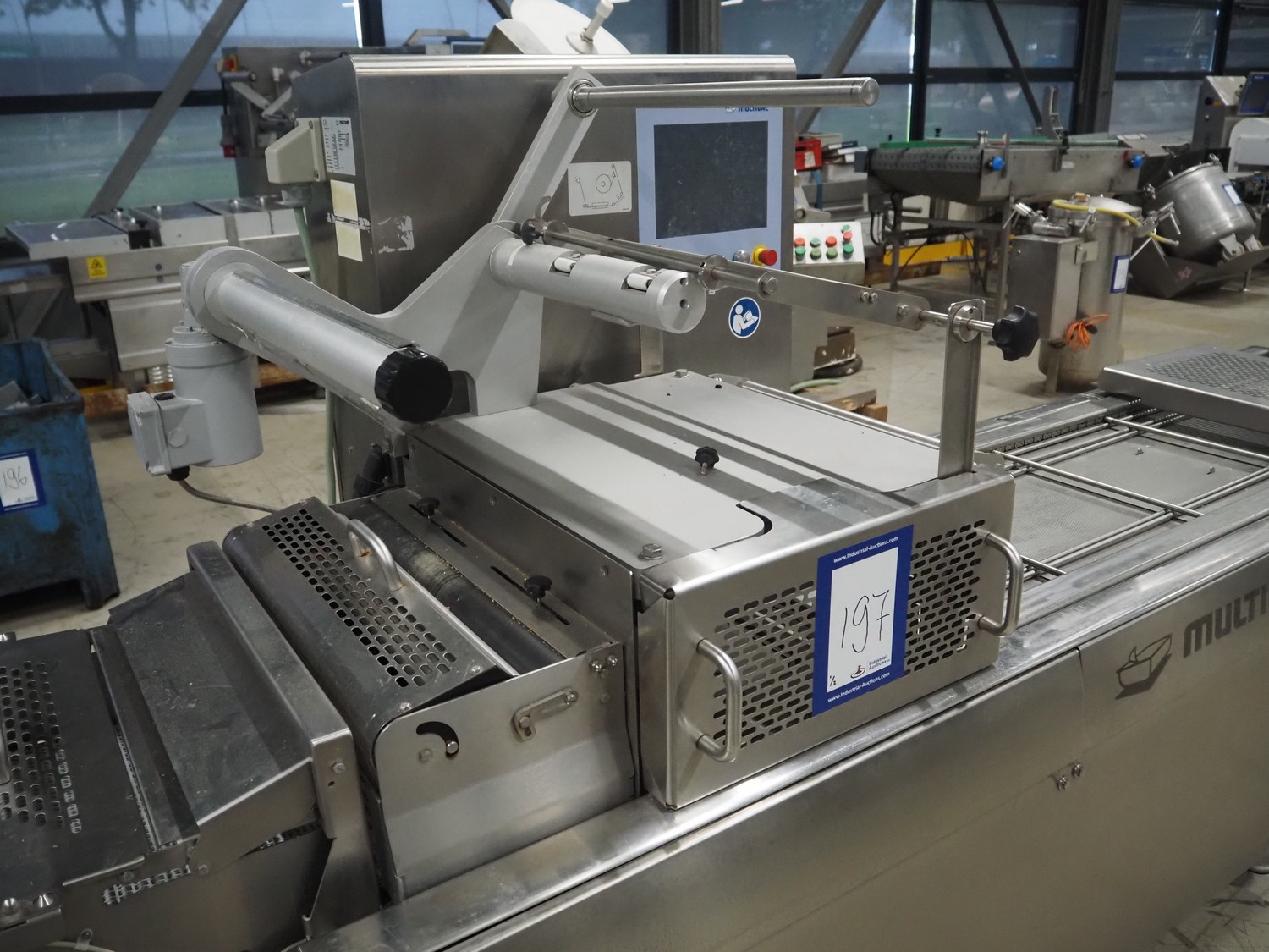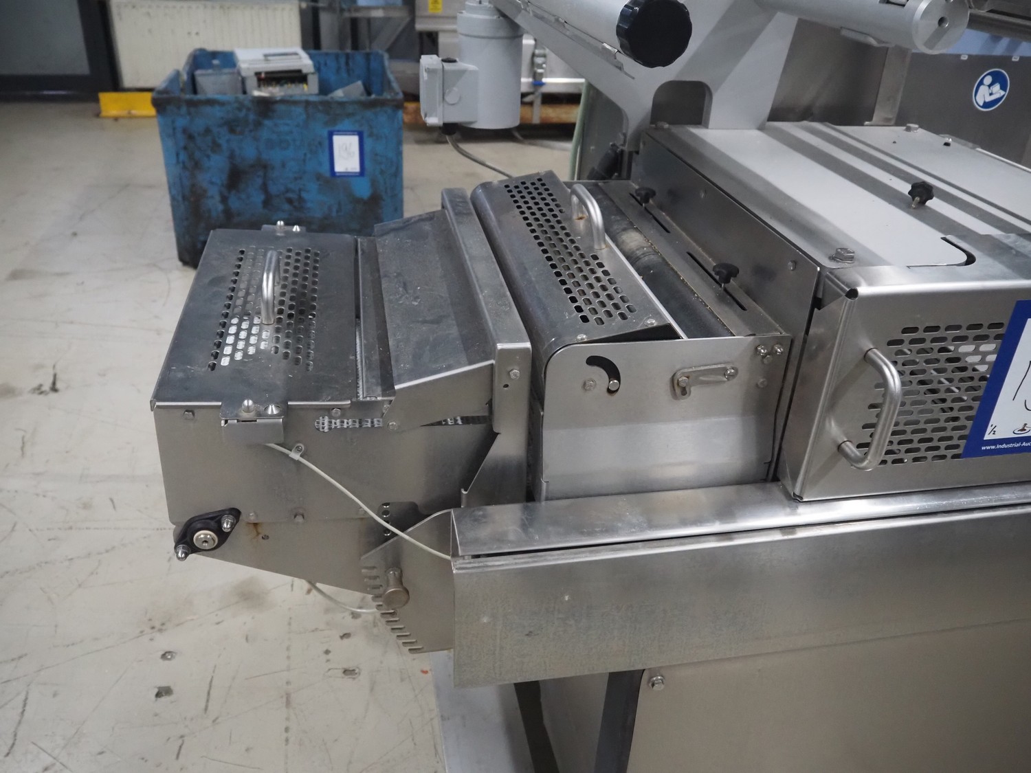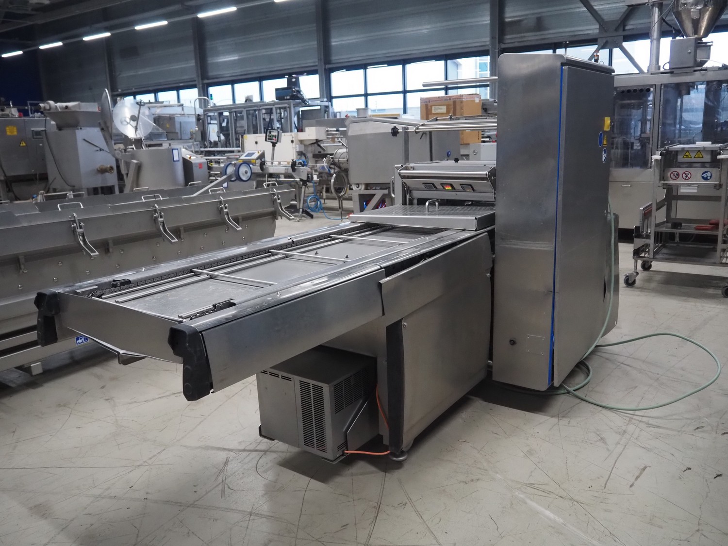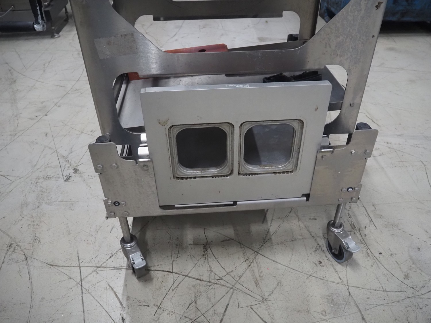 Multivac mobile traysealer, type: T300, serial number: 152157, year of construction: 2011, 400/230 V, 3 Ph, 50 Hz, 21 A, 5.5 kW, s/s chain and pin conveyor, belt width: 470 mm, distance between dividers: 400 mm, divider height: 20 mm, dimensions dye: 280 mm x 240 mm, total dimensions: 3300 mm x 1150 mm x 1700 mm. With trolley with additional dye, dimensions: 1150 mm x 800 mm x 1150 mm.