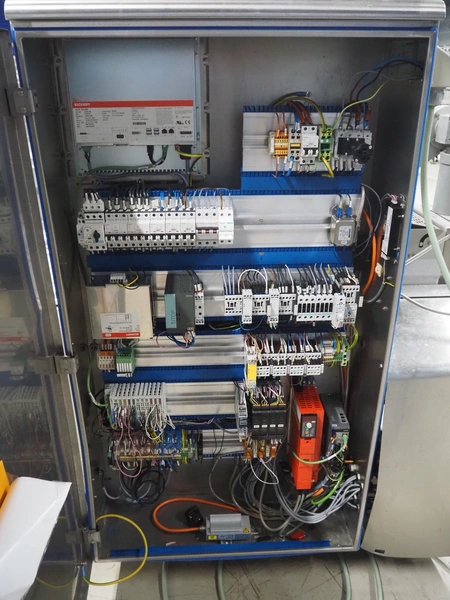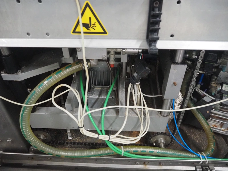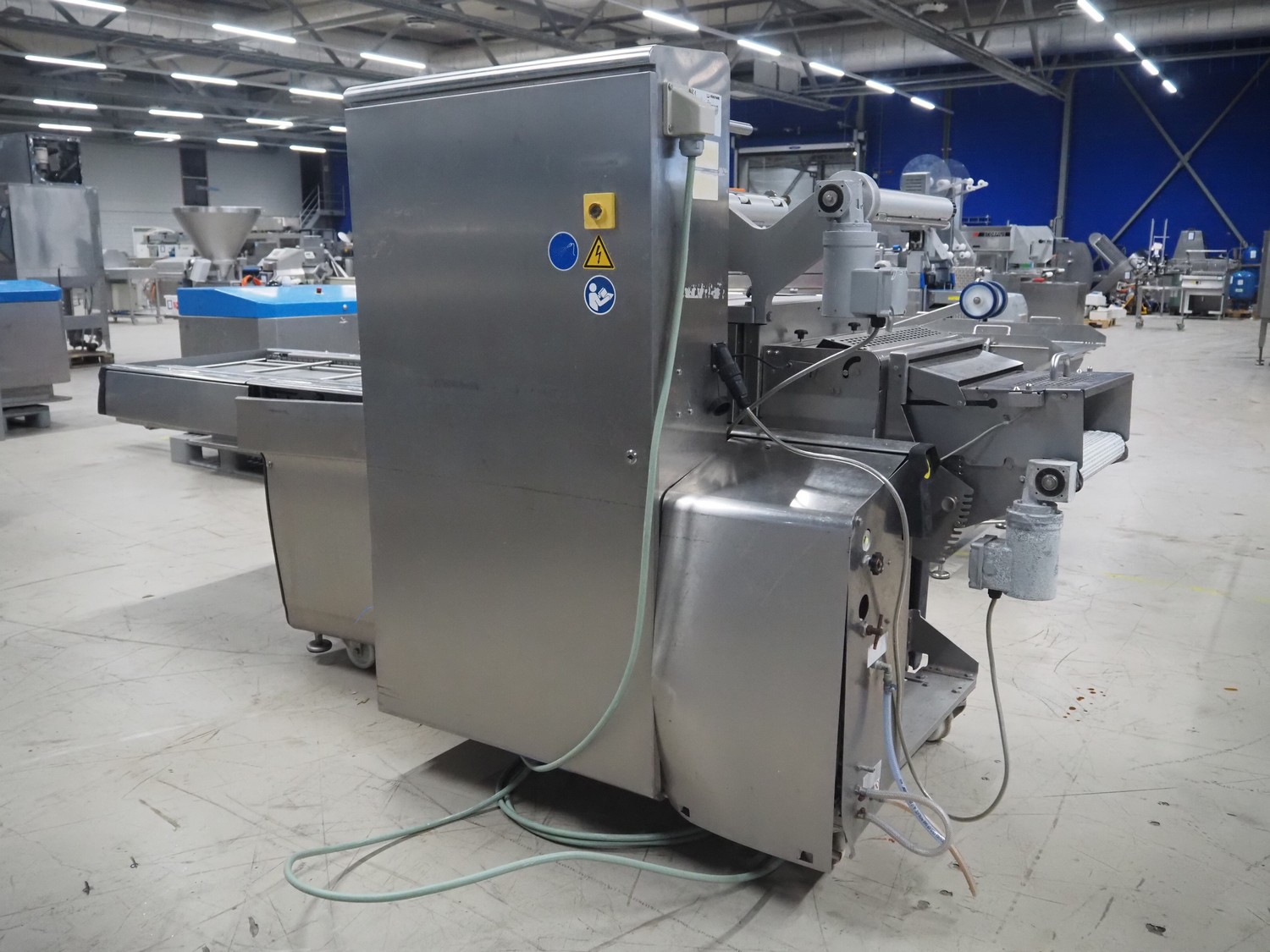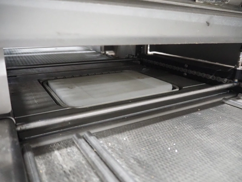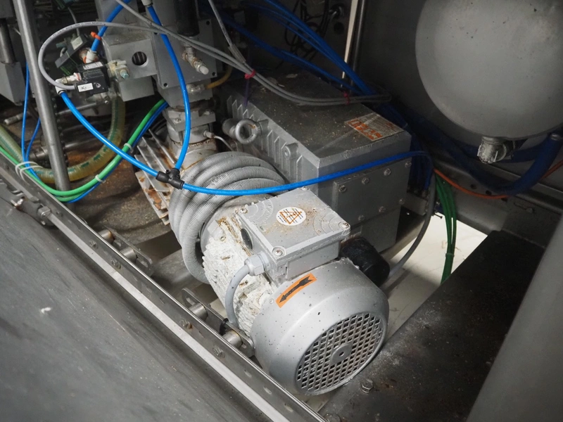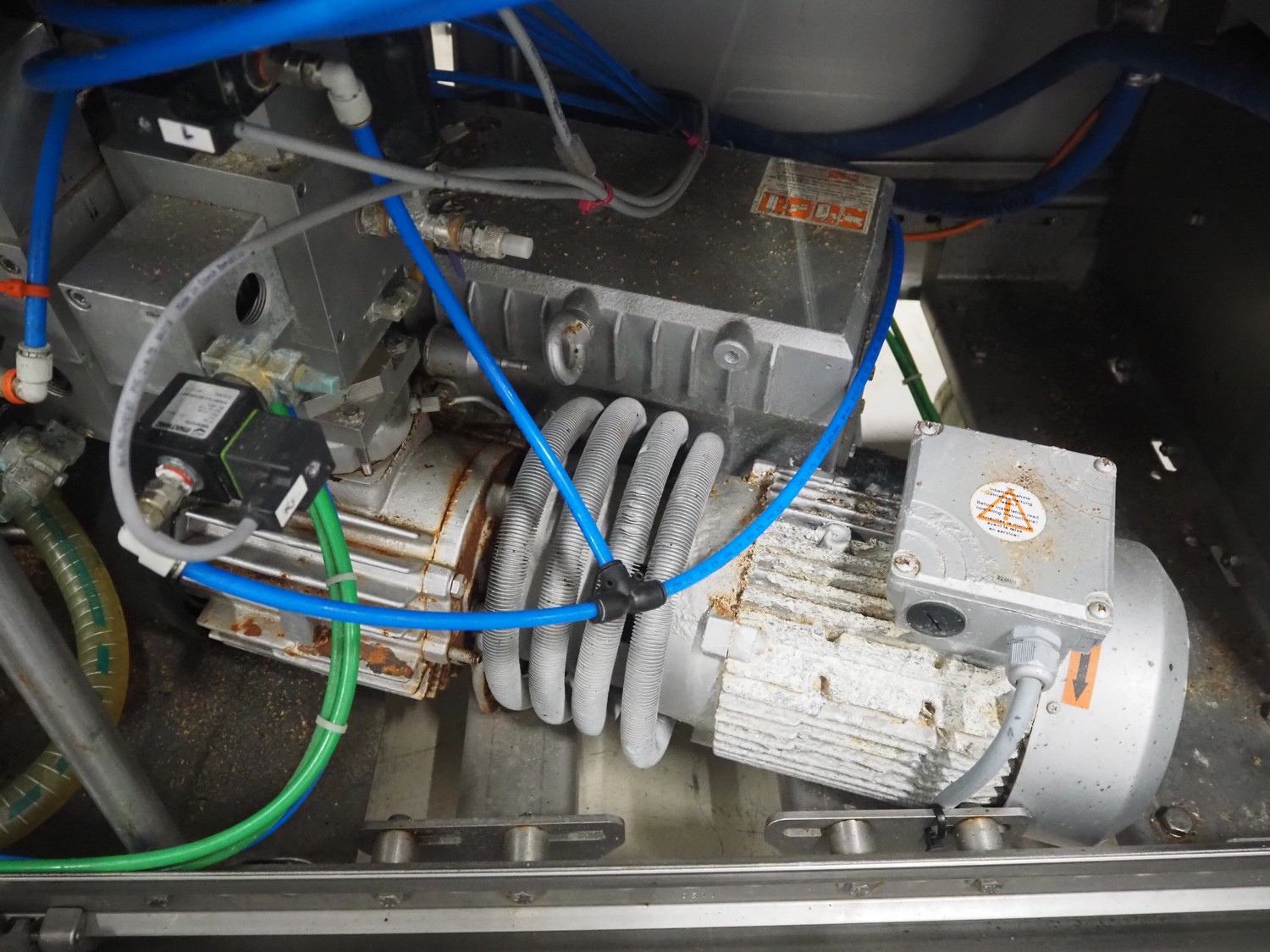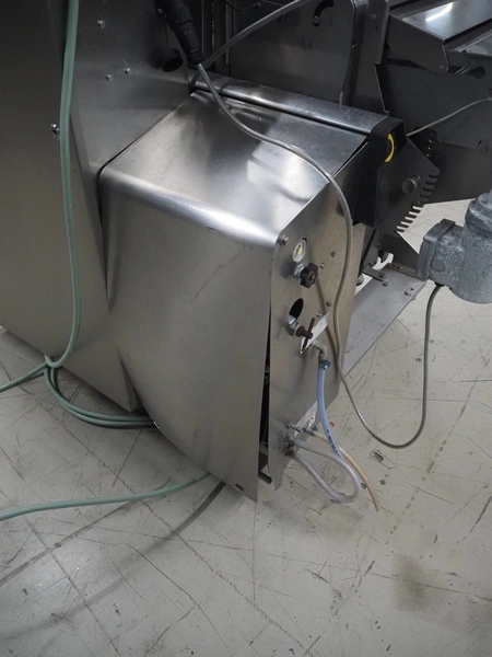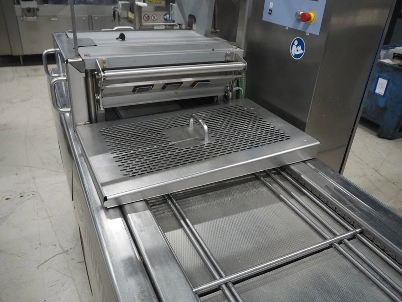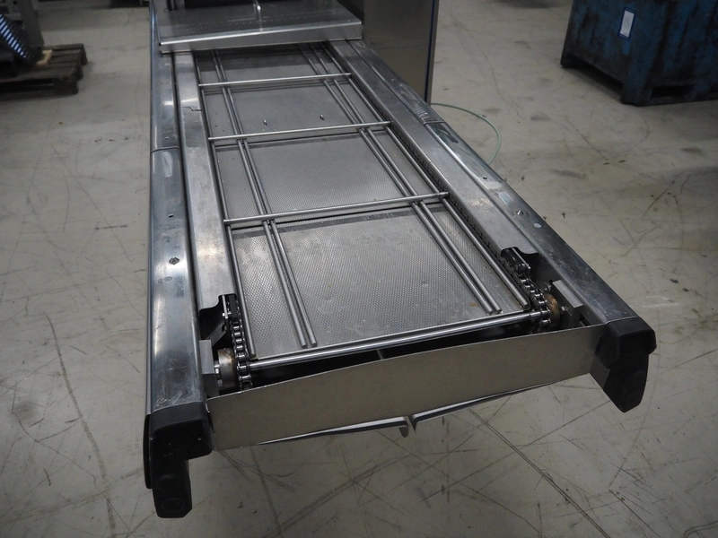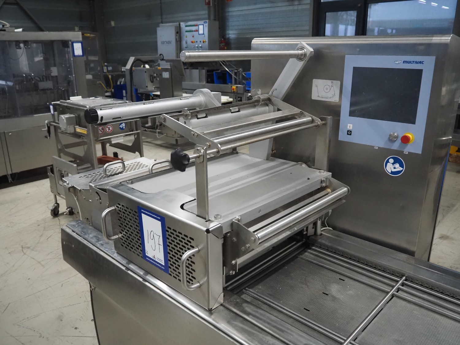 Multivac mobile traysealer, type: T300, serial number: 152157, year of construction: 2011, 400/230 V, 3 Ph, 50 Hz, 21 A, 5.5 kW, s/s chain and pin conveyor, belt width: 470 mm, distance between dividers: 400 mm, divider height: 20 mm, dimensions dye: 280 mm x 240 mm, total dimensions: 3300 mm x 1150 mm x 1700 mm. With trolley with additional dye, dimensions: 1150 mm x 800 mm x 1150 mm.