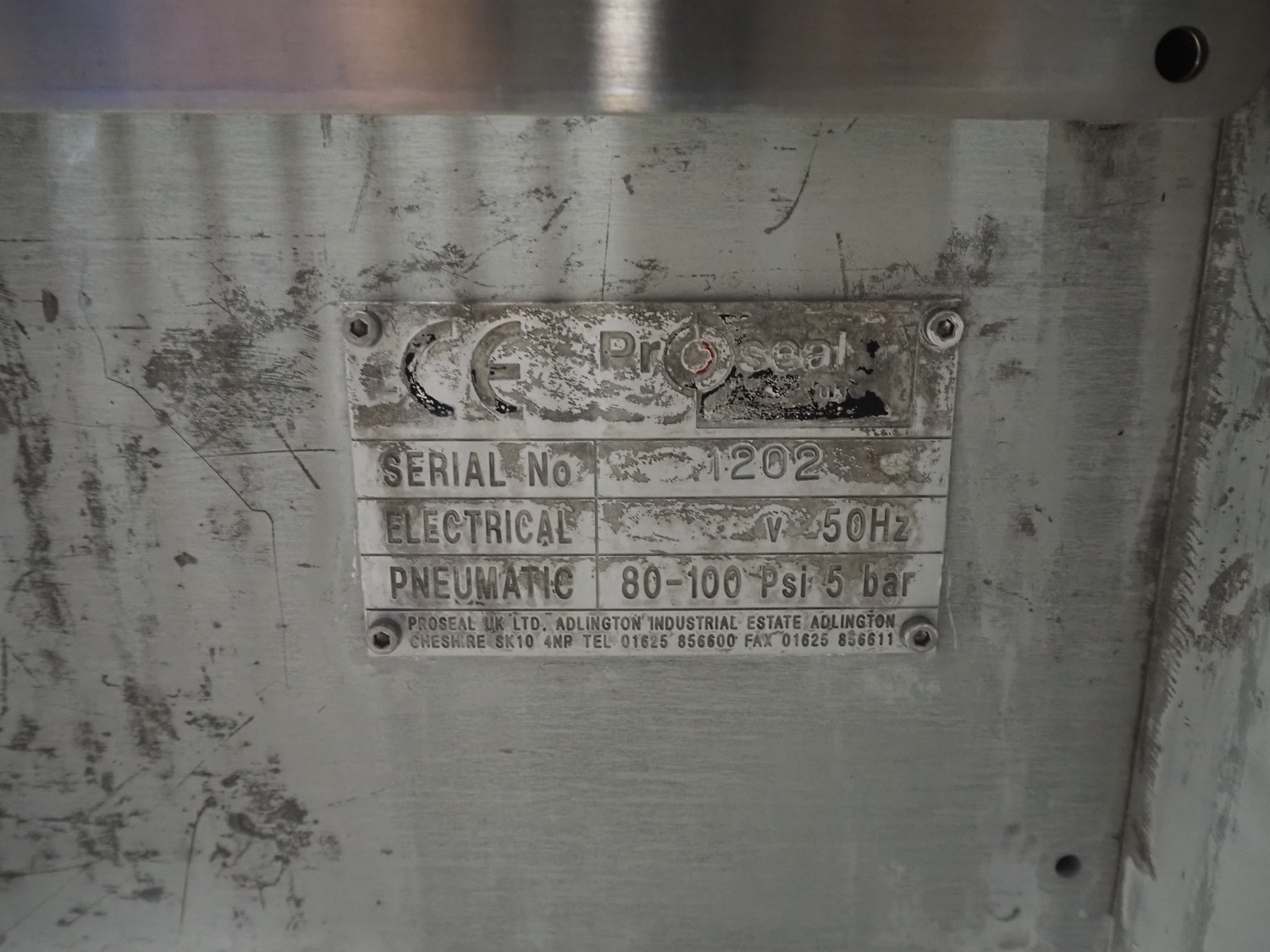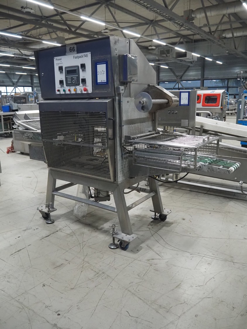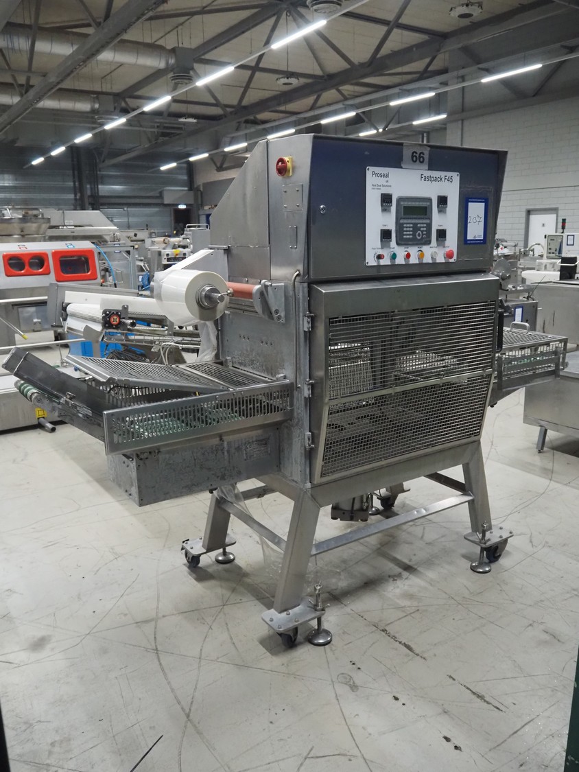 Proseal traysealer, type: Fastpack F45, serial number: 1202, 50 Hz, wire belt, belt width: 175 mm, film width: 215 mm, total dimensions: 2980 mm x 850 mm x 1950 mm. Incomplete, missing dye.