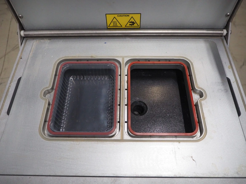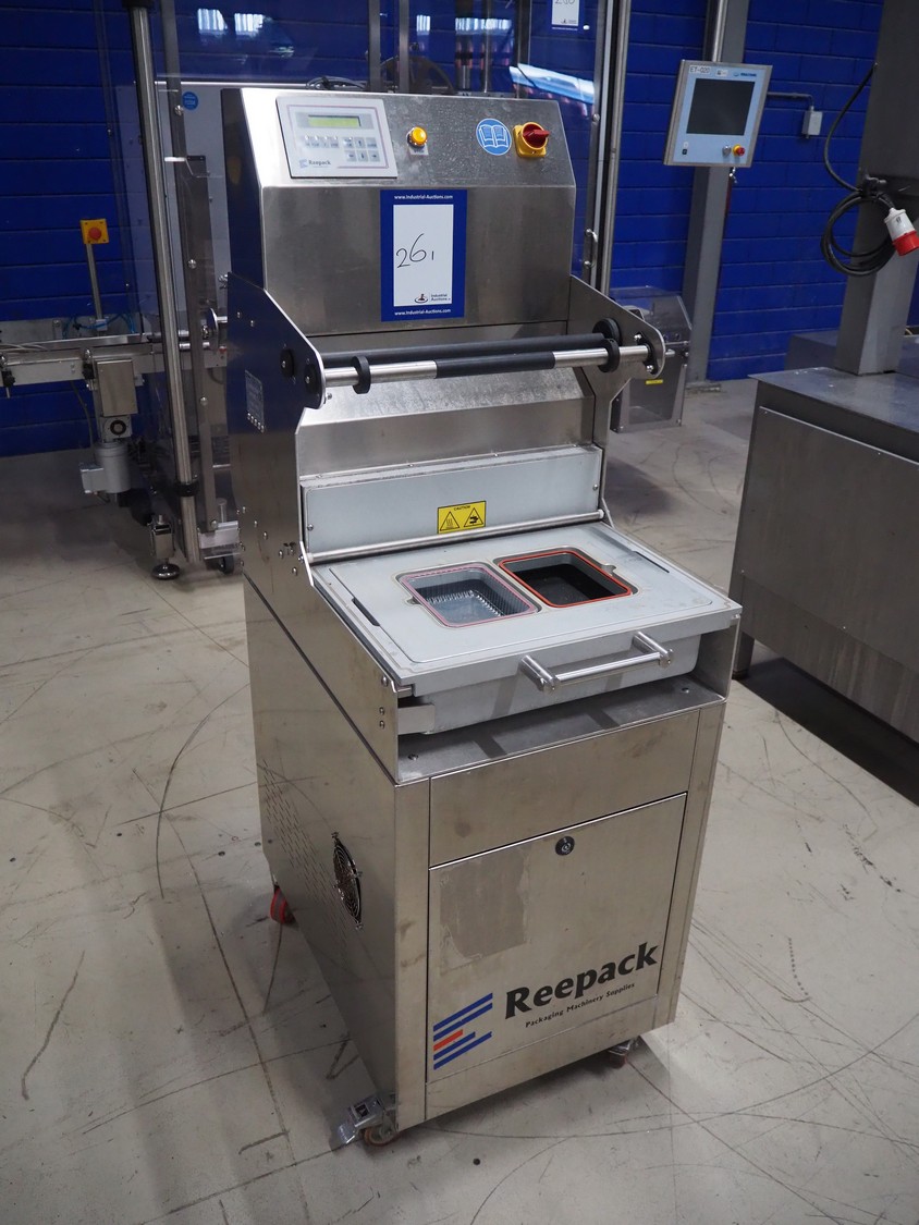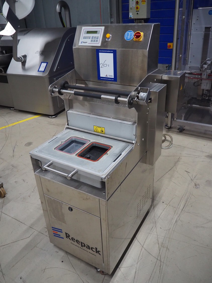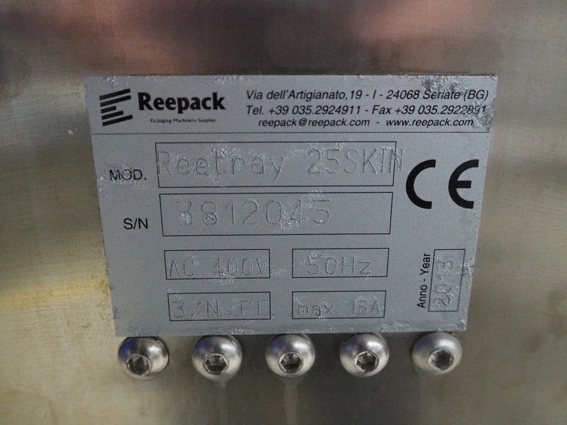 Reepack mobile traysealer, model: Reetray 25SKIN, serial number: 3812045, year of construction: 2013, 400 V, 3 Ph, 50 Hz, 16 A, dye: (2x) 175 mm x 130 mm, Busch vacuum pump, type: RA 0040 F 4S3, capacity: 40 m³ per hour, total dimensions: 1050 mm x 700 mm x 1600 mm.