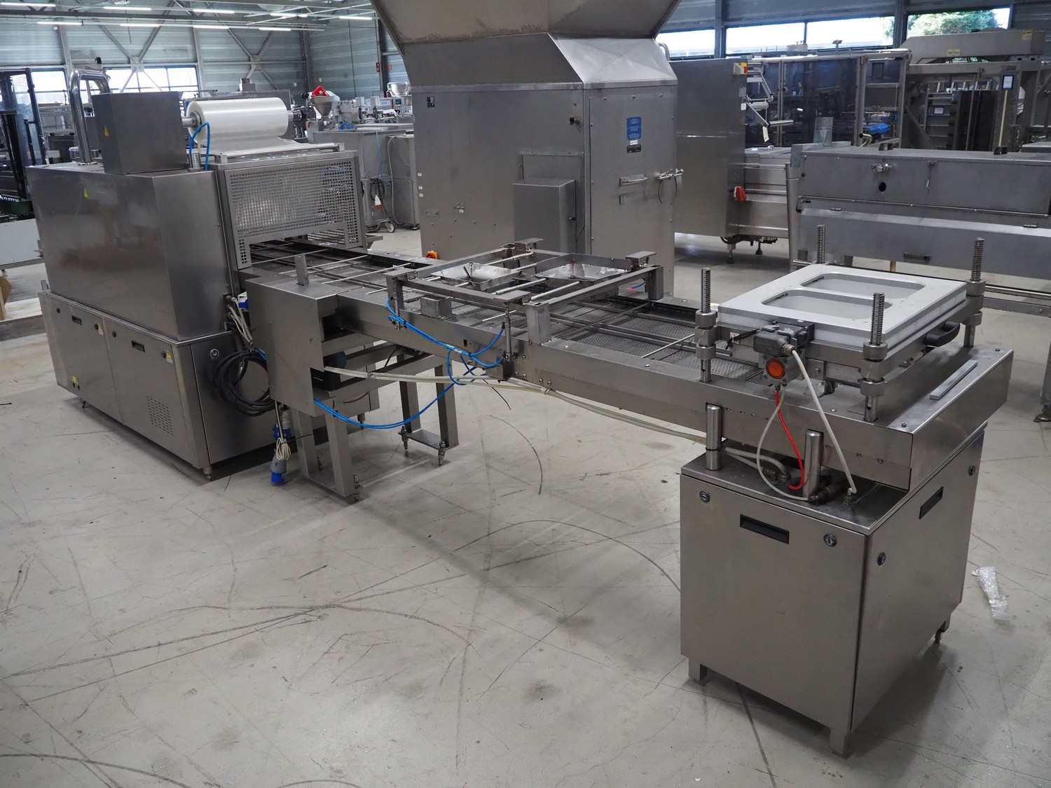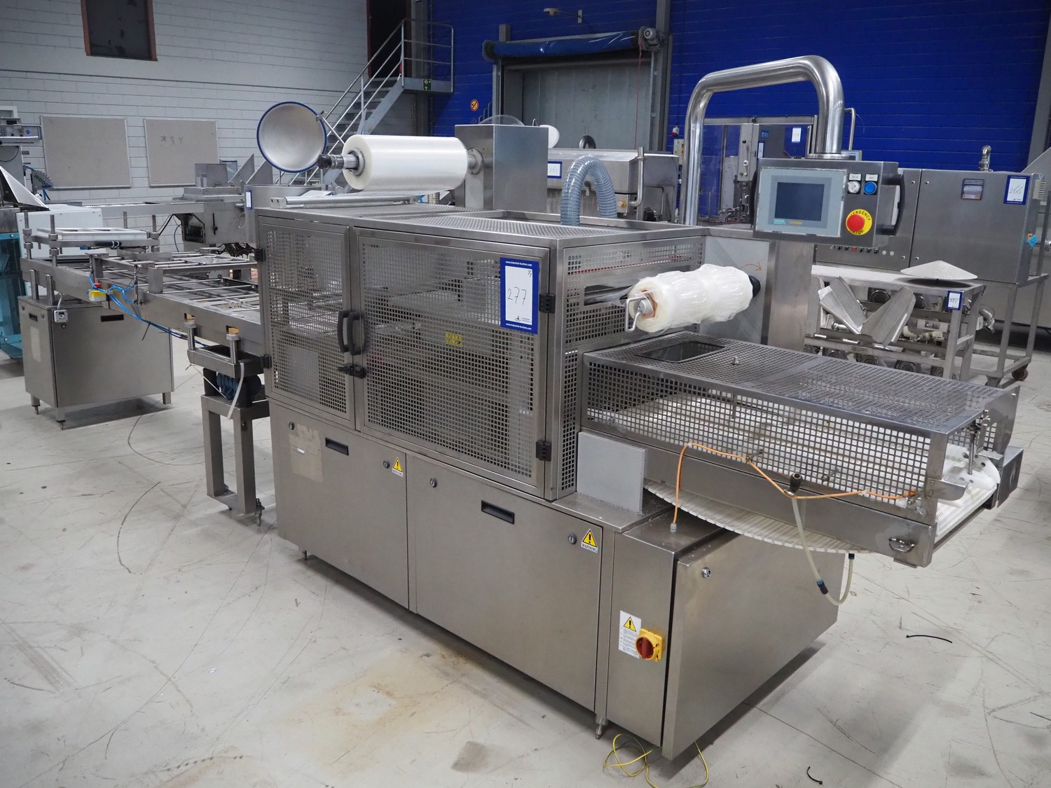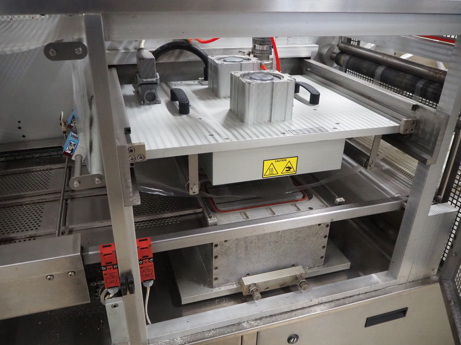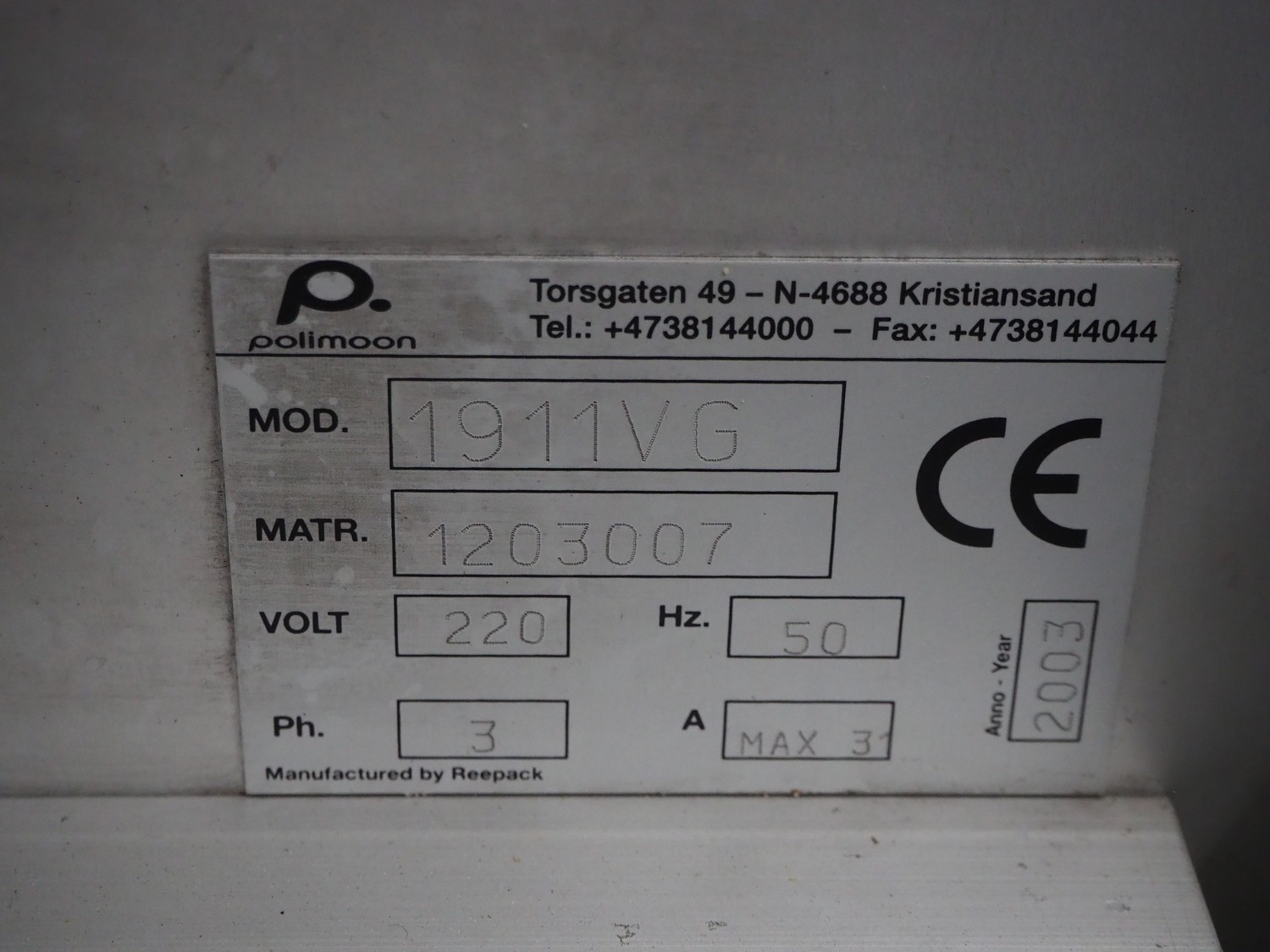Polimoon traysealer, model: 1911VG, serial number: 1203007, year of construction: 2003, 220 V, 3 Ph, 50 Hz, 31 A, dye: (2x) 250 mm x 150 mm, film width: 430 mm, total dimensions: 5550 mm x 1000 mm x 1900 mm.