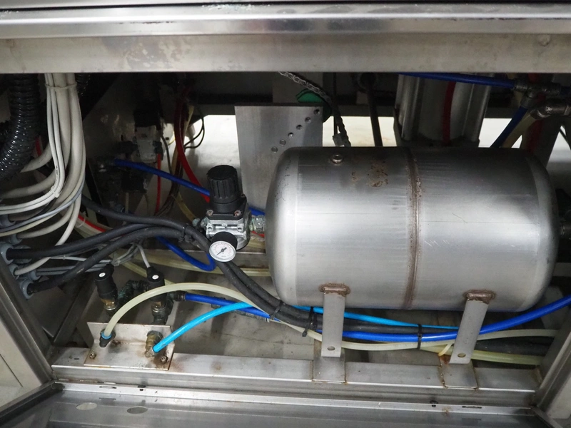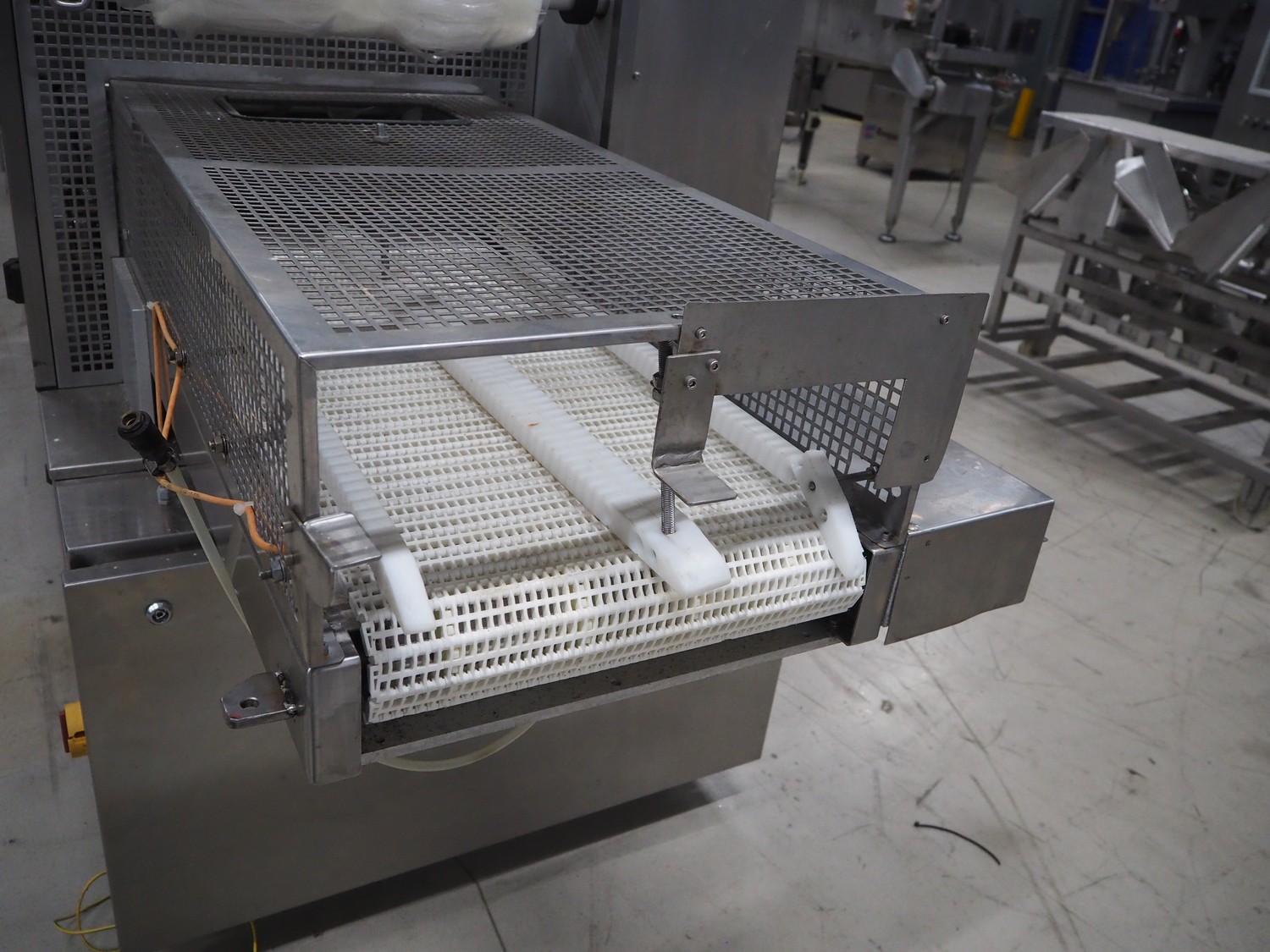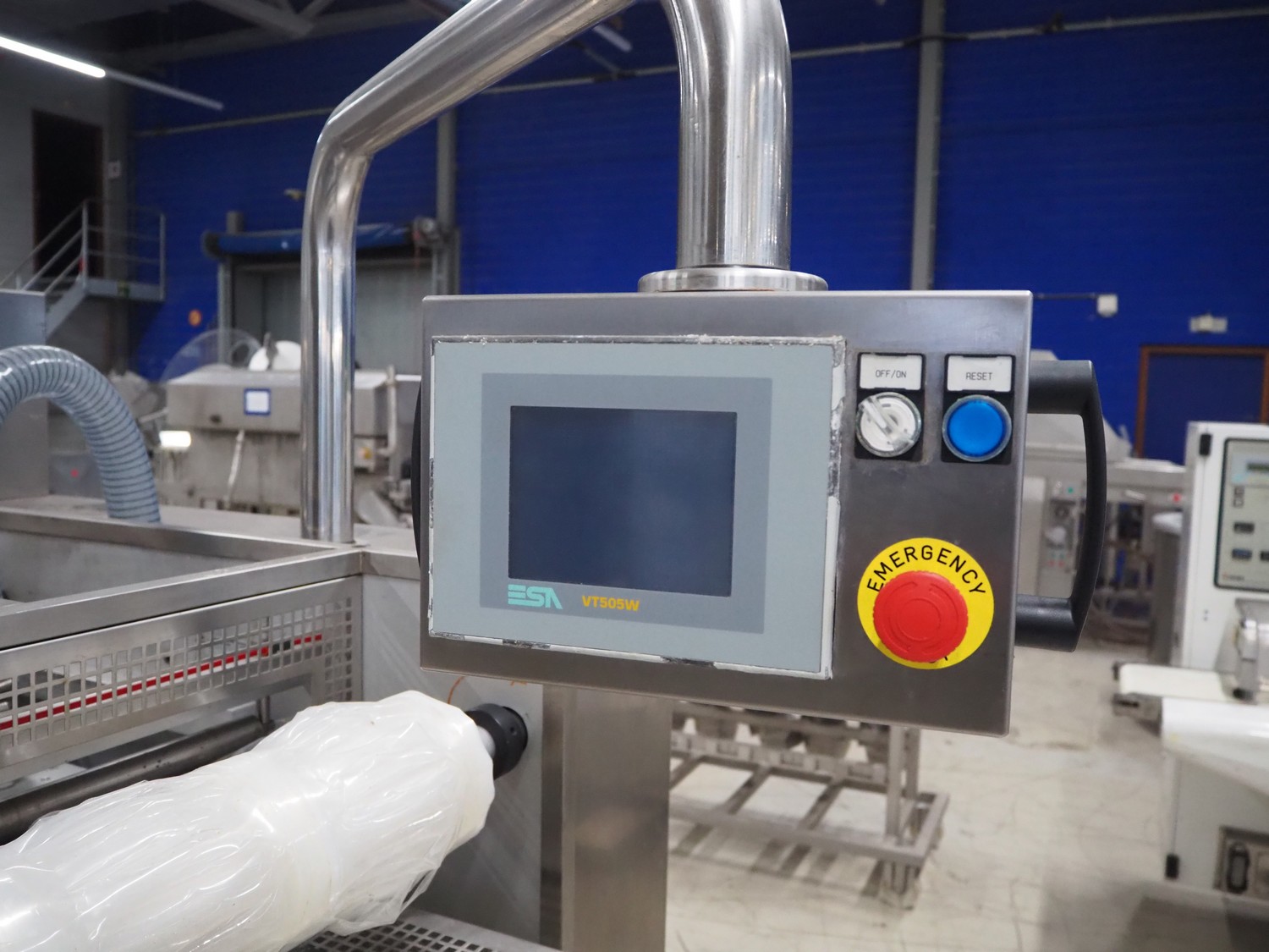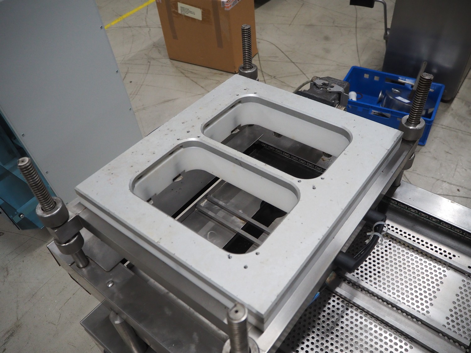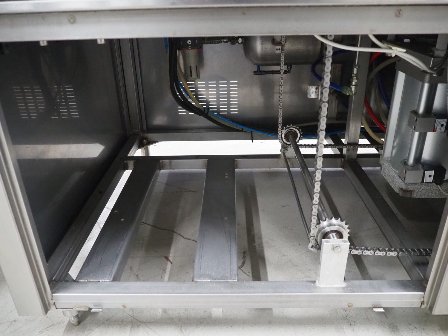 Polimoon traysealer, model: 1911VG, serial number: 1203007, year of construction: 2003, 220 V, 3 Ph, 50 Hz, 31 A, dye: (2x) 250 mm x 150 mm, film width: 430 mm, total dimensions: 5550 mm x 1000 mm x 1900 mm.