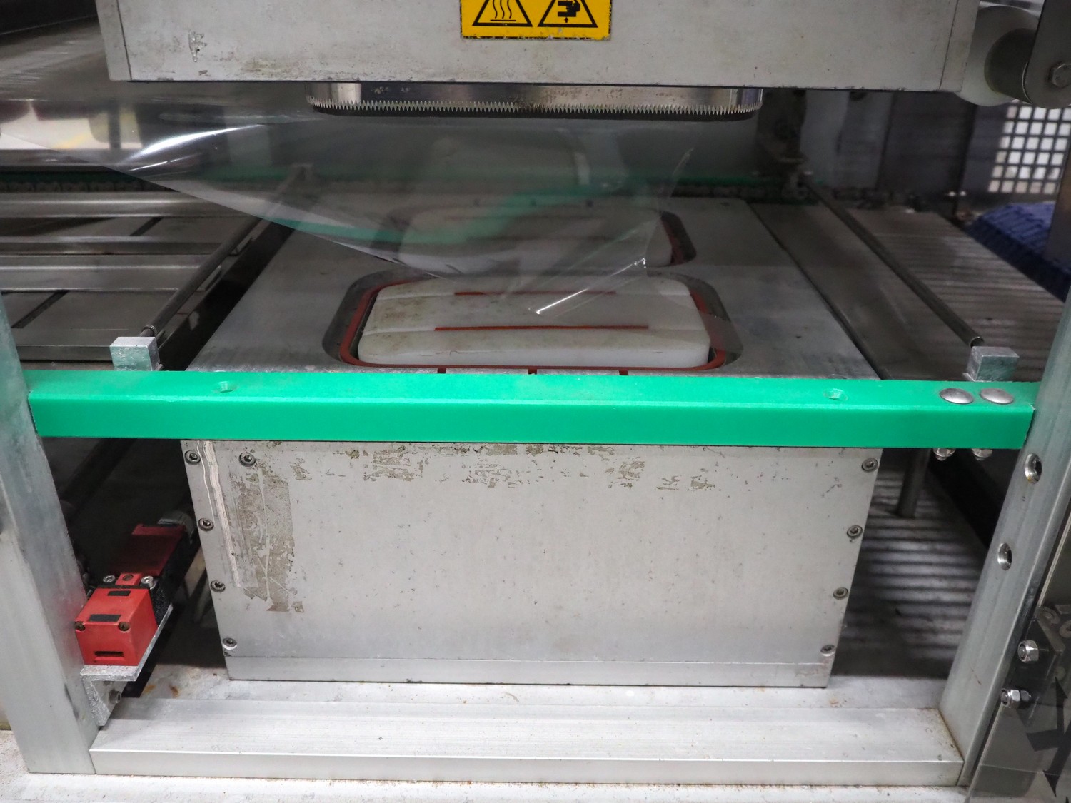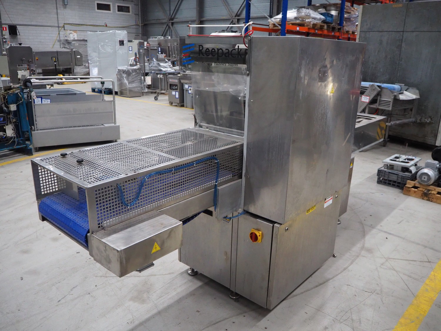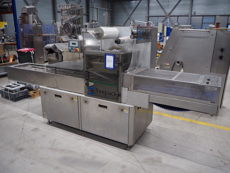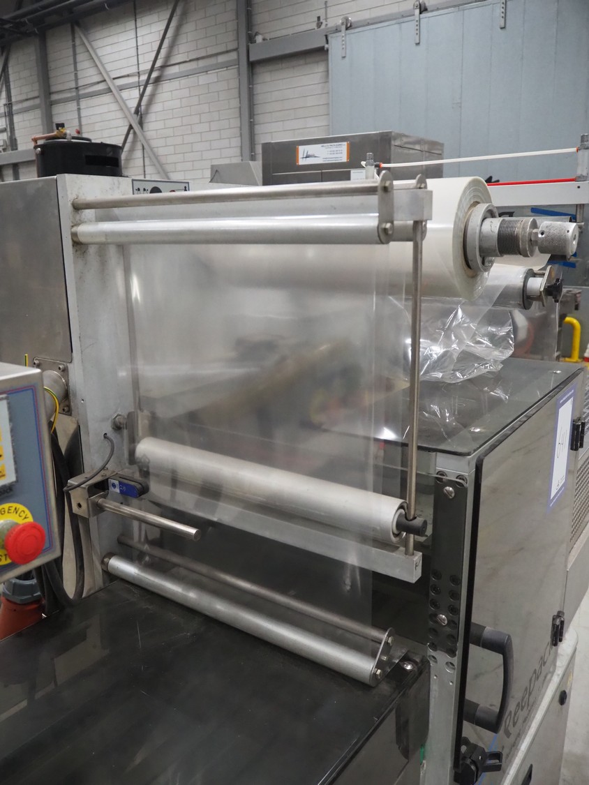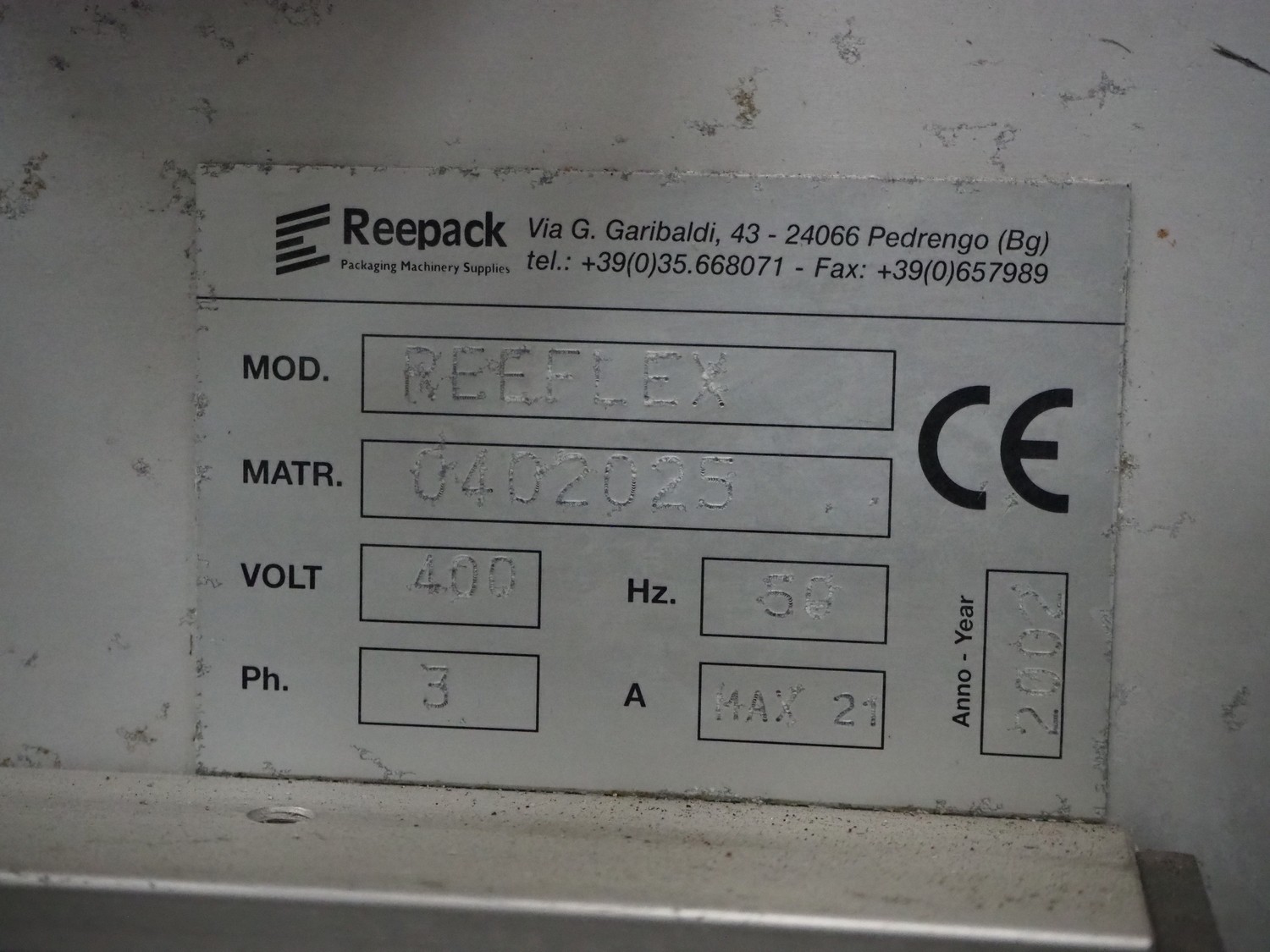 Reepack traysealer, model: Reeflex, serial number: 0402025, year of construction: 2002, 400 V, 3 Ph, 50 Hz, 21 A, s/s chain and pin conveyor, belt width: 360 mm, distance between dividers: 440 mm, divider height: 20 mm, 2 lanes, lane width: 140 mm, film width: 400 mm, dimensions dyes: (2x) 220 mm x 140 mm, plastic outfeed belt, belt width: 420 mm, total dimensions: 3550 mm x 900 mm x 1750 mm. With additional dye, dimensions dye: (2x) 220 mm x 140 mm, and Busch vacuum pump, type: RA 0100 E 503, number: 03018852.