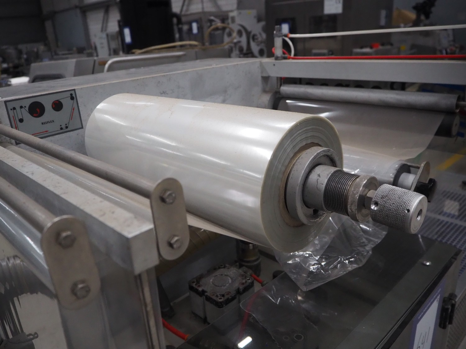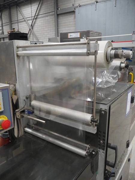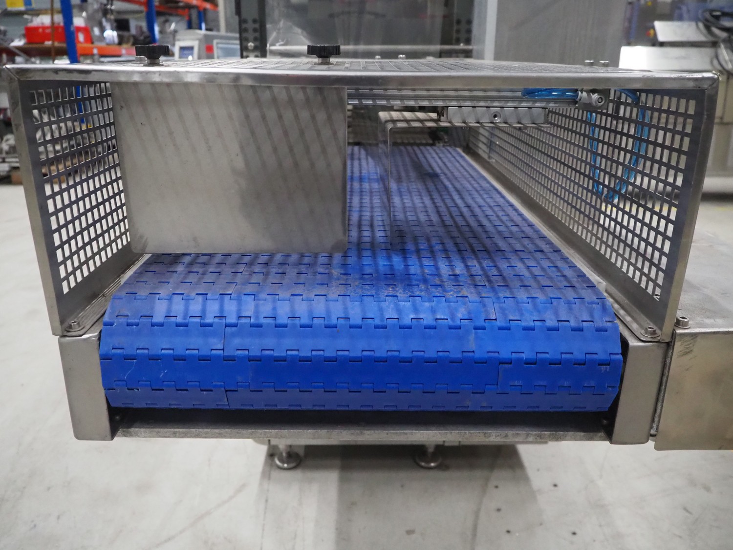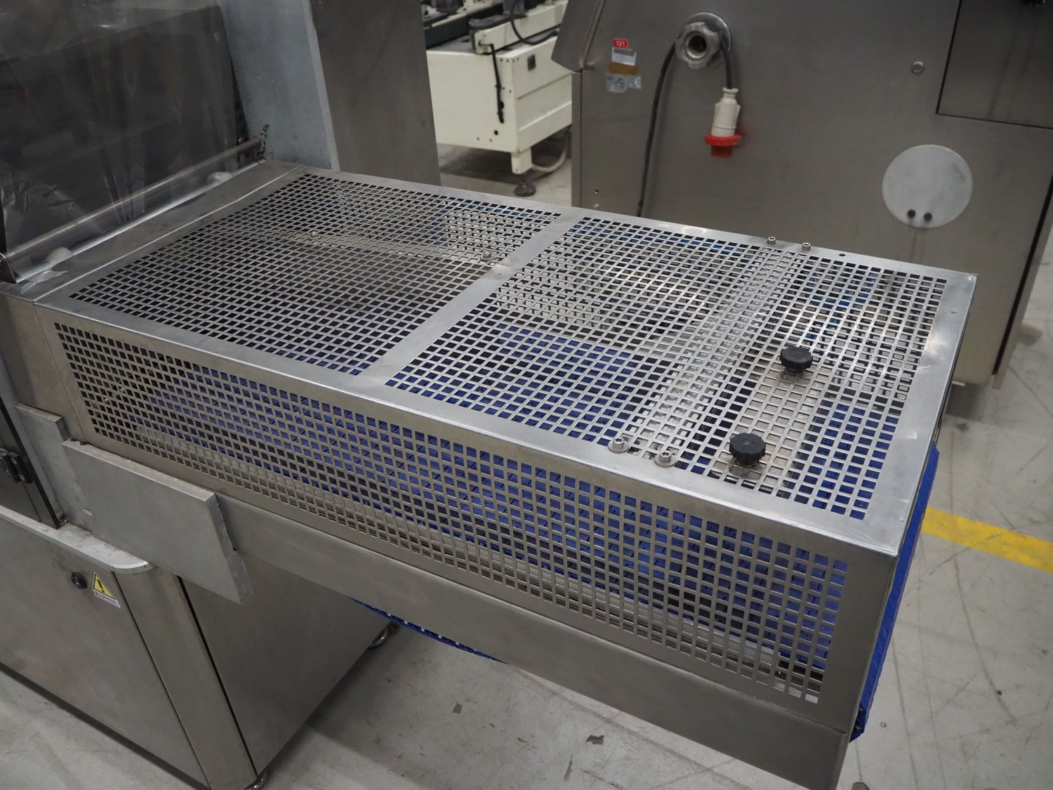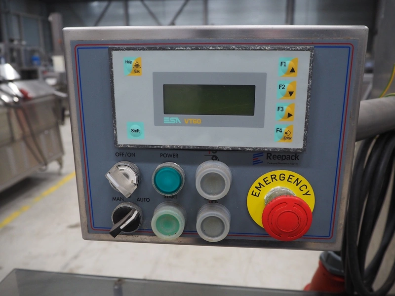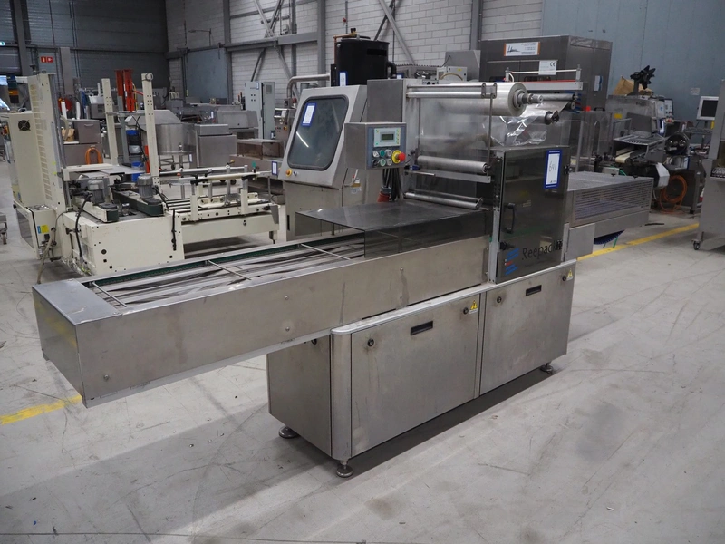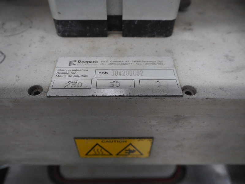 Reepack traysealer, model: Reeflex, serial number: 0402025, year of construction: 2002, 400 V, 3 Ph, 50 Hz, 21 A, s/s chain and pin conveyor, belt width: 360 mm, distance between dividers: 440 mm, divider height: 20 mm, 2 lanes, lane width: 140 mm, film width: 400 mm, dimensions dyes: (2x) 220 mm x 140 mm, plastic outfeed belt, belt width: 420 mm, total dimensions: 3550 mm x 900 mm x 1750 mm. With additional dye, dimensions dye: (2x) 220 mm x 140 mm, and Busch vacuum pump, type: RA 0100 E 503, number: 03018852.