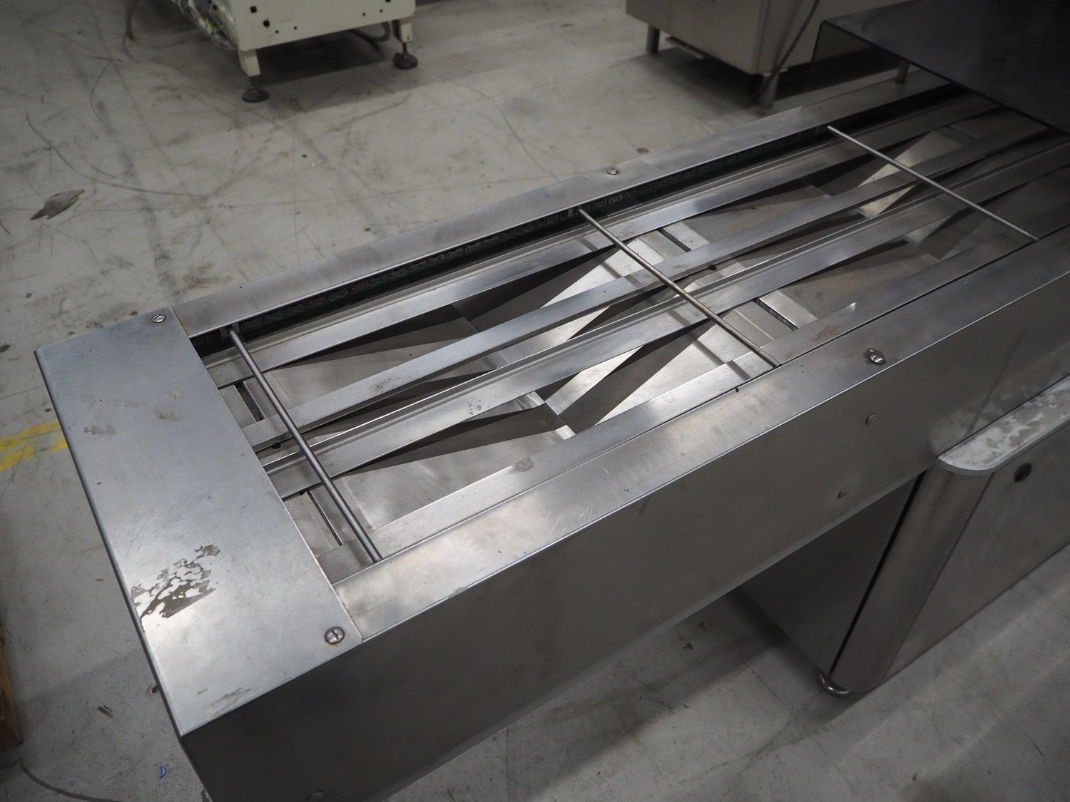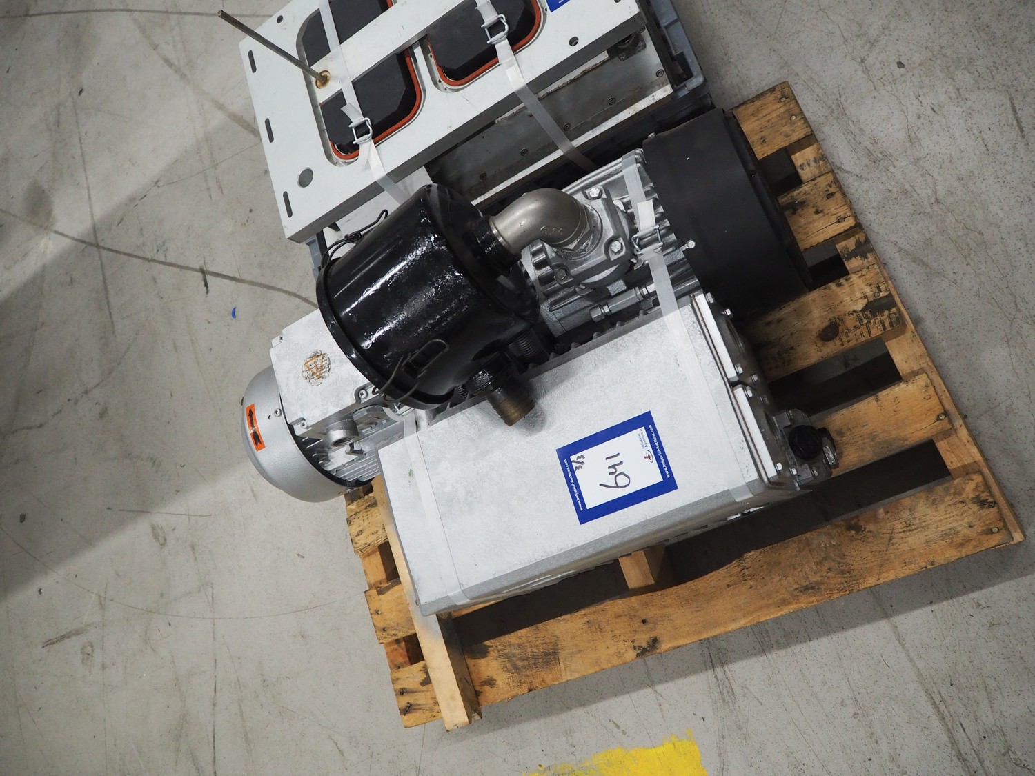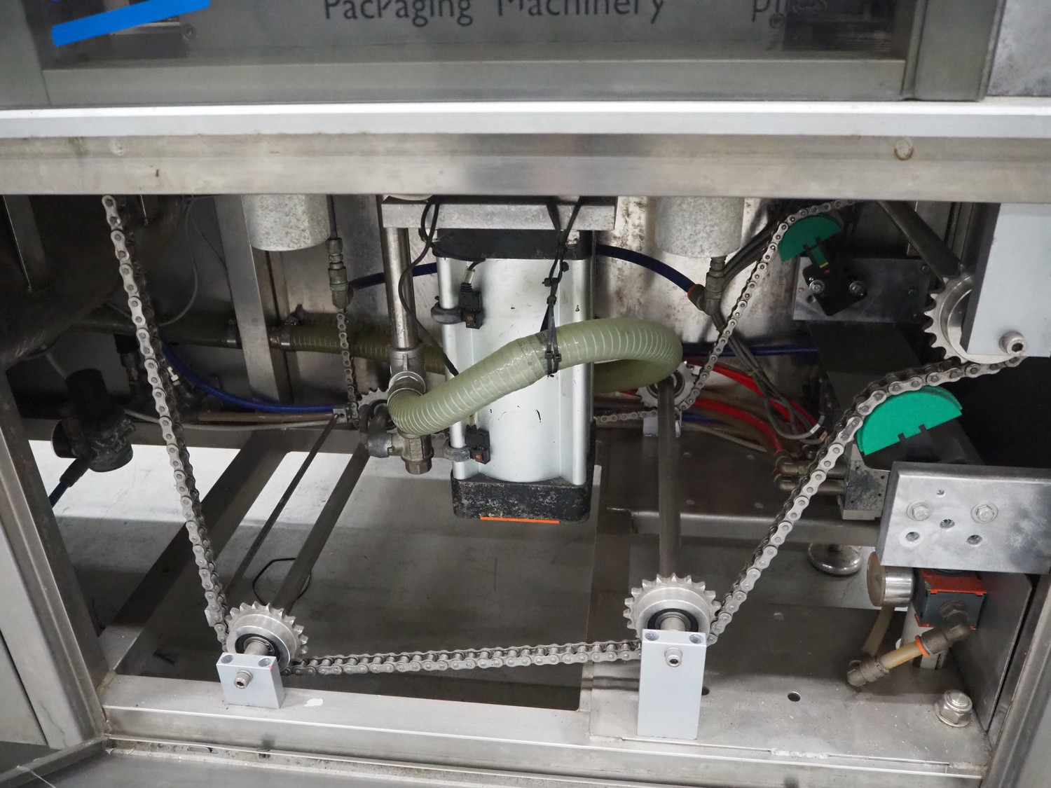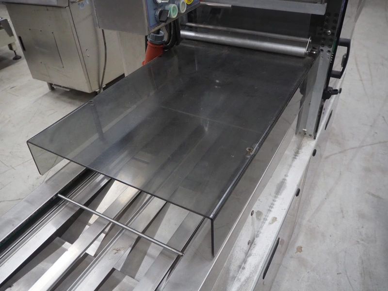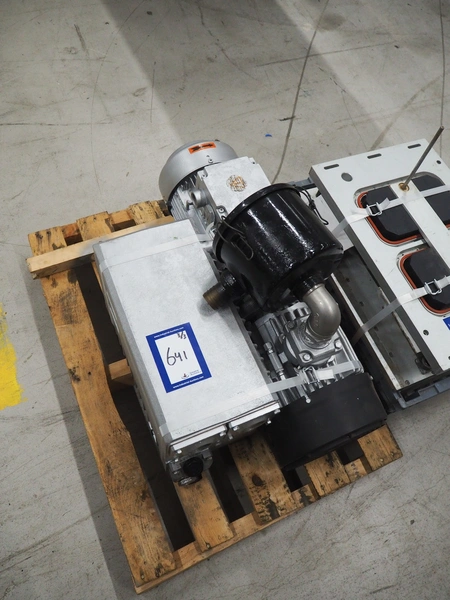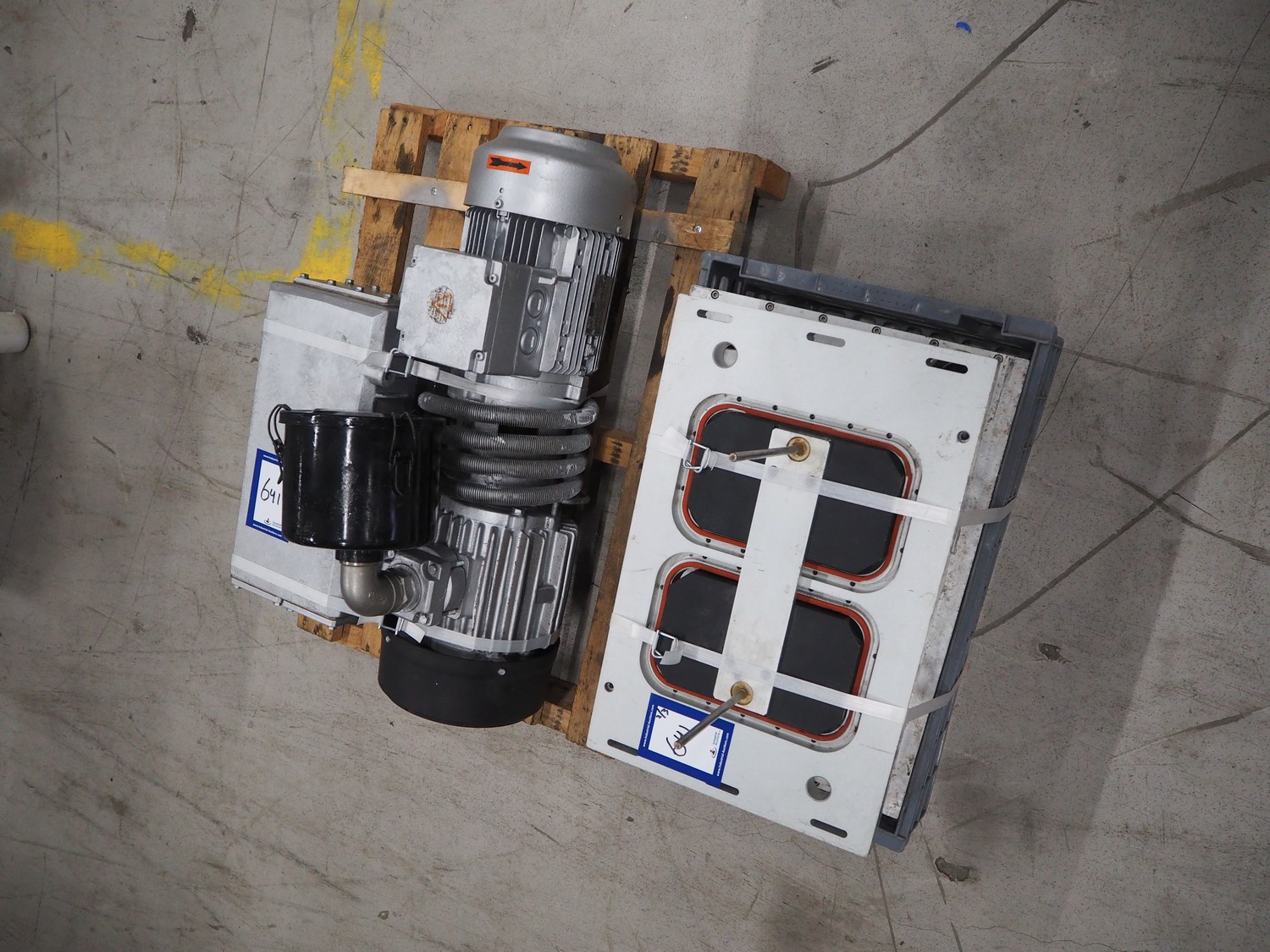 Reepack traysealer, model: Reeflex, serial number: 0402025, year of construction: 2002, 400 V, 3 Ph, 50 Hz, 21 A, s/s chain and pin conveyor, belt width: 360 mm, distance between dividers: 440 mm, divider height: 20 mm, 2 lanes, lane width: 140 mm, film width: 400 mm, dimensions dyes: (2x) 220 mm x 140 mm, plastic outfeed belt, belt width: 420 mm, total dimensions: 3550 mm x 900 mm x 1750 mm. With additional dye, dimensions dye: (2x) 220 mm x 140 mm, and Busch vacuum pump, type: RA 0100 E 503, number: 03018852.