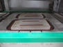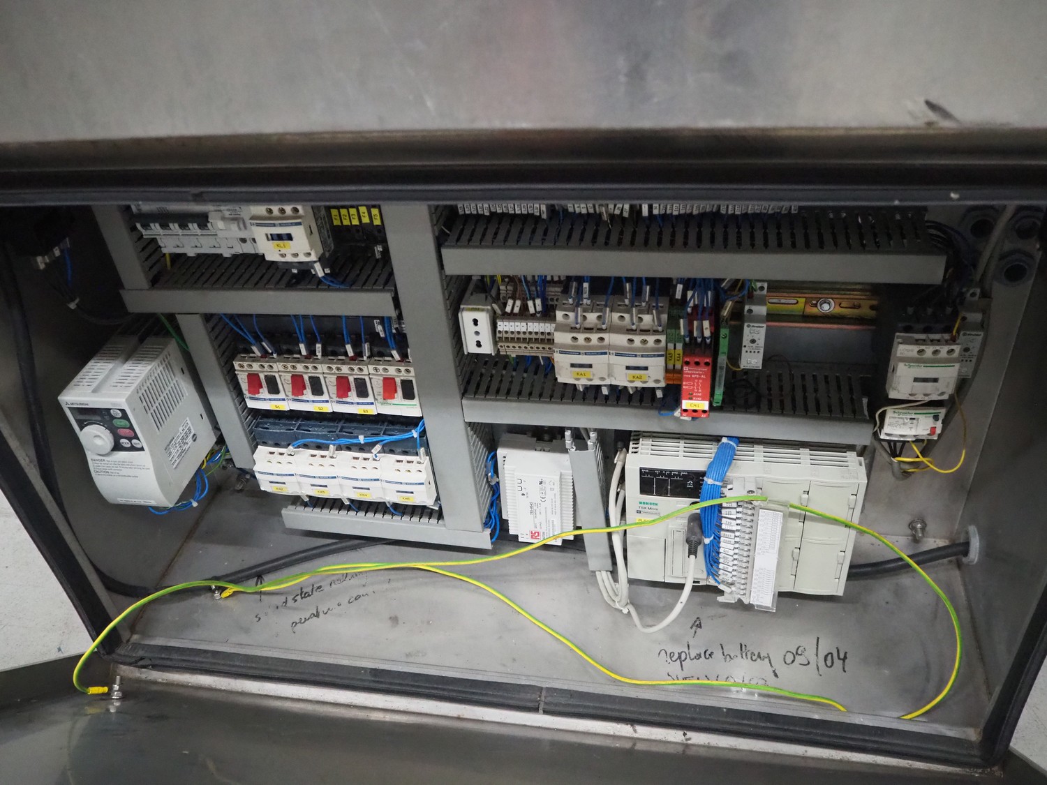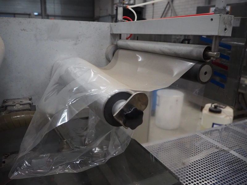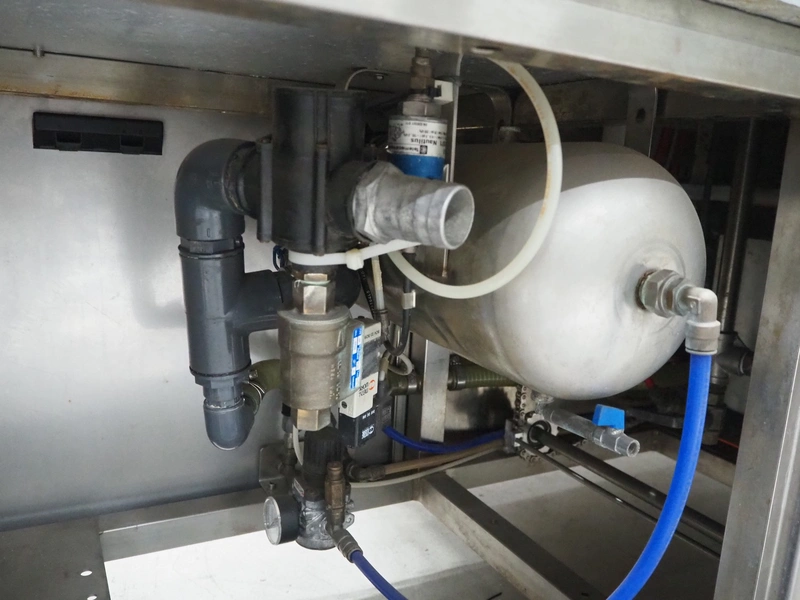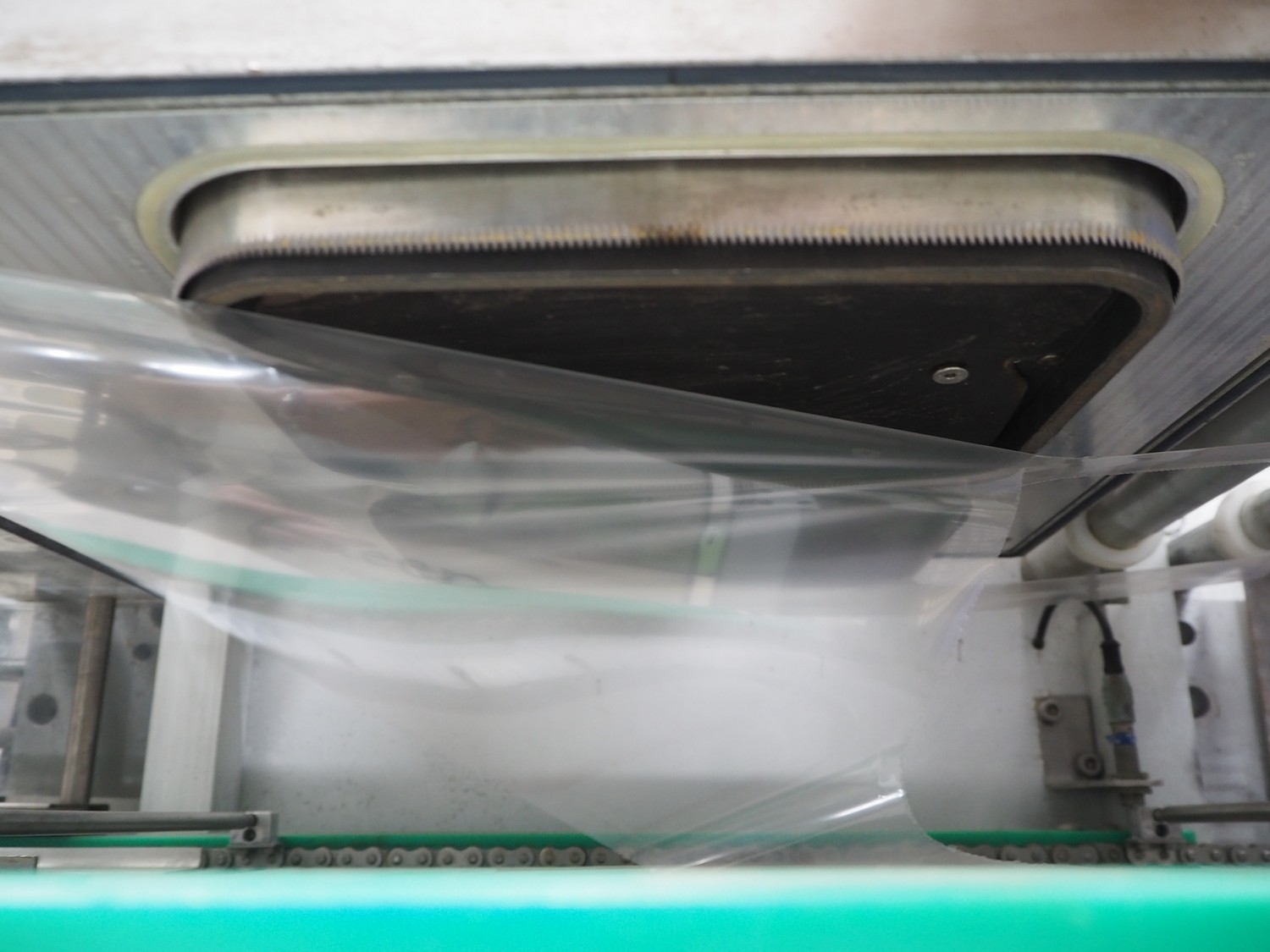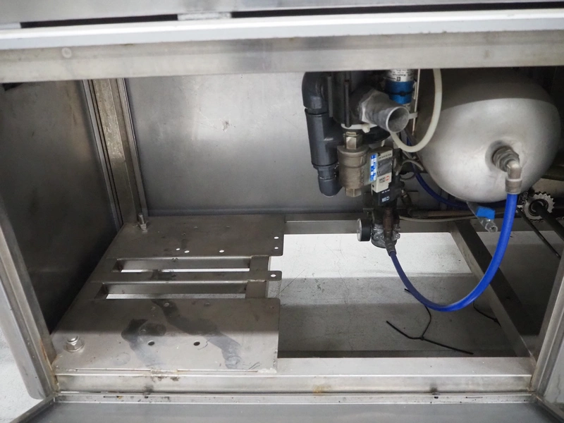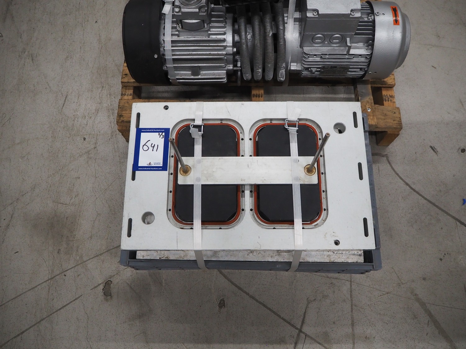 Reepack traysealer, model: Reeflex, serial number: 0402025, year of construction: 2002, 400 V, 3 Ph, 50 Hz, 21 A, s/s chain and pin conveyor, belt width: 360 mm, distance between dividers: 440 mm, divider height: 20 mm, 2 lanes, lane width: 140 mm, film width: 400 mm, dimensions dyes: (2x) 220 mm x 140 mm, plastic outfeed belt, belt width: 420 mm, total dimensions: 3550 mm x 900 mm x 1750 mm. With additional dye, dimensions dye: (2x) 220 mm x 140 mm, and Busch vacuum pump, type: RA 0100 E 503, number: 03018852.