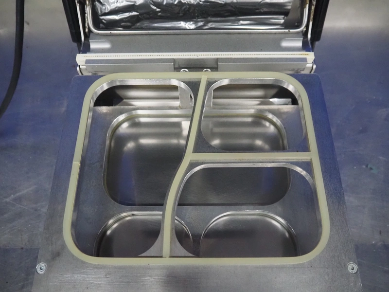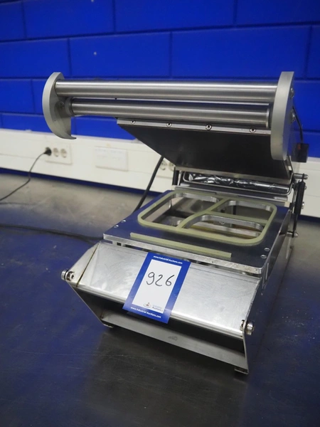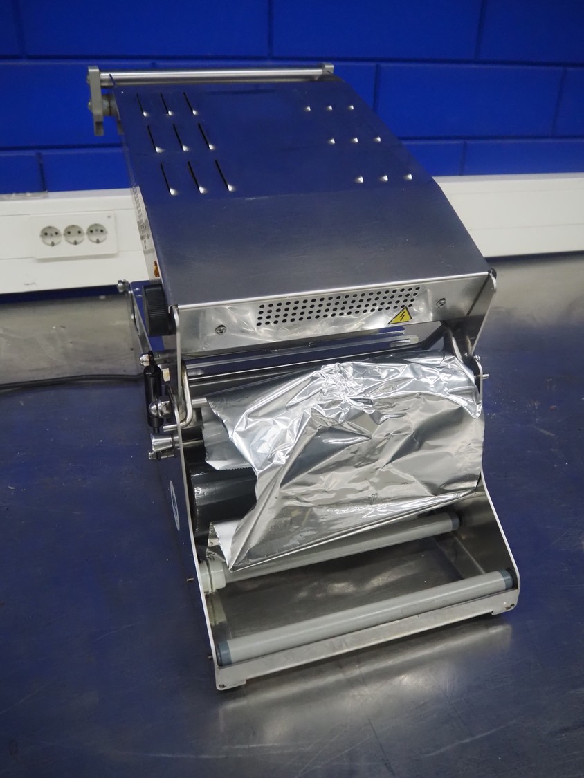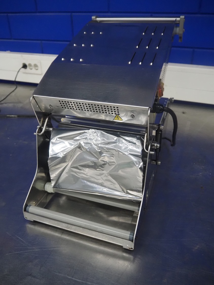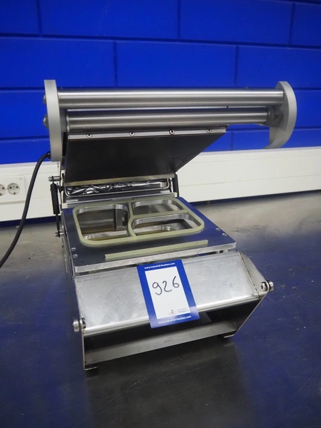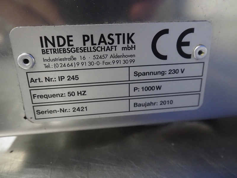 Inde Plastik traysealer, article number: IP 245, serial number: 2421, year of construction: 2010, 230 V, 50 Hz, 1000 W, dimensions dye: (2x) 105 mm x 105 mm and (1x) 225 mm x 125 mm, film width: 245 mm, total dimensions: 700 mm x 340 mm x 320 mm.